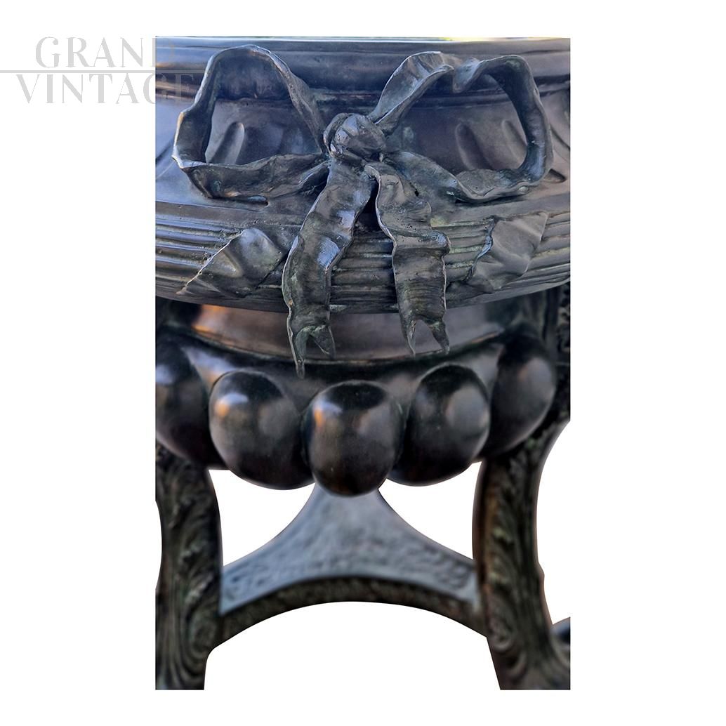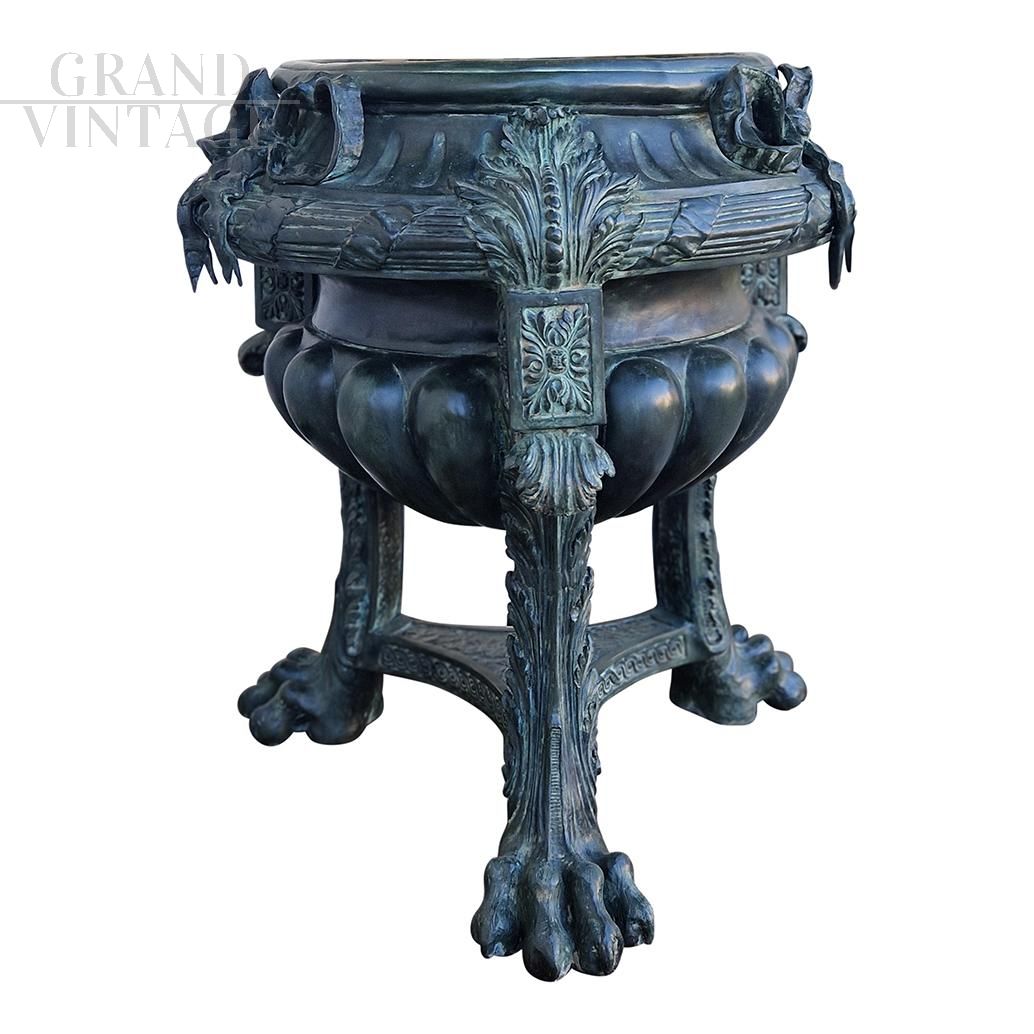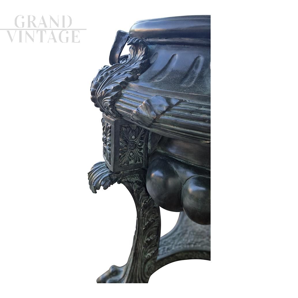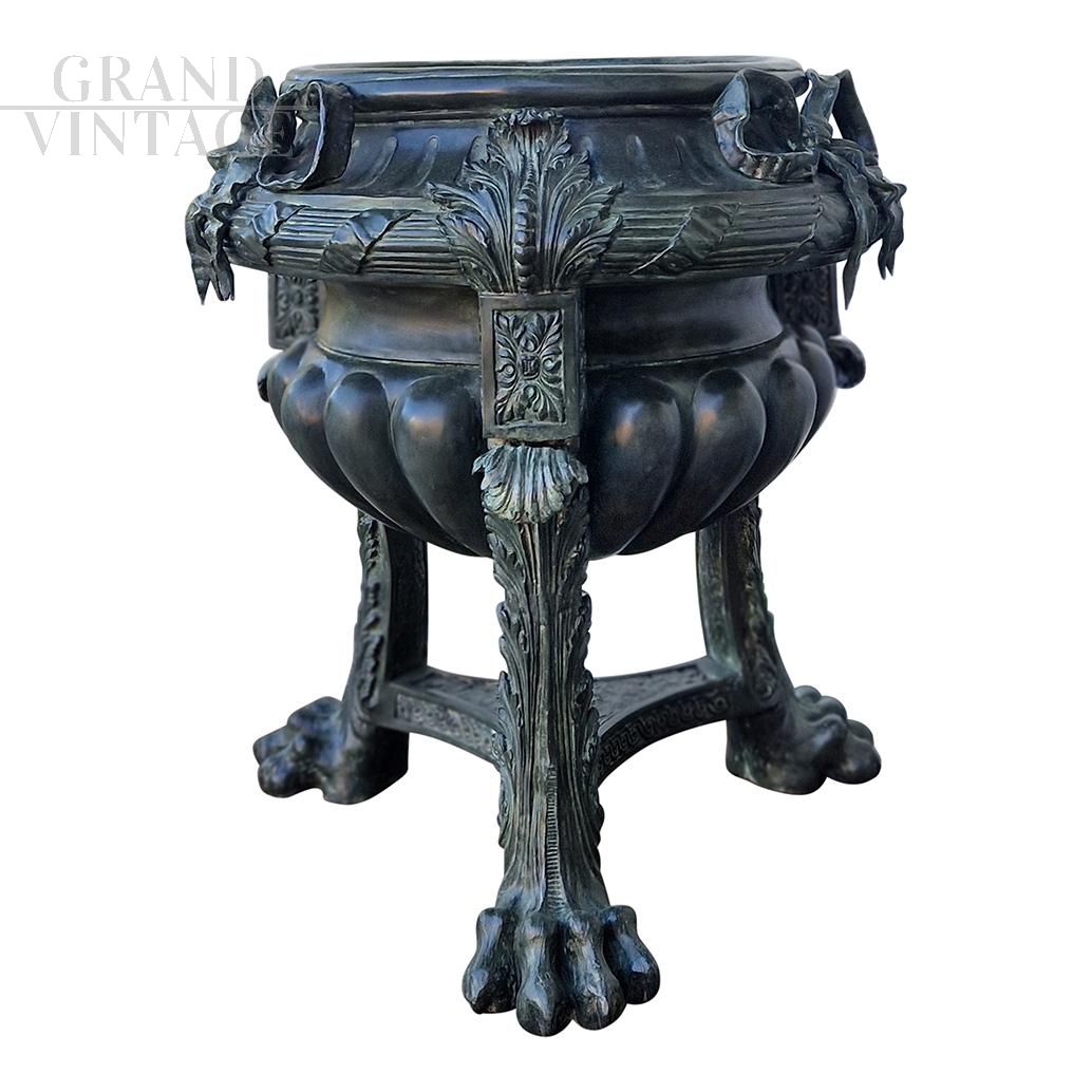 Very elegant pair of large bronze vases in antique Empire style worked with ribbon decorations and resting on lion's paws. E-0063