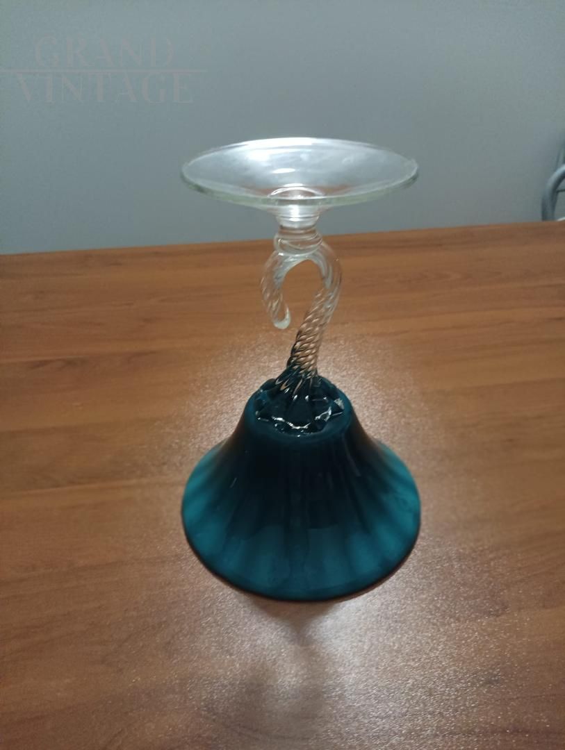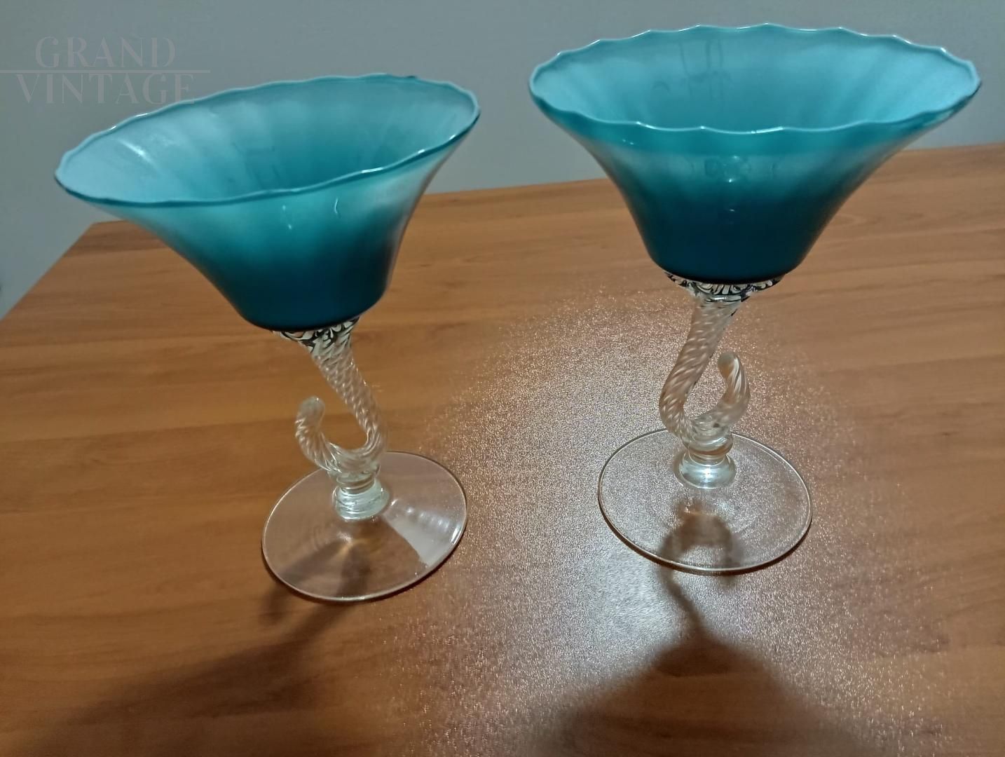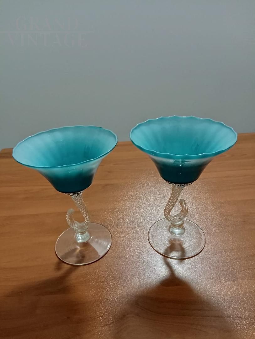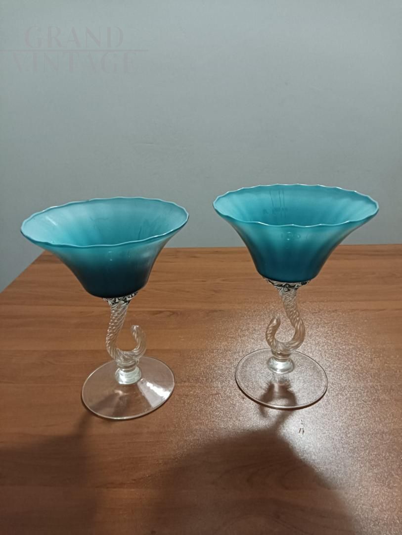 Splendid pair of chalice bombonière vases from Empoli "Florence - Italy" in light blue opaline glass with finely worked hooked stem, Italy 1960s.