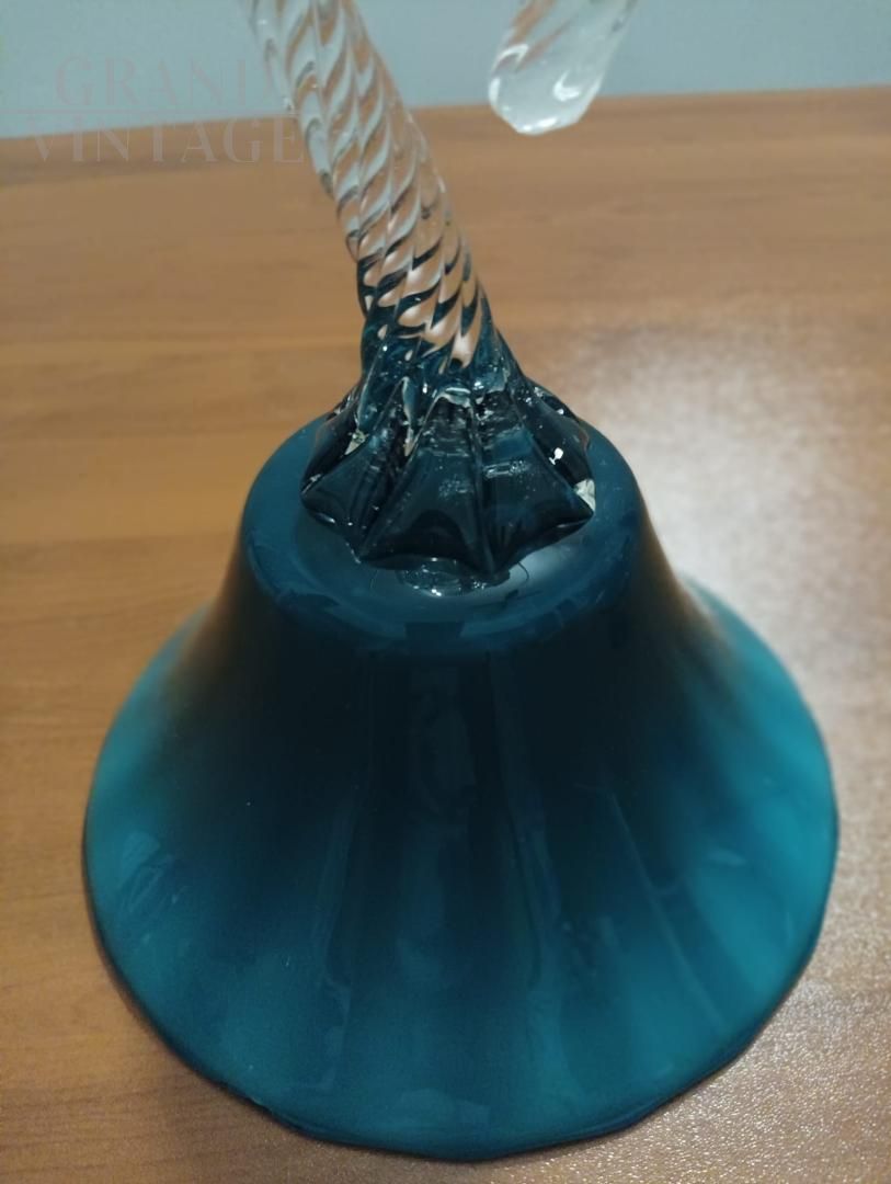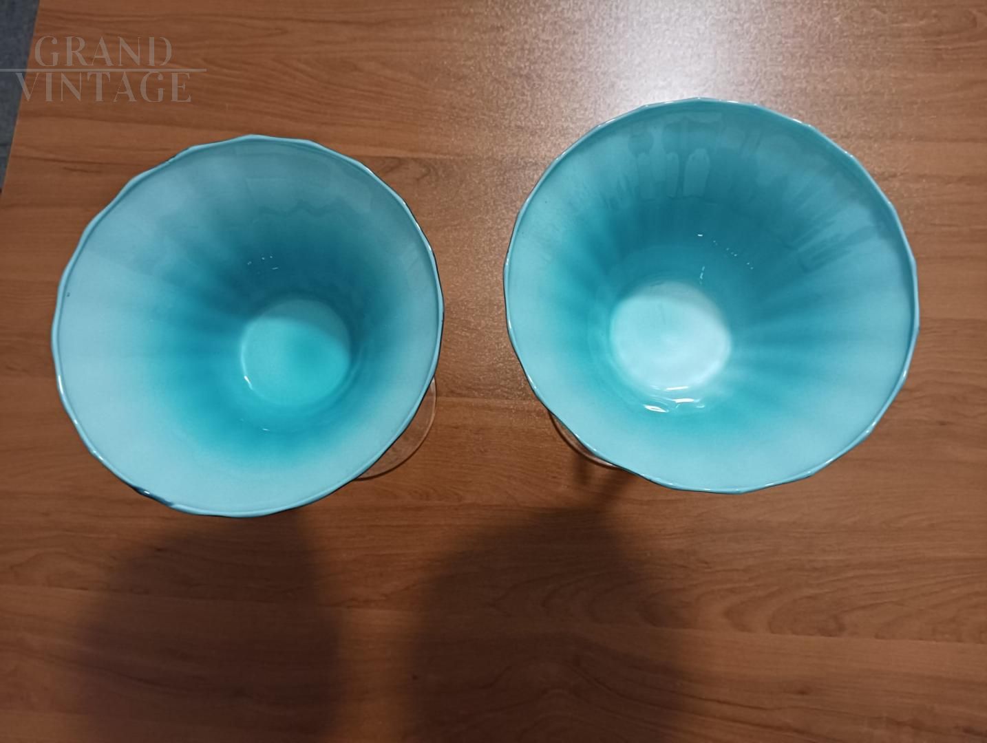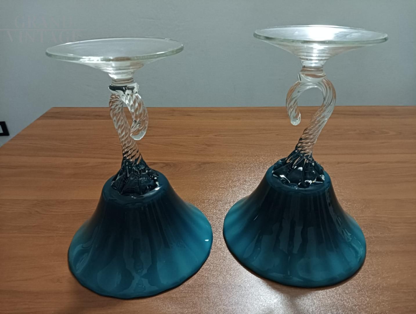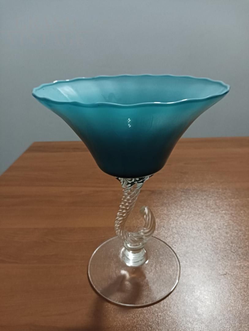 Splendid pair of chalice bombonière vases from Empoli "Florence - Italy" in light blue opaline glass with finely worked hooked stem, Italy 1960s.