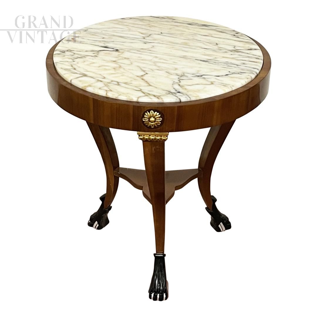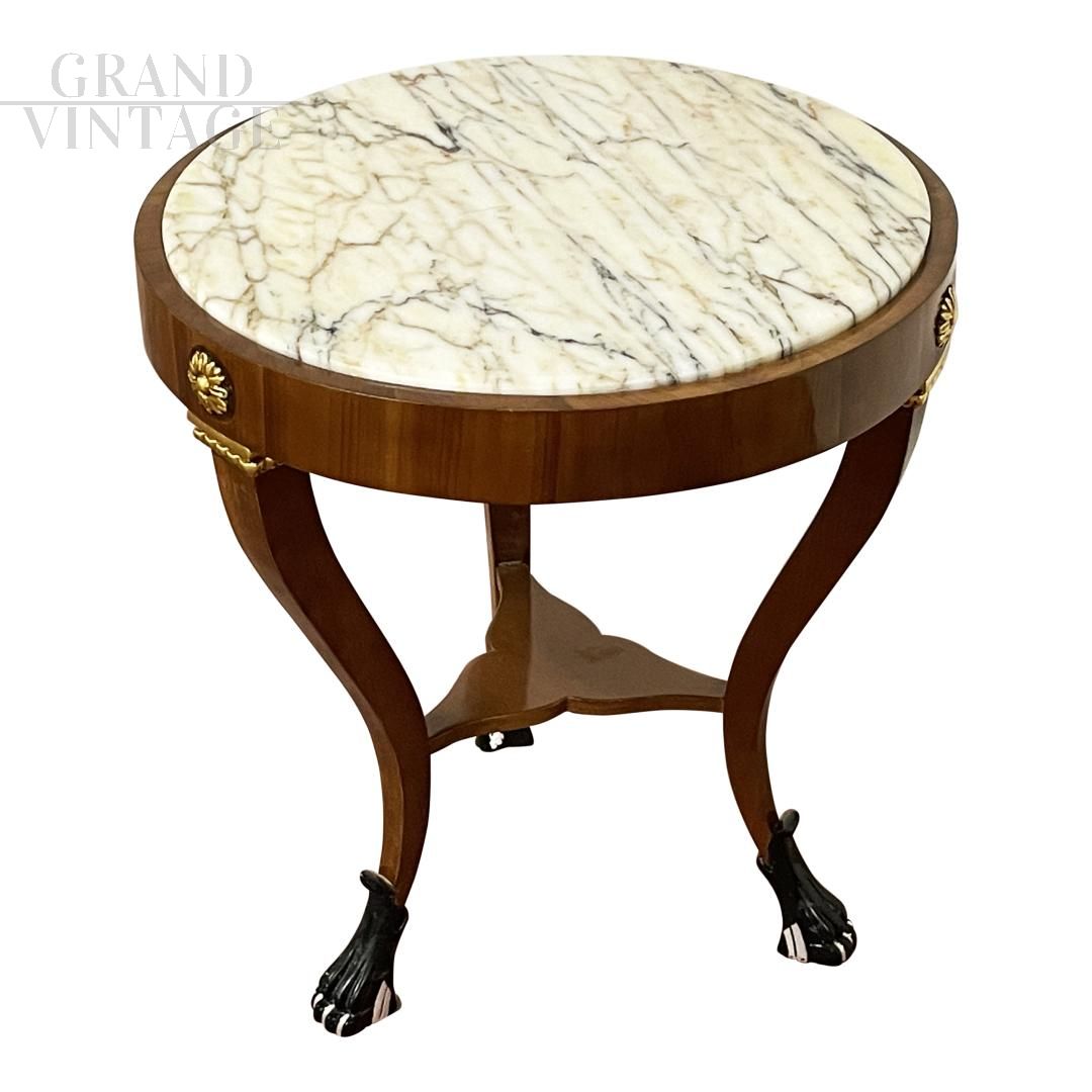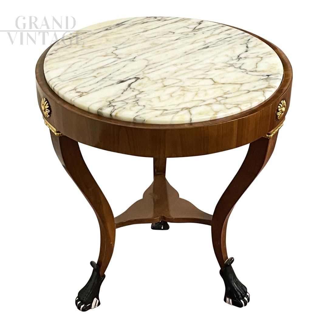 Pair of French antique style coffee tables with walnut structure with golden decorations and white veined marble top. France, late 20th century.