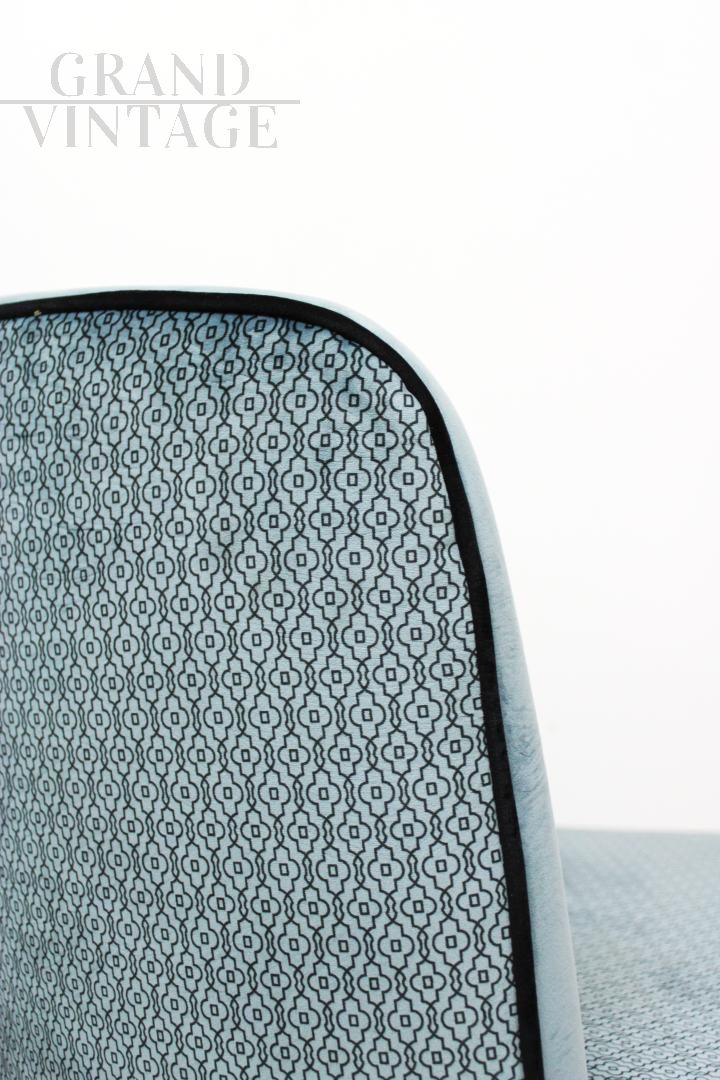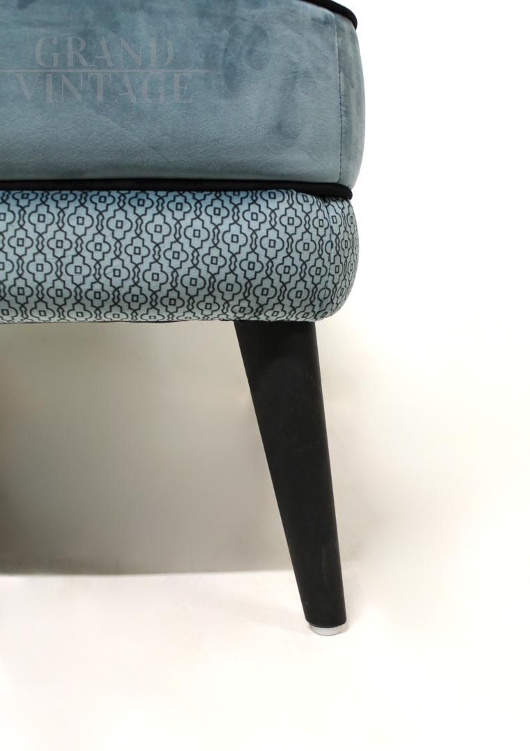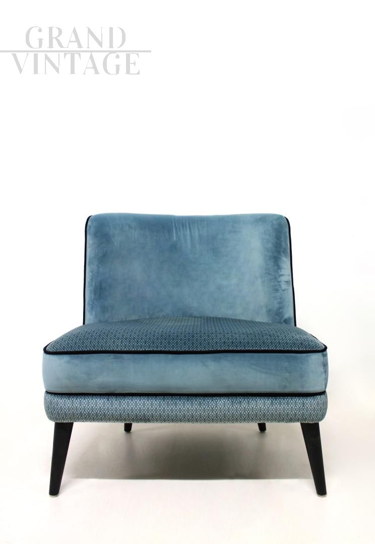 Particular pair of French vintage style armchairs, wide and without armrests, entirely in blue patterned velvet with black piping.