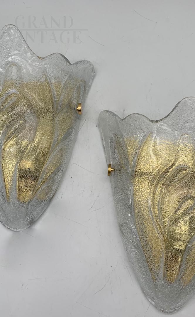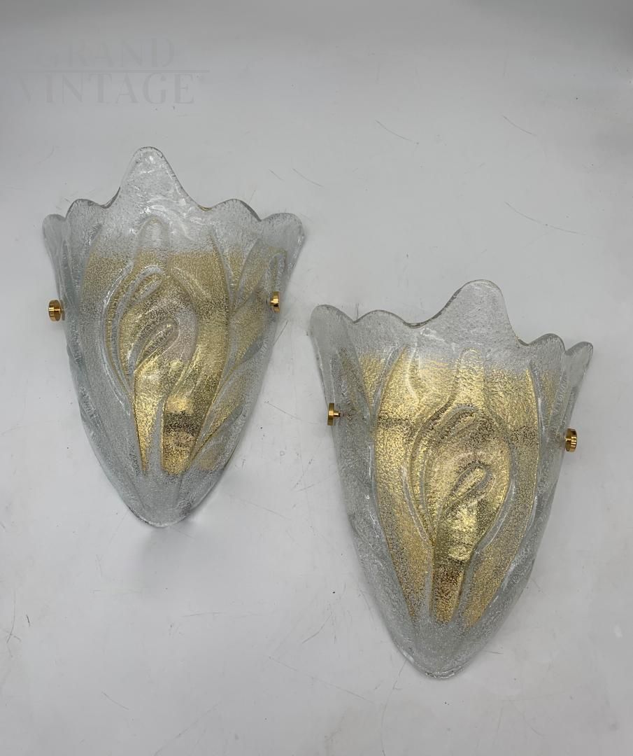 Fantastic pair of handcrafted appliques in transparent artistic Murano glass in the shape of a tulip with grit work on a golden brass structure. The lamp was born with the collaboration of the Murano masters. The glasses were handmade on a Murano mold in transparent color with glass grit inside, the golden effect is given by the brass structure underneath. The wall lights are made of 1 glass and were deliberately left open at the top to illuminate the ceiling. Each wall light has 1 socket for an E27 type bulb, LED bulbs are recommended. The glass will be dismantled from the structures and numbered to ensure safe transport and assembly.