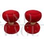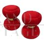 Elegant pair of round ottomans stools in red velvet in the shape of an hourglass with central band in golden metal. Comfortable padding.