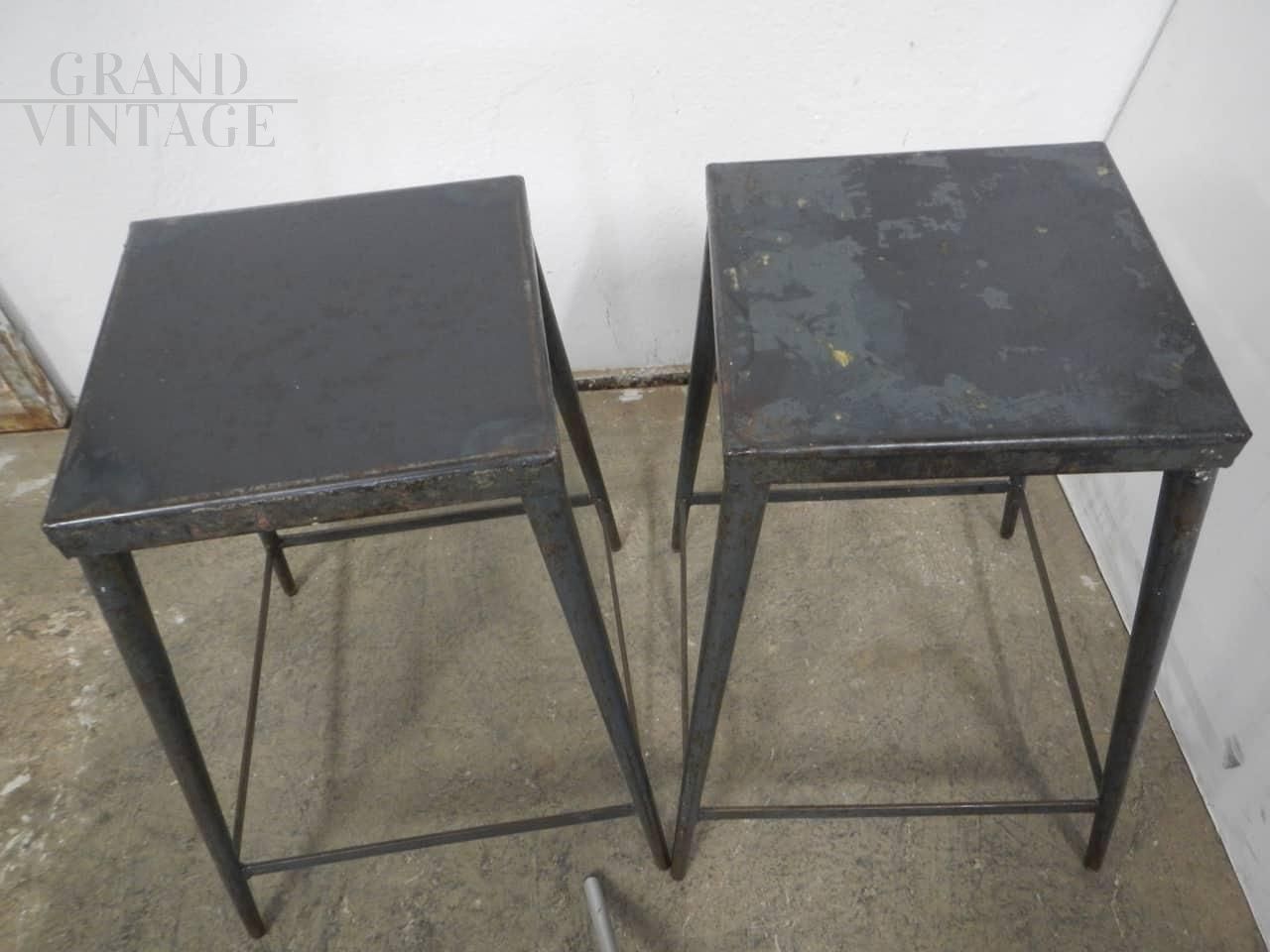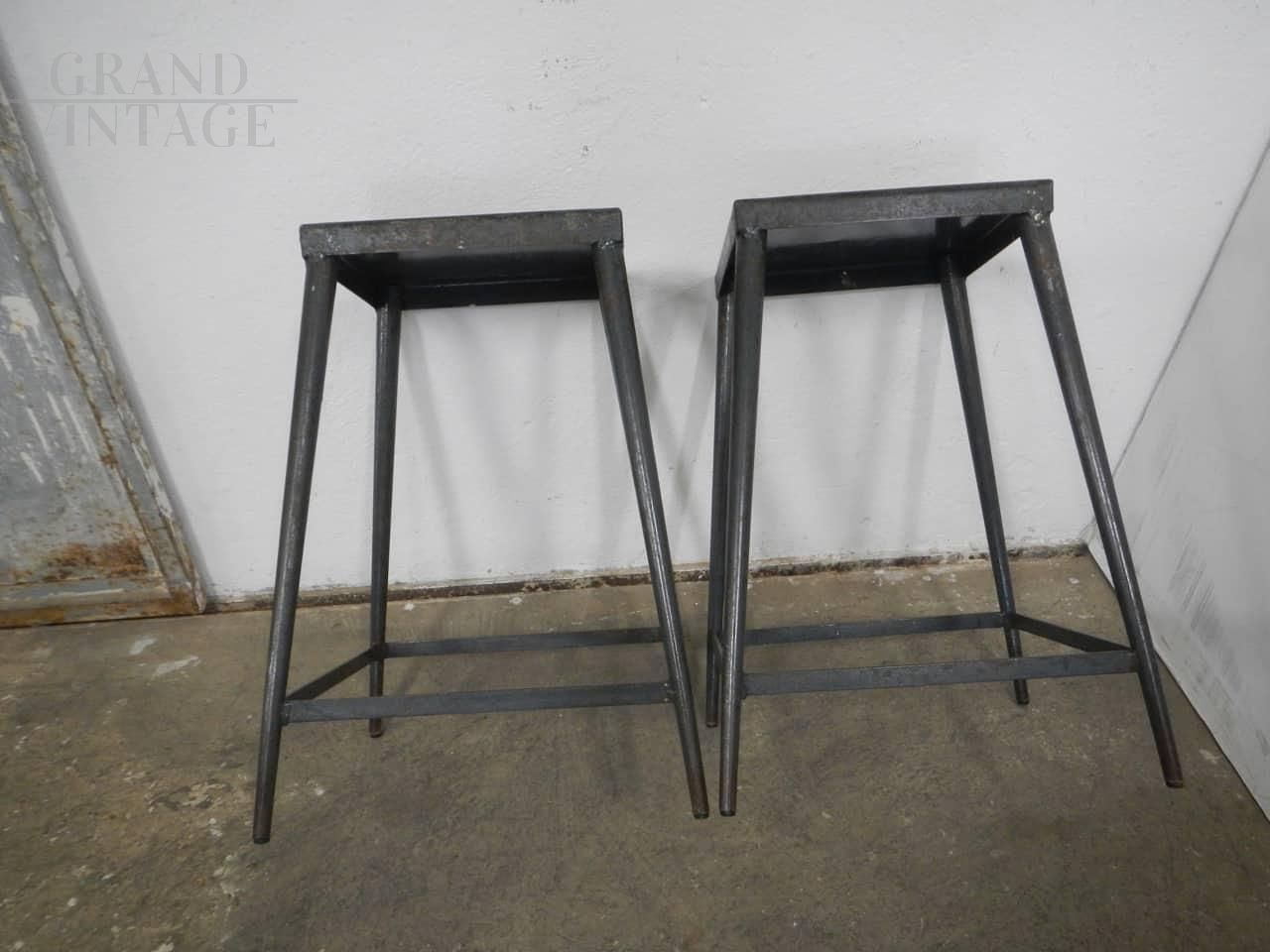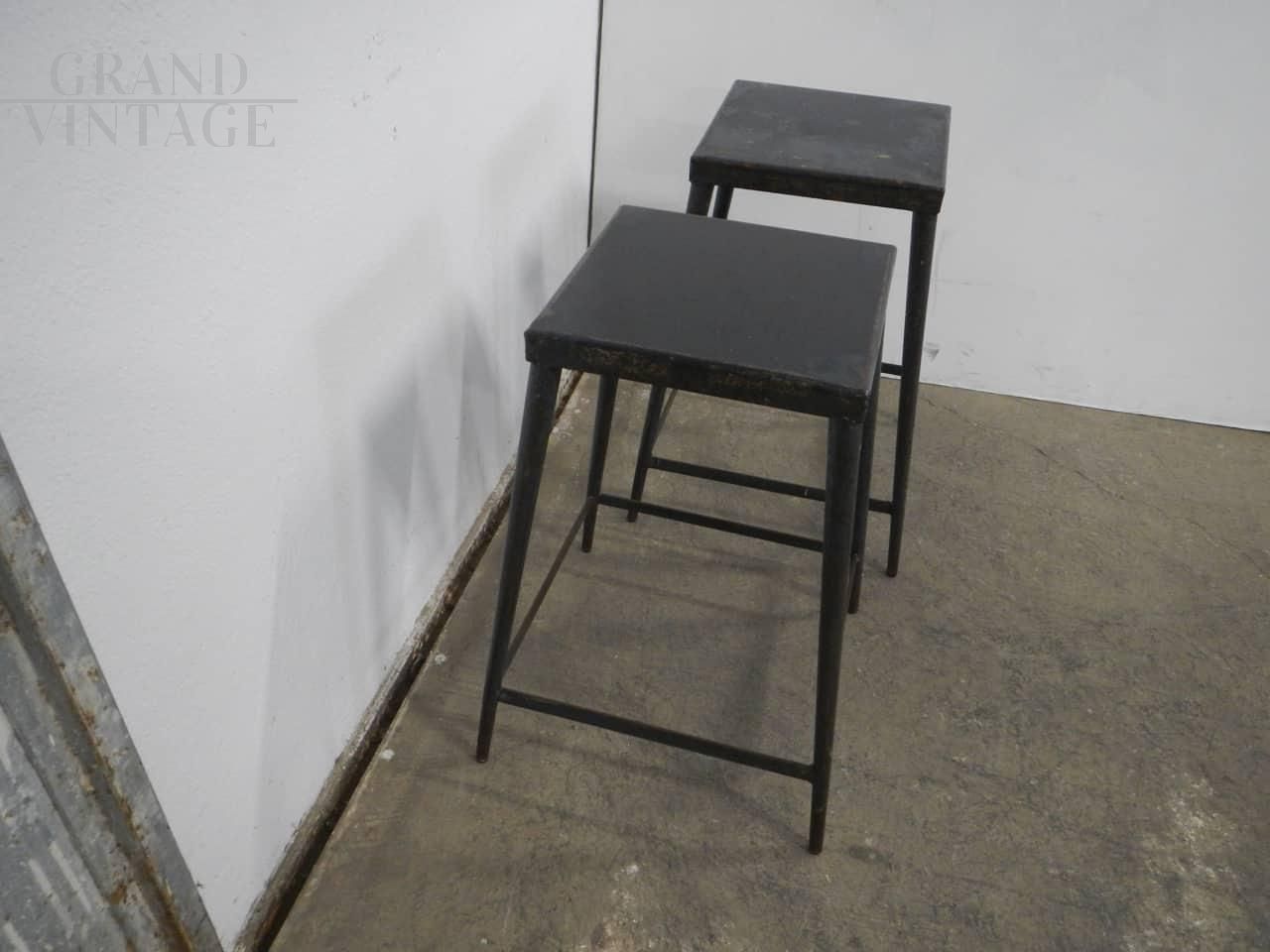 Pair of industrial iron workshop stools with footrest, stackable, with square seat, cleaned and left with their original color, treated with iron paint that makes them smooth to the touch. They have the natural signs of use.