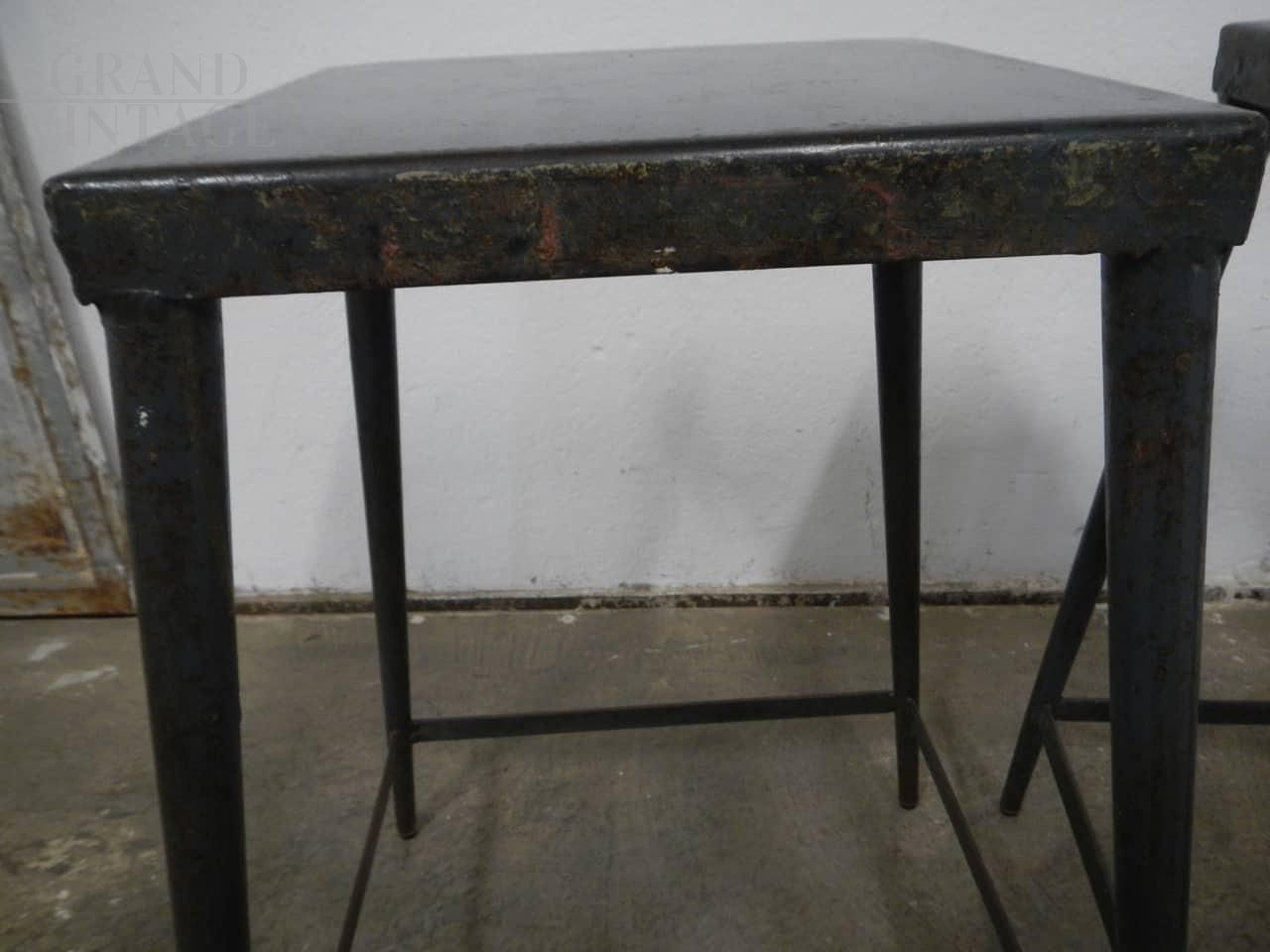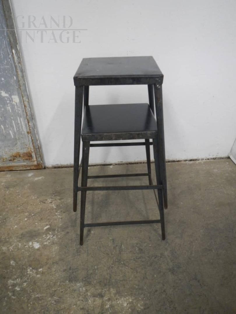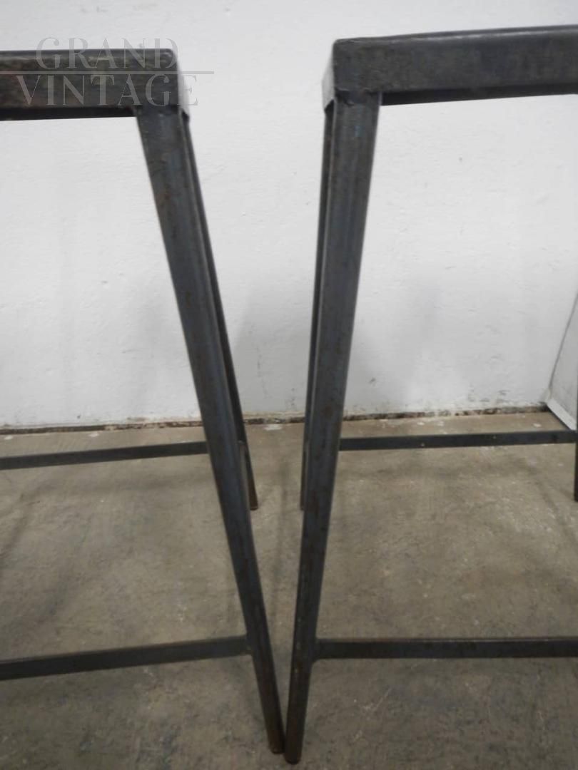 Pair of industrial iron workshop stools with footrest, stackable, with square seat, cleaned and left with their original color, treated with iron paint that makes them smooth to the touch. They have the natural signs of use.