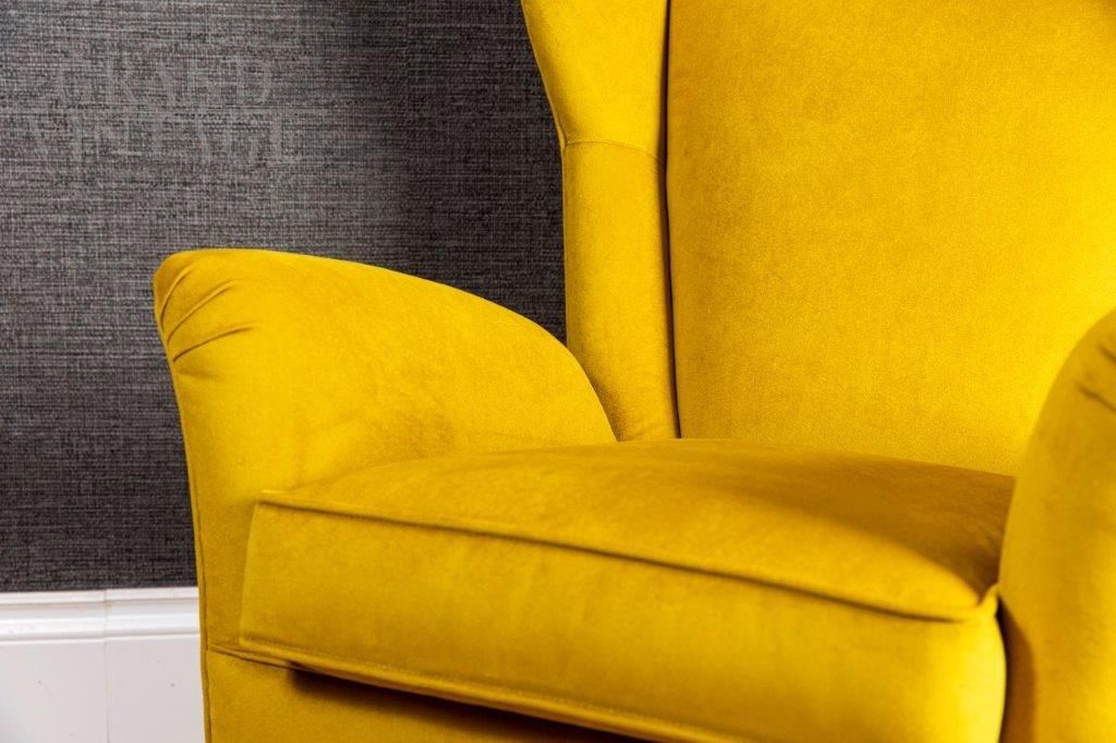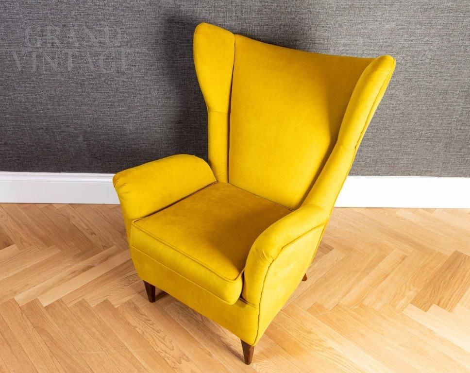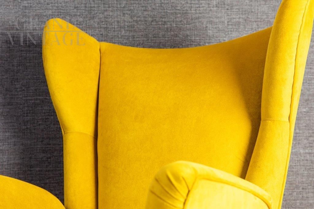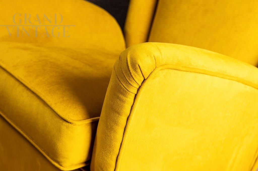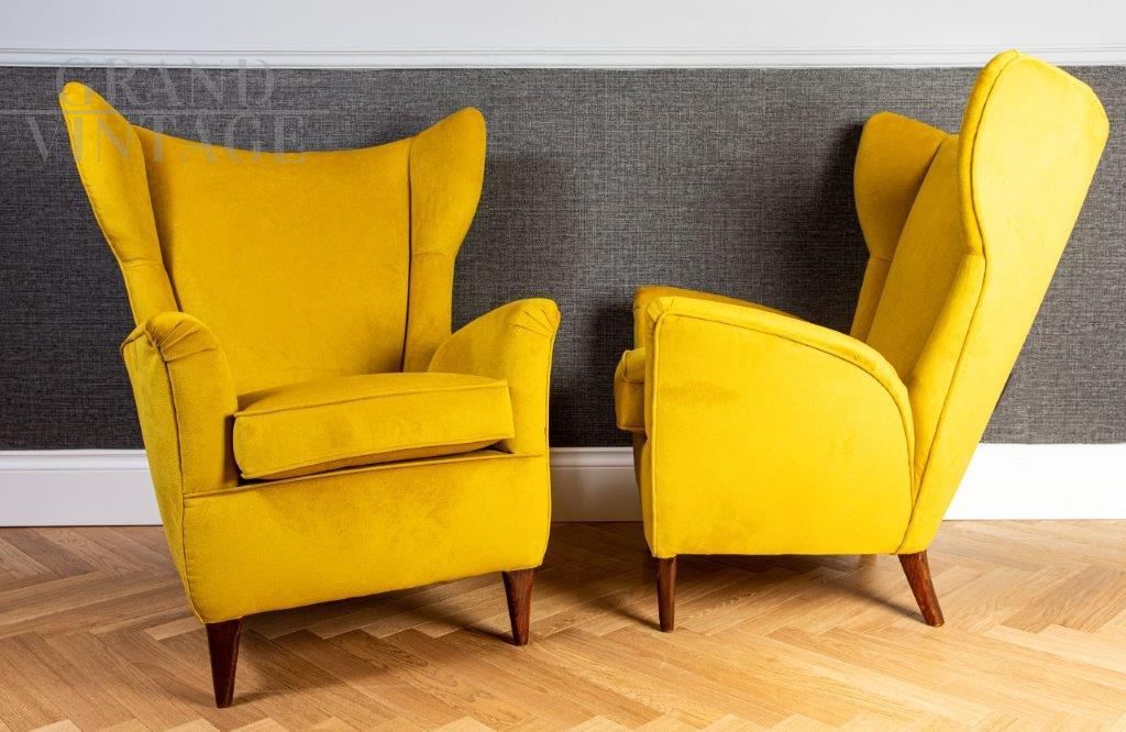 Pair of armchairs produced by ISA, 1950s, with wooden feet. The two armchairs were upholstered in ocher yellow velvet. Very comfortable seat.