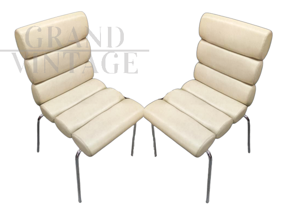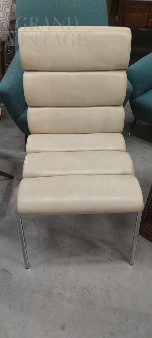 Pair of Joe Colombo style chairs or Sinus model in white leather with chromed metal structure.