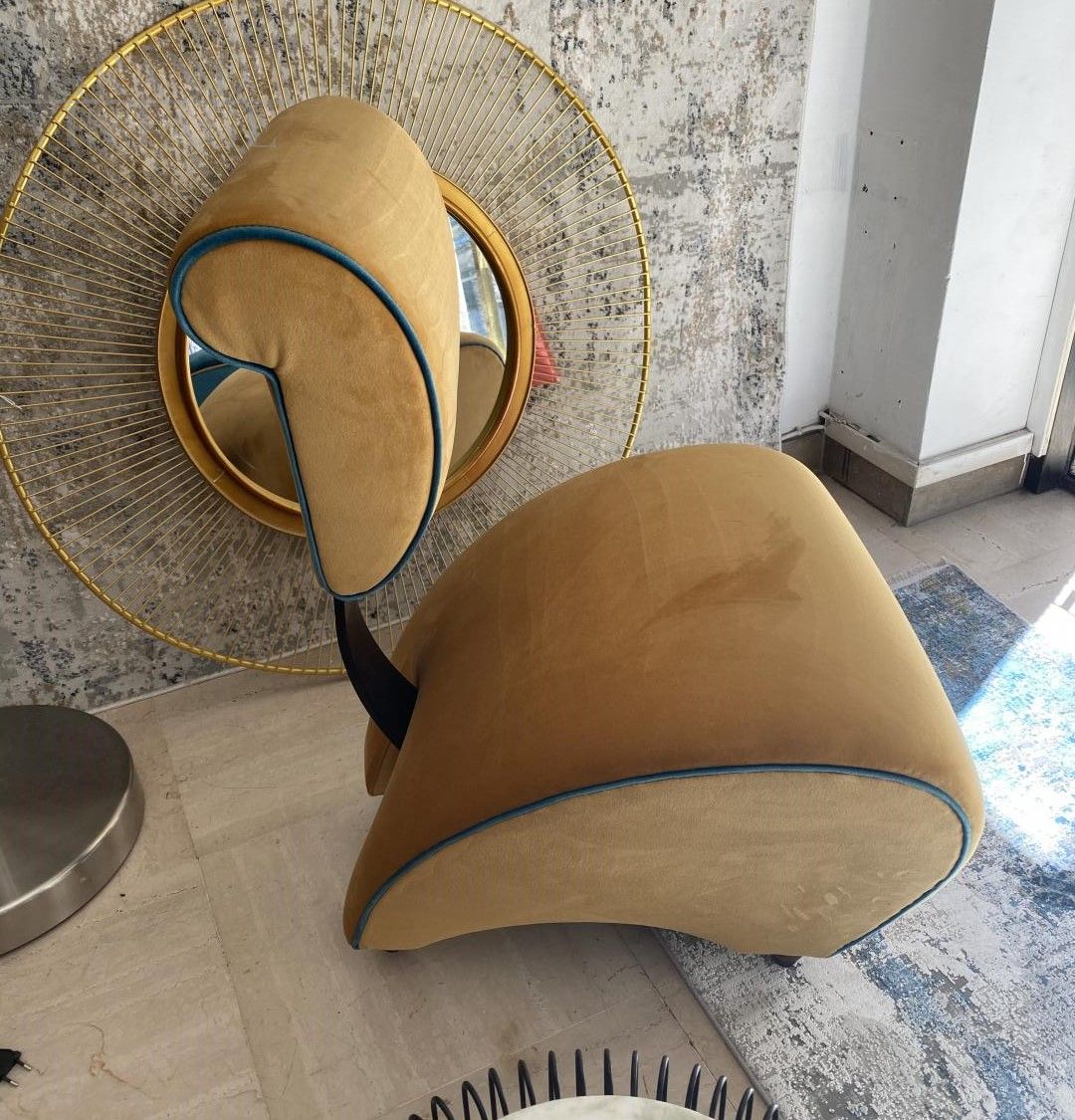 Pair of Jordan Mozer armchairs from the 70s, with mustard yellow velvet upholstery with blue profiles and wood and iron structure.