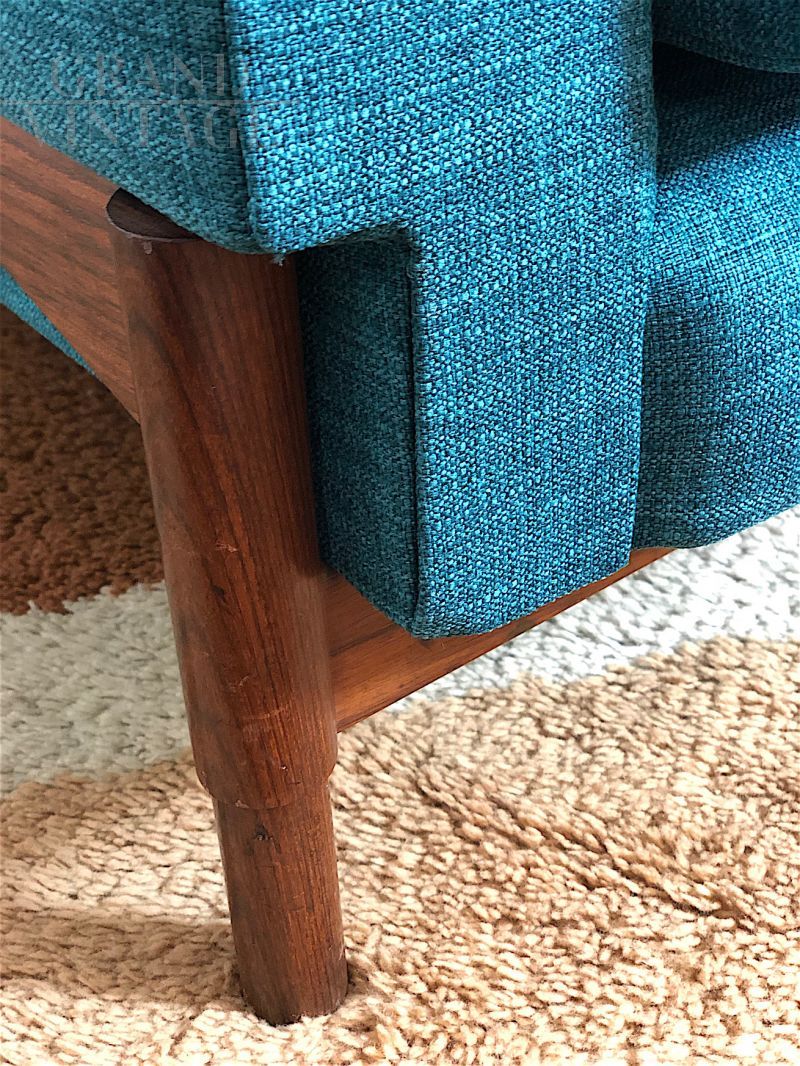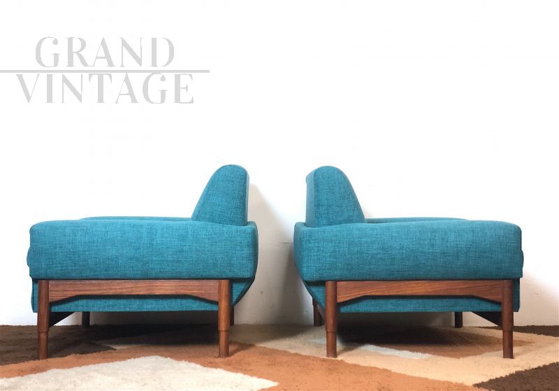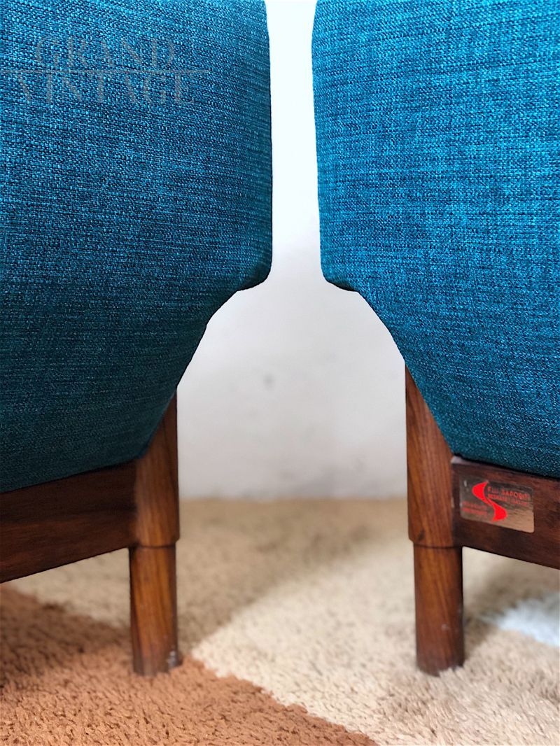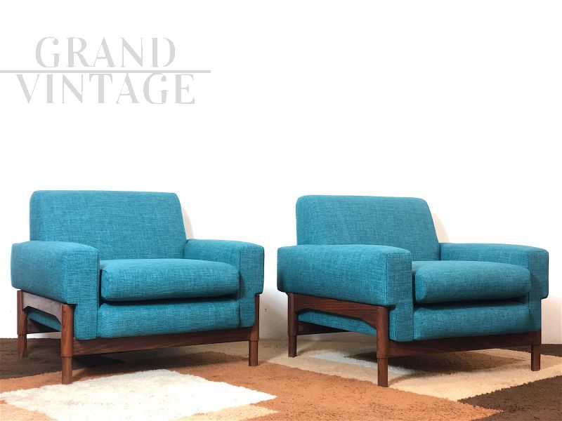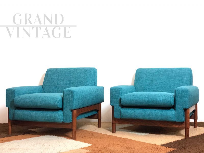 Pair of Kiushu armchairs, design by Fratelli Saporiti, upholstered in sky blue cotton fabric, mid-century Italian modern design from the 1960s. The Kiushu model was designed by the F.lli Saporiti, they stand out for a low and wide structure with generous padding, these examples are completely restored with new interiors and upholstery, maintaining the original structure with the manufacturer's plate, to guarantee authenticity . The structure is in solid National Walnut wood, internal padding made of high quality polyurethane foam, covered in Sky Blue cotton fabric. The Kiushu model is an excellent example of Italian design from the 1960s, characterized by futuristic lines. This armchair model stands out for an extremely innovative design that mixes sculptural shapes with ergonomic functionality. Ready to furnish your living room, with a modern style that makes these pieces adaptable to various contexts. In perfect condition. Measurements: Height 75 cm, Width 85 cm, Depth 85 cm, Seat 50 x 60 cm, Seat height 45 cm.