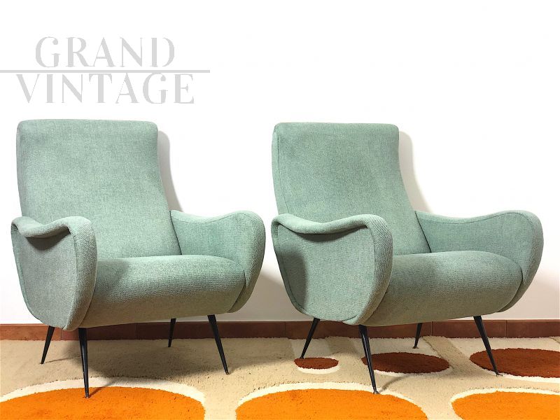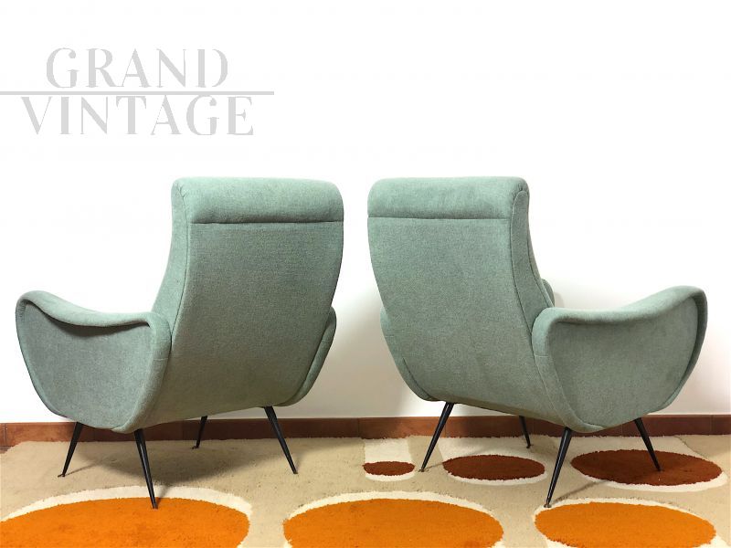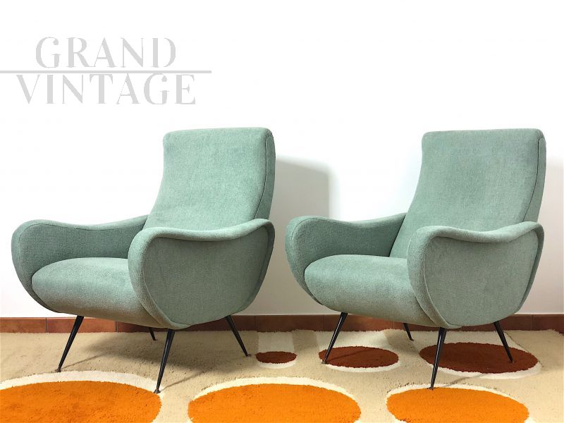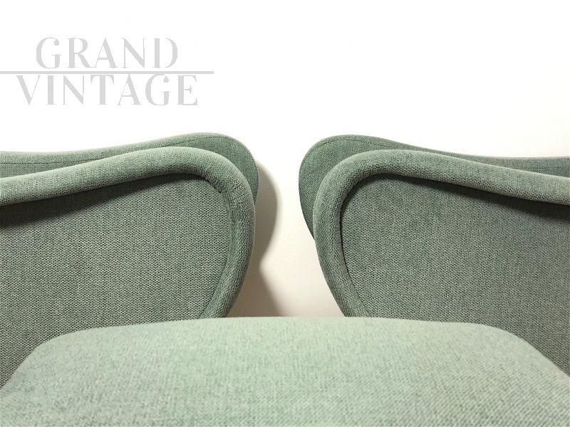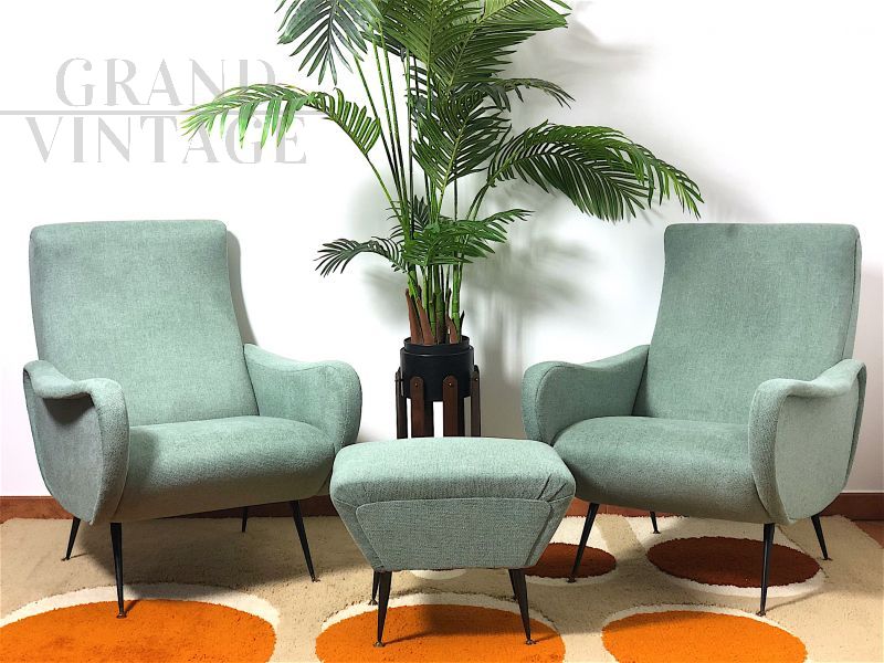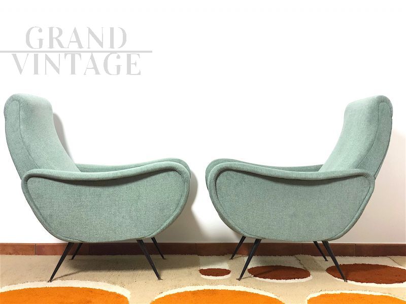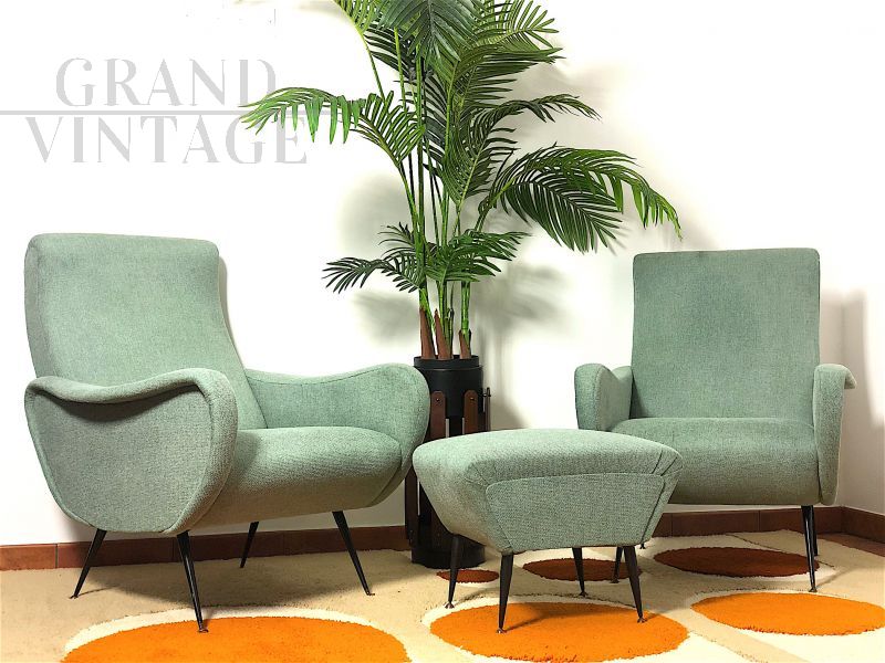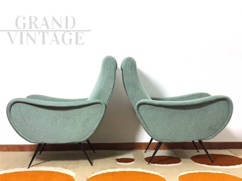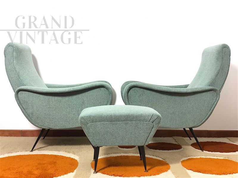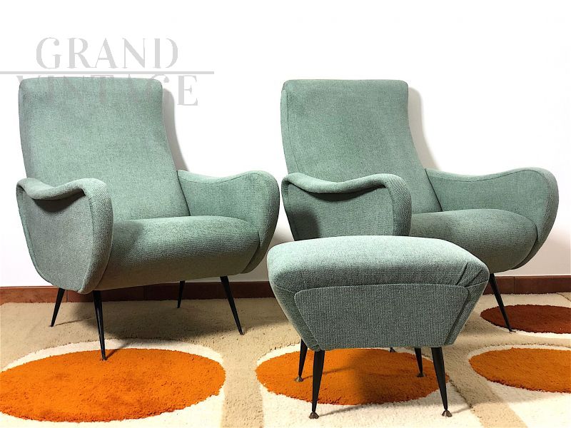 Pair of Lady armchairs with ottoman from the 1950s, design attributed to Marco Zanuso. A masterpiece of Made in Italy, Lady was awarded the Gold Medal at the IX Triennale di Milano in 1951. The armchairs are made in Italy, completely restored with new upholstery and interiors, in aqua blue cotton fabric, unmistakable style of the shell by designer Marco Zanuso, metal legs and brass feet. In perfect condition. Measurements: Height 95 cm, Width 74 cm, Depth 90 cm, Seat height 40 cm, Seat 52 x 50 cm.