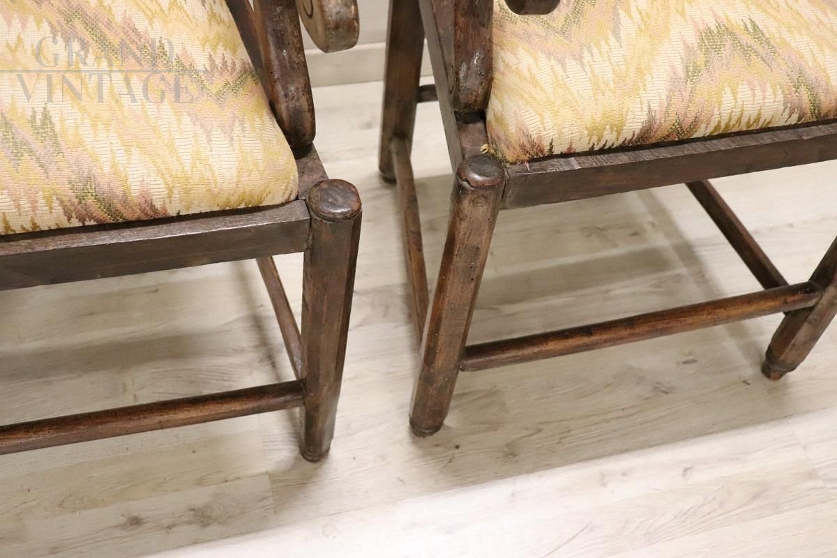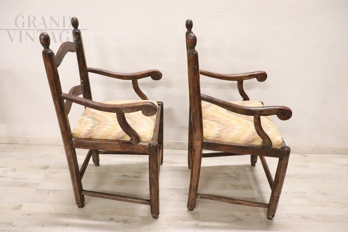Beautiful set of 2 large antique Italian large chairs from the 18th century, Louis XVI period in solid walnut wood. The chairs are characterized by a simple and essential line, the seats are large and comfortable, padded with a fabric that features a Missoni style decoration. These armchairs are in perfect vintage condition, ready to be used in your home, ideal as a head of the table. Perfect for placing in a country or mountain home. Price negotiable.