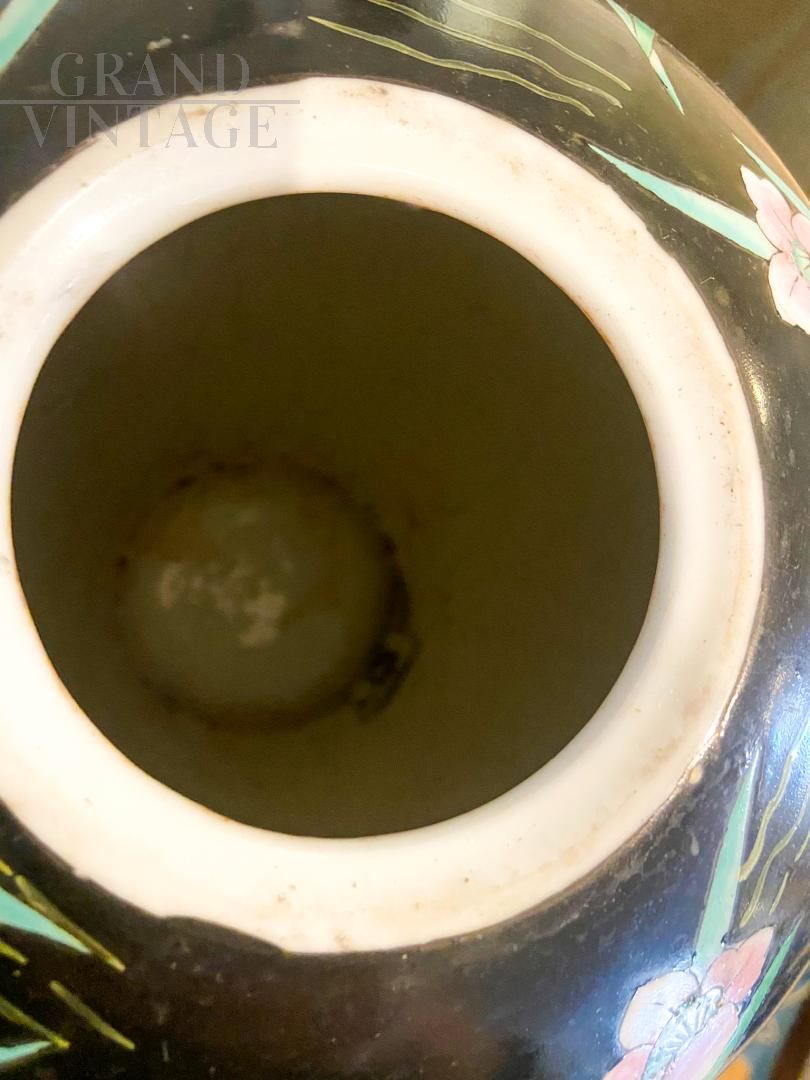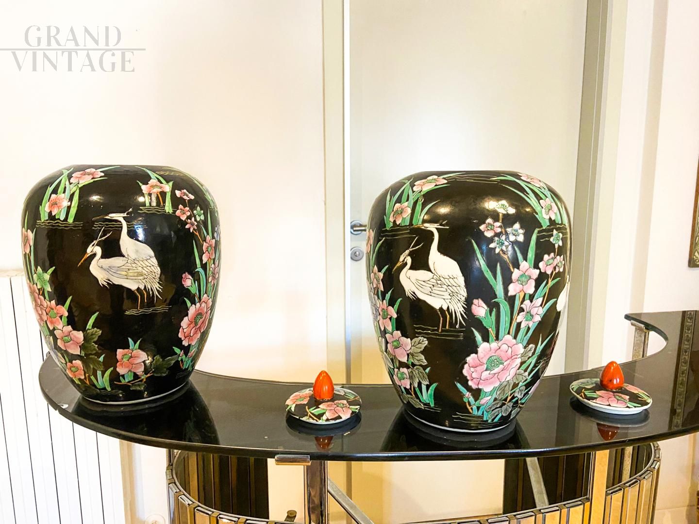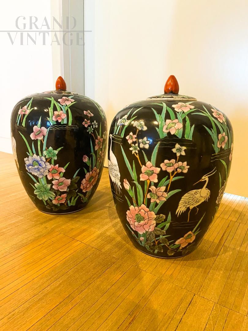Pair of large potiches vases in Chinese porcelain from the first half of the 20th century with polychrome enamel decoration with bucolic decorations and the Crane bird, symbol of longevity, peace and elegance, are companion animals, of the Taostic Divinities who together fly over the clouds, more close to Western taste. In excellent condition.