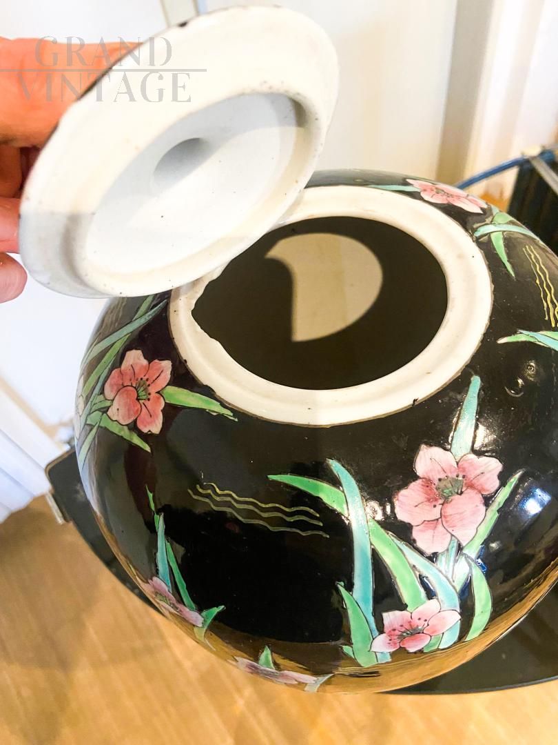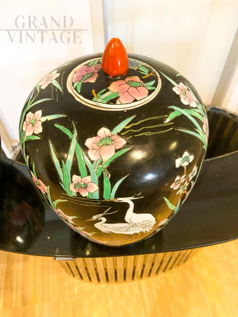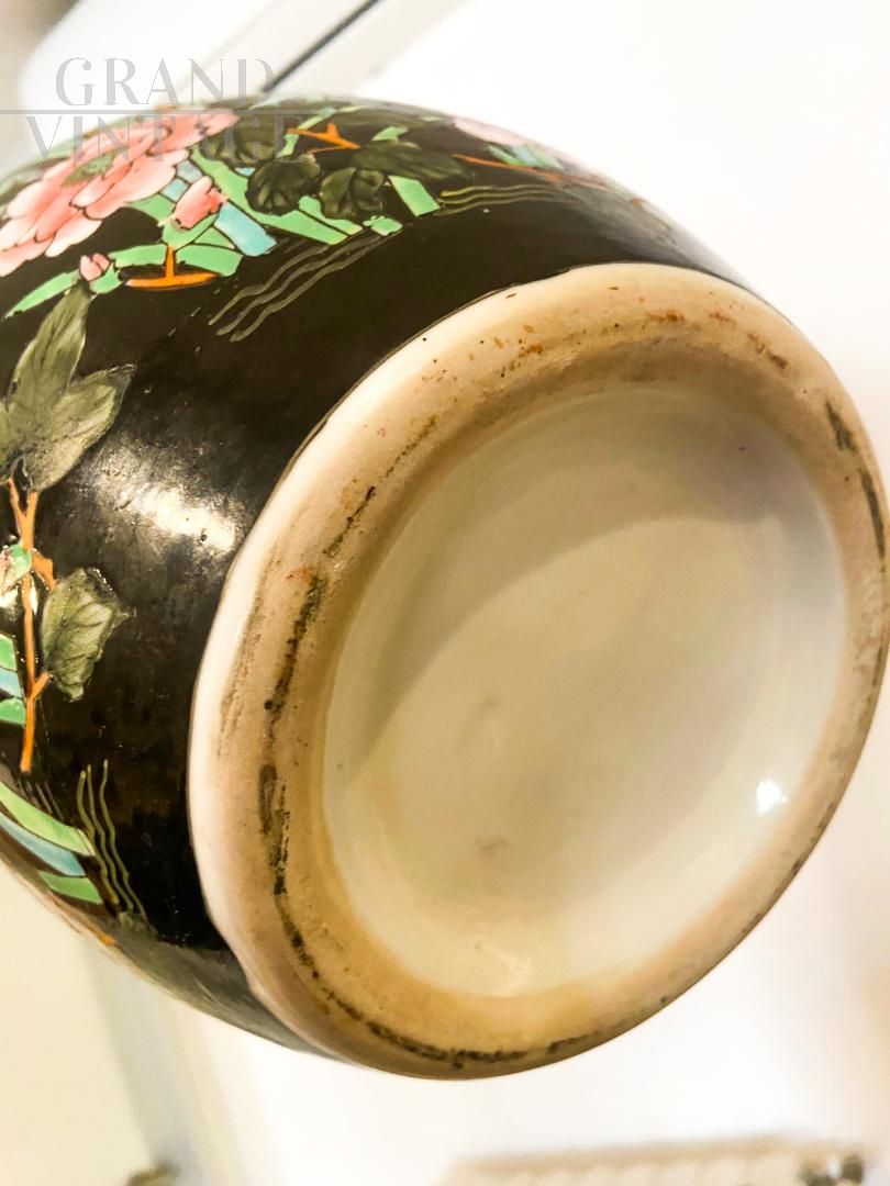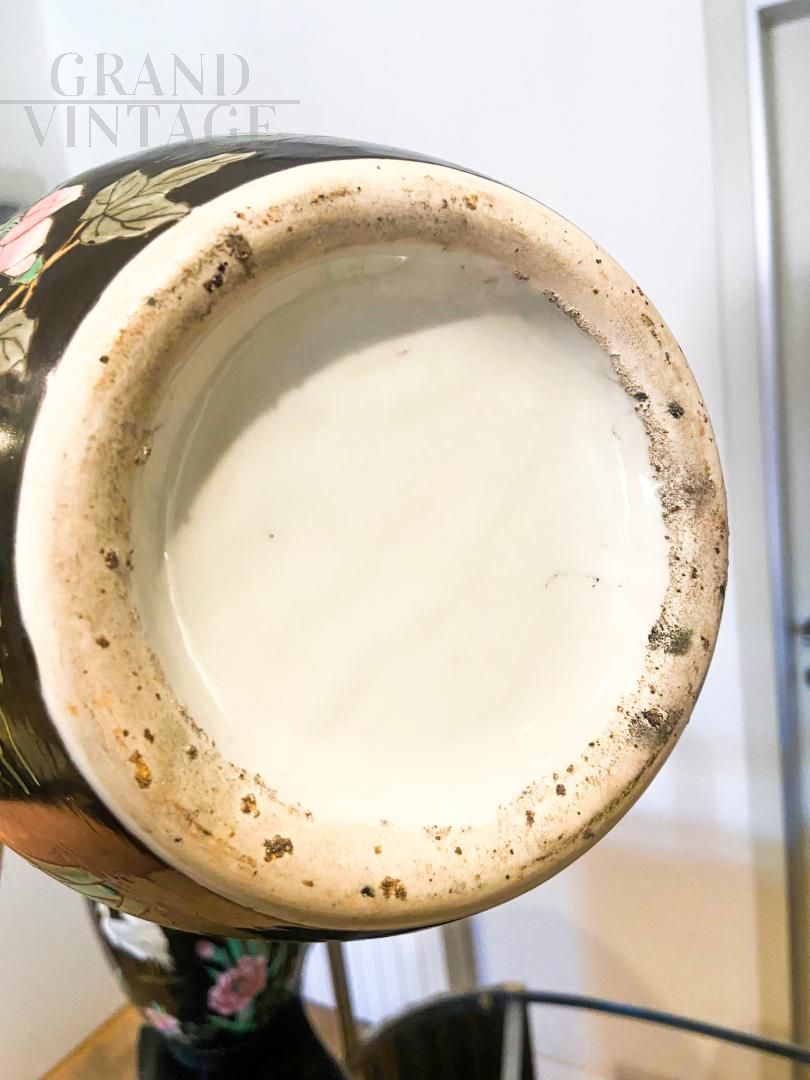Pair of large potiches vases in Chinese porcelain from the first half of the 20th century with polychrome enamel decoration with bucolic decorations and the Crane bird, symbol of longevity, peace and elegance, are companion animals, of the Taostic Divinities who together fly over the clouds, more close to Western taste. In excellent condition.