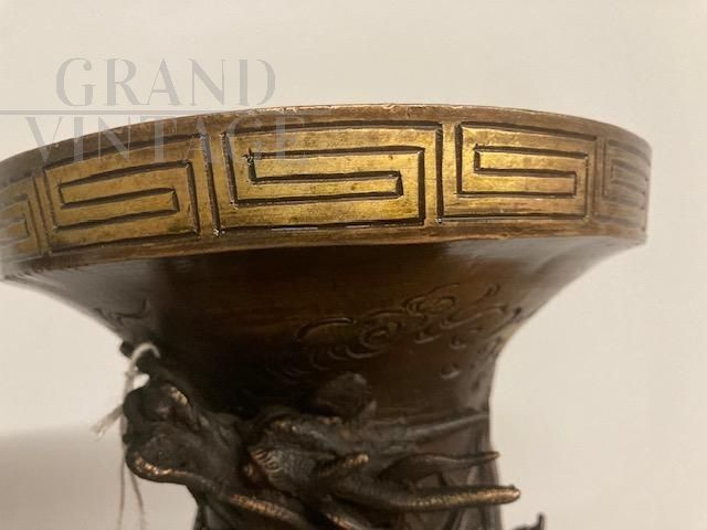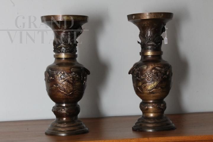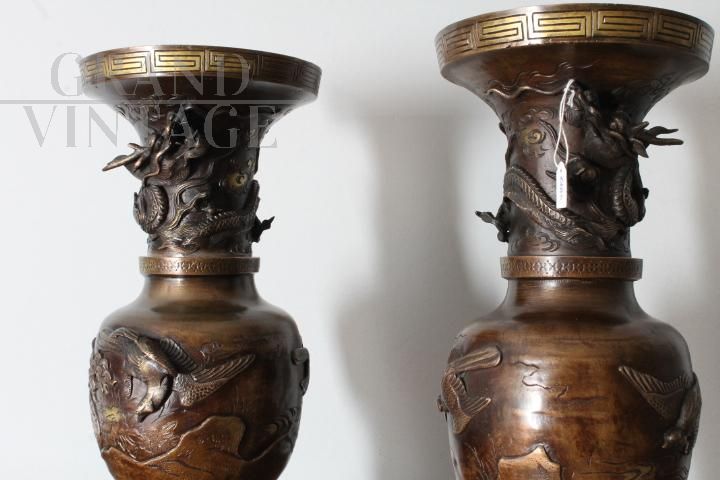 Splendid pair of large antique Japanese vases from the Meiji period of the late 19th century, made of bronze with relief work with dragons, in perfect condition with a beautiful patina. The vases are signed! Height 45 cm