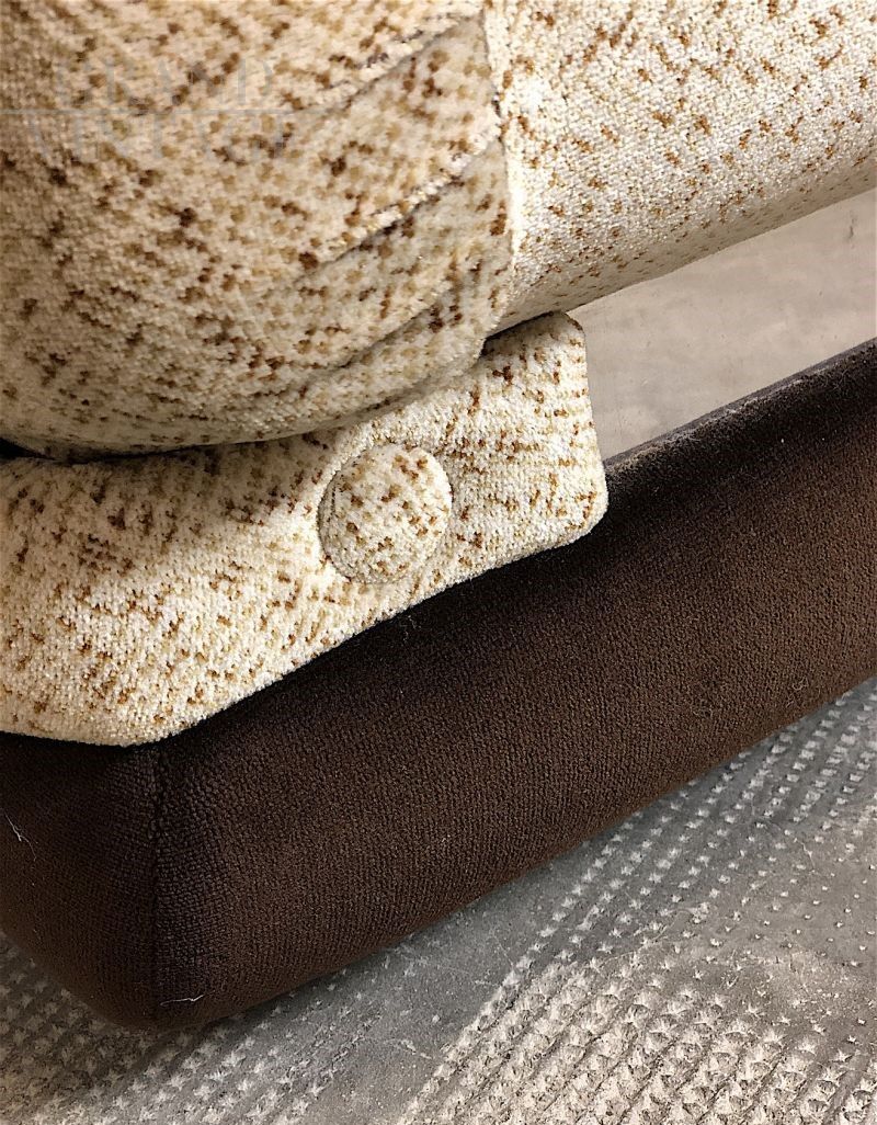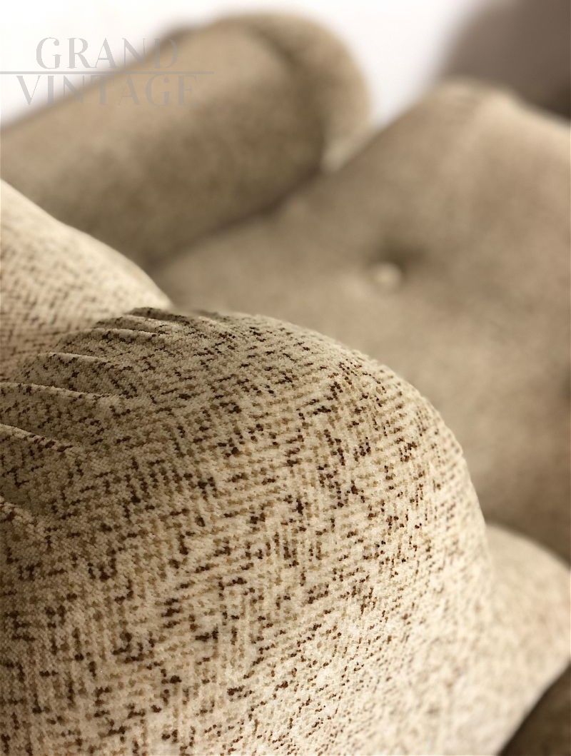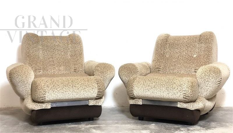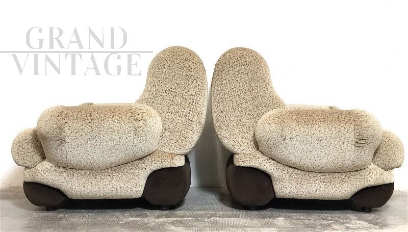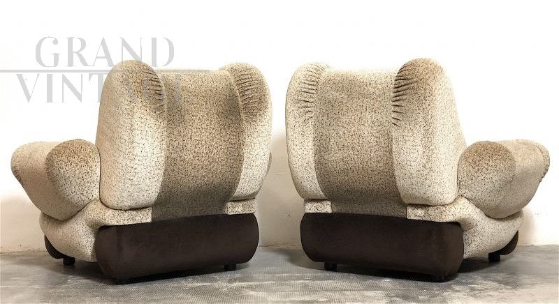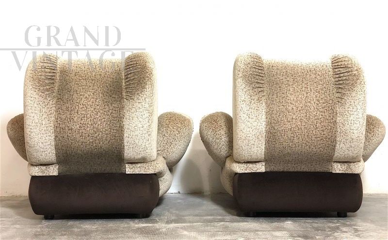 Pair of large space age armchairs, Italian modern design from the 70s, very comfortable and enveloping. The armchairs are of Italian manufacture, with wooden structure, covered in Beige - Brown micro-patterned fabric, the interiors are in expanded material. In perfect condition, completely sanitized. The design and structural line are decidedly futuristic by the canons of the 70s, this period is called Space Age. Measurements: Height 90 cm, Width 105 cm, Depth 100 cm, Seat 60 x 60 cm, Seat height 45 cm.
