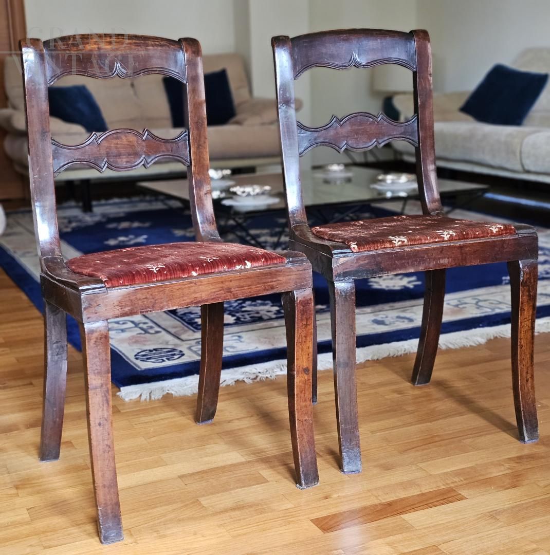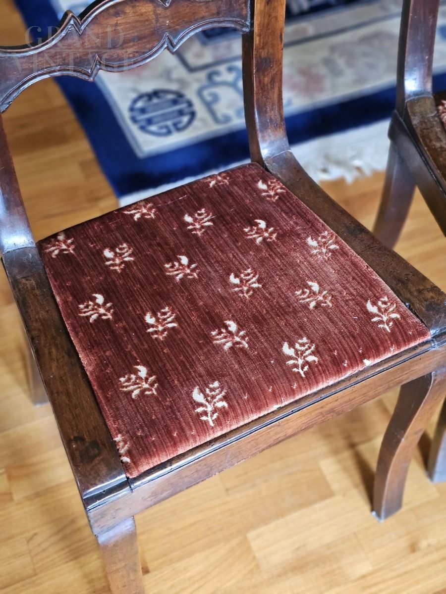 Pair of antique chairs of excellent workmanship, perfectly maintained and still usable, dating back to around the end of the 19th century. The fine aesthetic line and excellent proportions make it a set of seats with a light and graceful image. Backrest with fine workmanship with an essential and harmonious line. The seat is in brown velvet with floral motifs, in excellent condition. Possibility of purchasing a third identical chair but to be reupholstered.