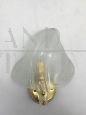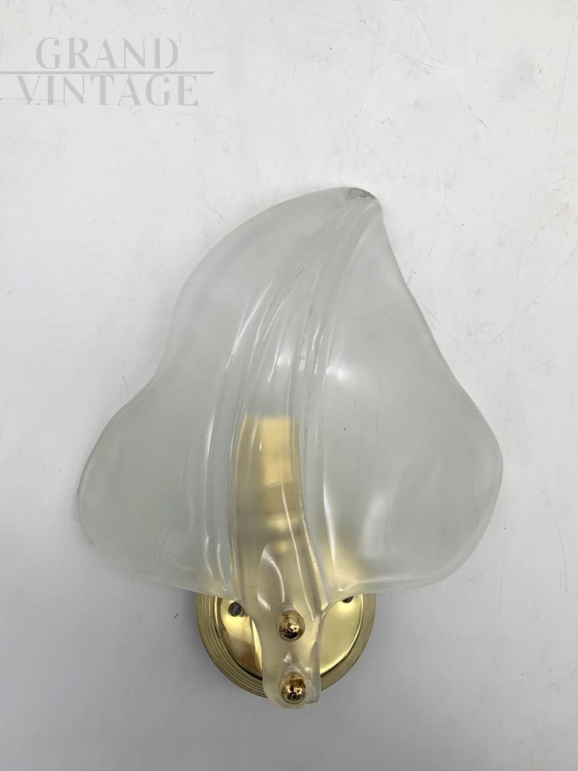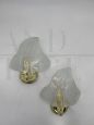 Pair of Murano glass leaf wall lights attributed to Seguso, very particular, each with a light point in opalized transparent white glass handcrafted on a mould, supported by a brass structure. The wall lights are in excellent condition, with few natural signs of aging and with non-cracked glasses, and each one has a newly redone electrical system with an E14 type bulb socket. The glass parts can be removed from the structure for safer transport. Upon request, the lamps can be prepared for the American electrical system. 5 pairs available, the price refers to the single pair.