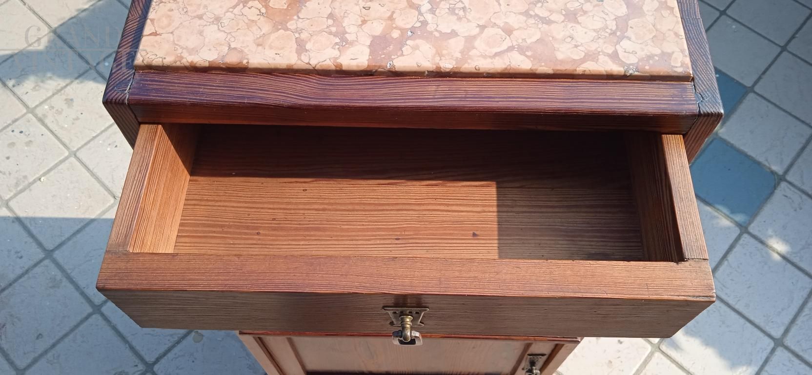 Beautiful pair of Liberty bedside tables in solid larch with red Verona marble top and inlays on the upstands, origin: Italy, Venetian Alps. Wax polishing.