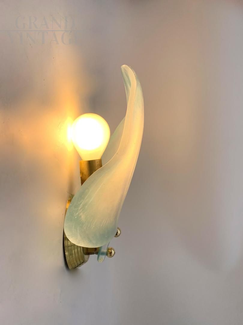 Pair of leaf or feather wall lights attributed to Seguso in opalized Murano glass with light blue shades. These wall lights are very particular, with intact and uncracked glass hand-moulded, and a brass structure with few signs of aging. Each wall light has an E14 type bulb socket. The glasses can be removed from the structure to ensure safe transport. New electrical system and lamp holder, on request they can be prepared for the American electrical system.