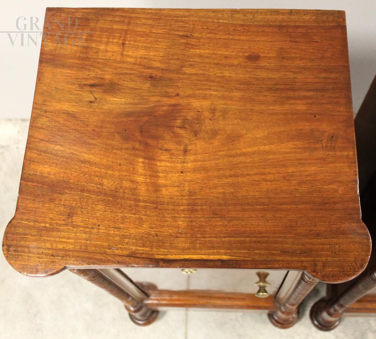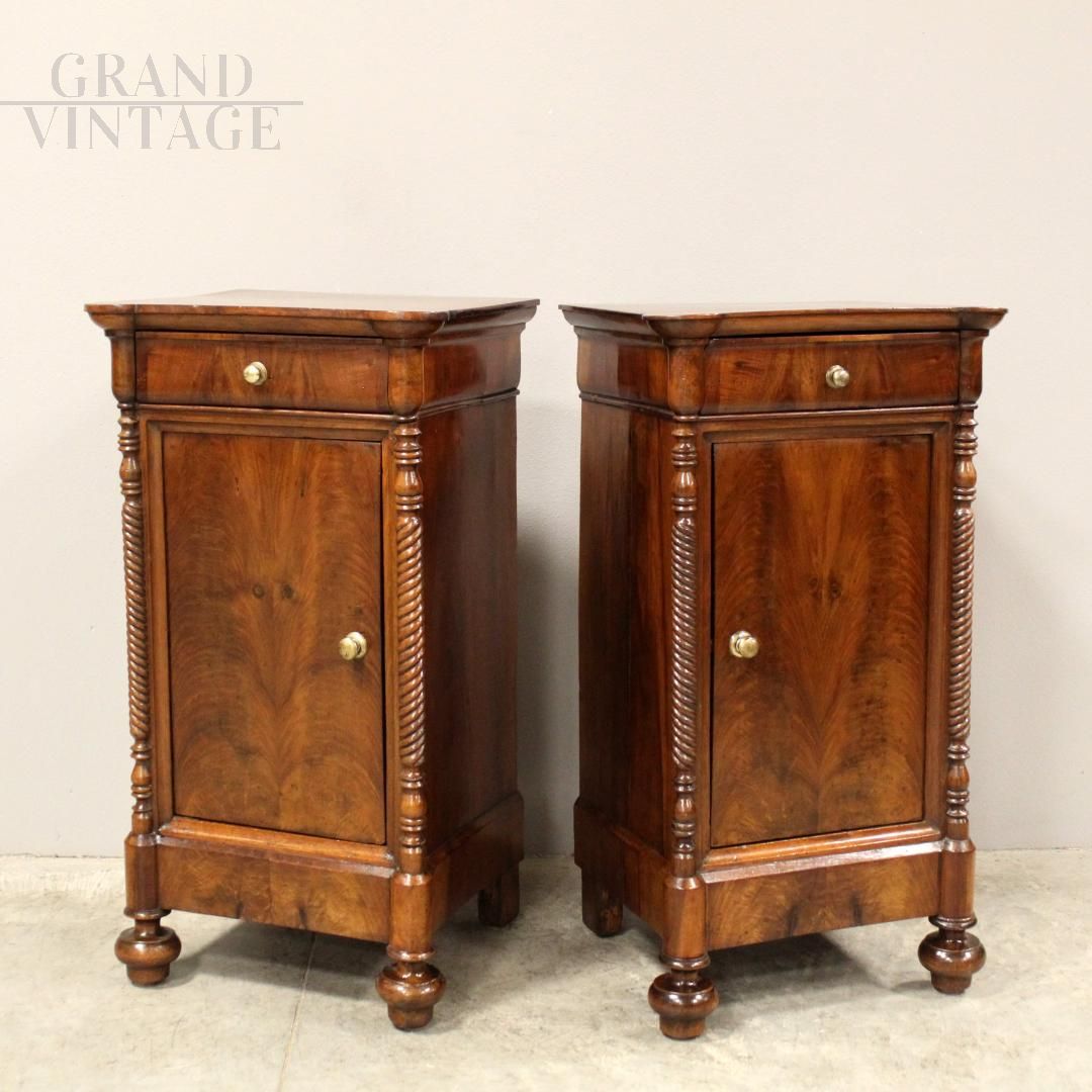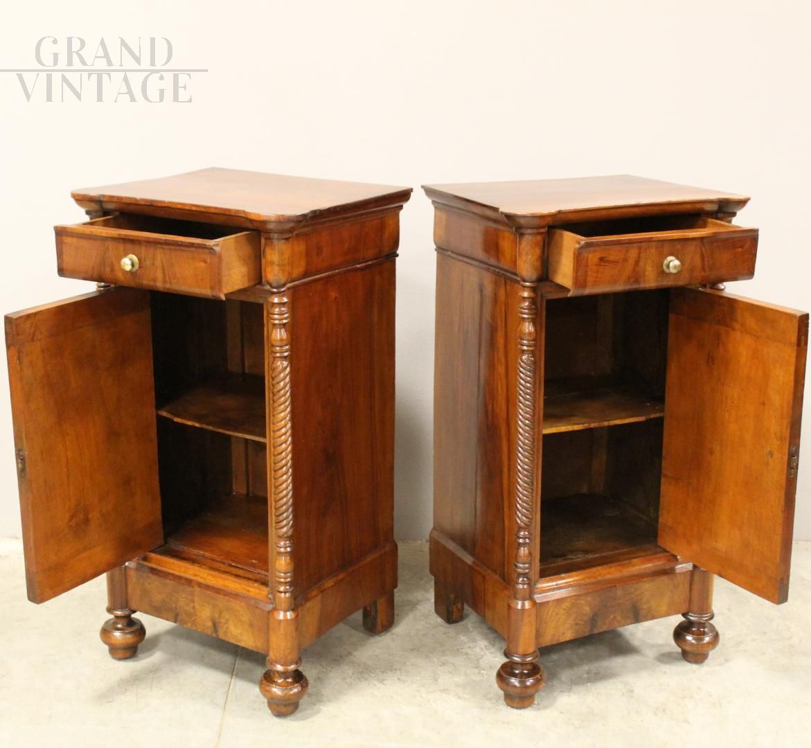Pair of Louis Philippe walnut nightstands with door and drawer, Italy 19th century