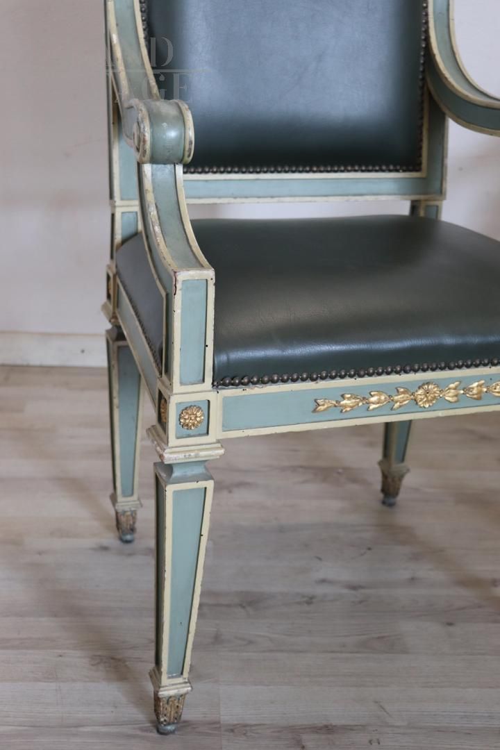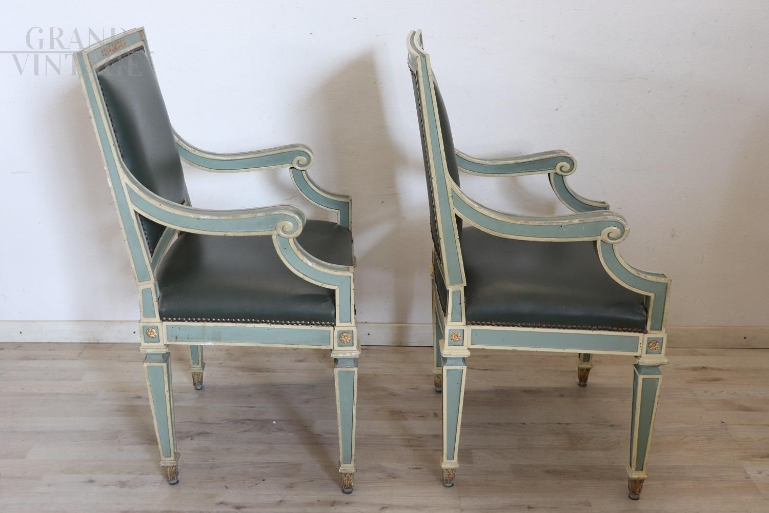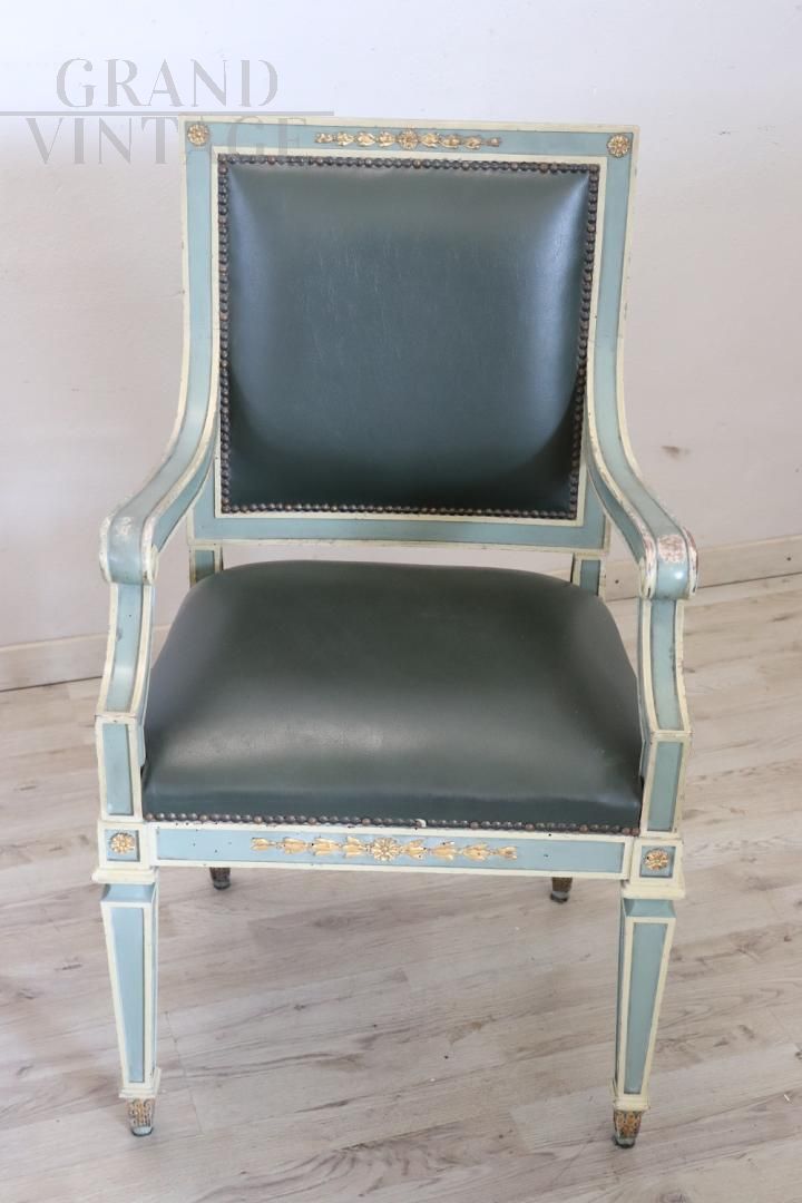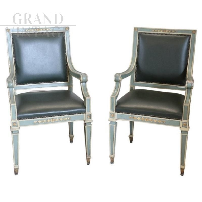 Gracious pair of Louis XVI antique style armchairs in lacquered wood with refined gilded decorations, upholstered seat and back covered in green imitation leather, made in Italy in the early decades of the 20th century. Padding and upholstery in excellent condition, there are signs of wear in the lacquering and woodworm holes, obviously treated. Great negotiable price.