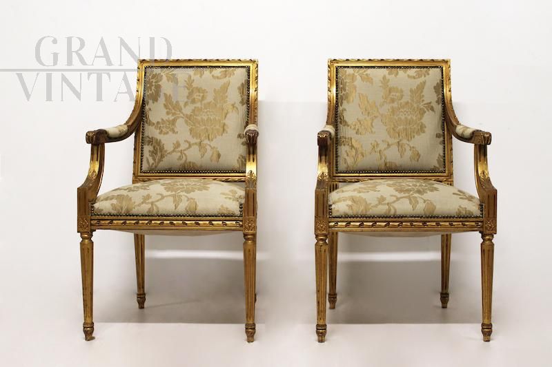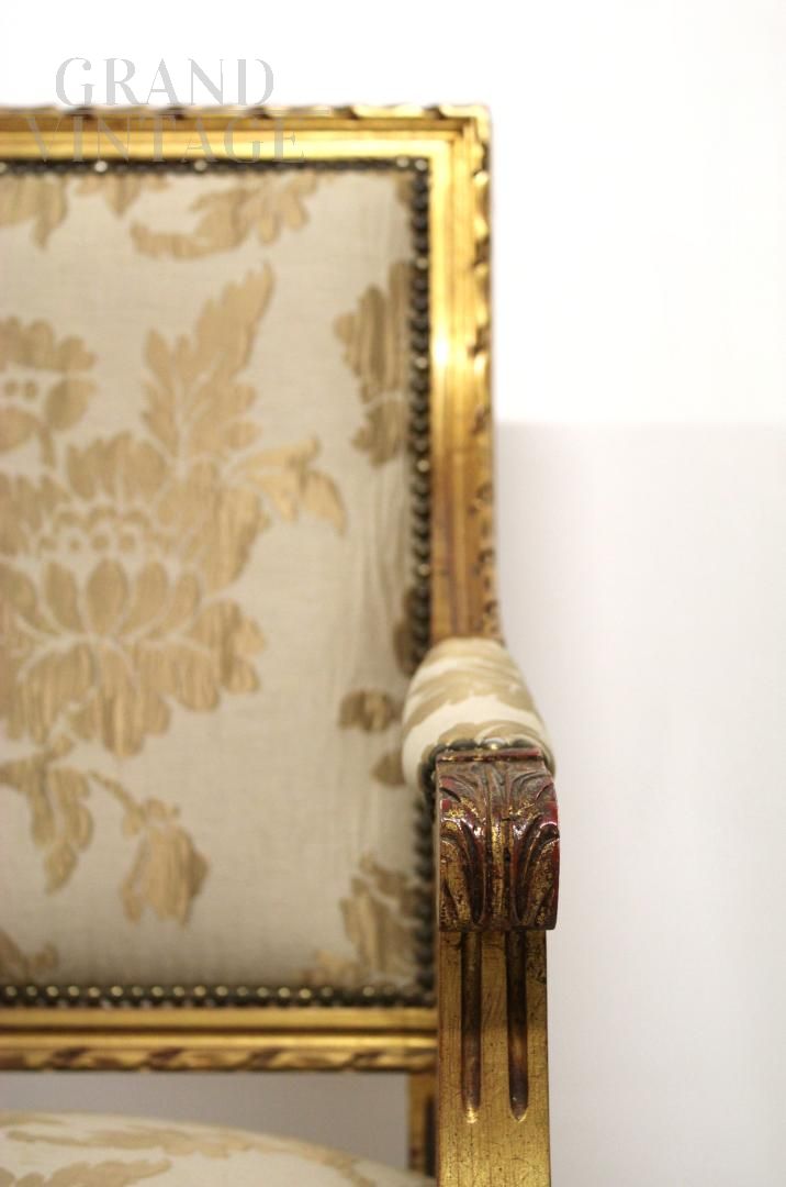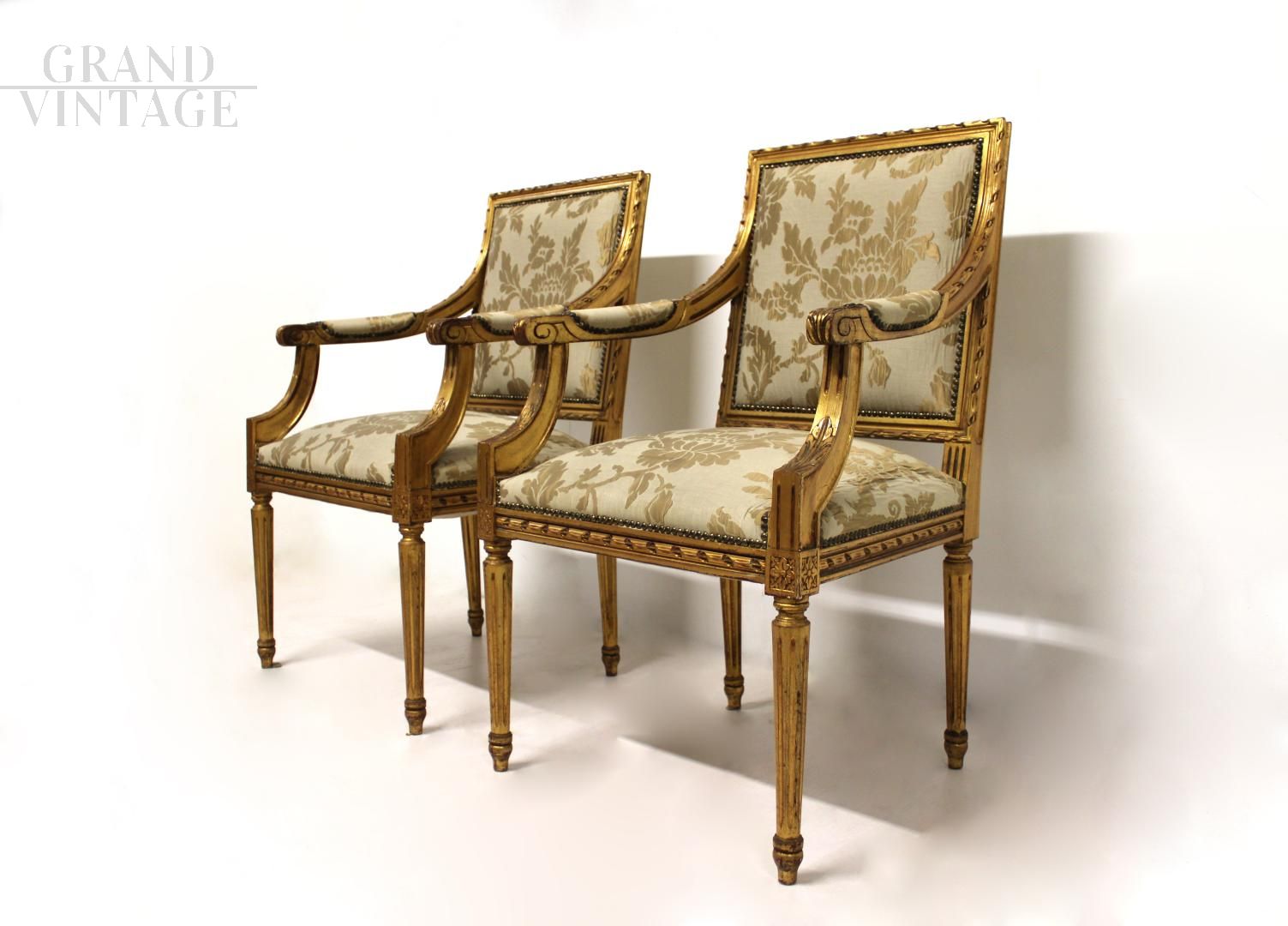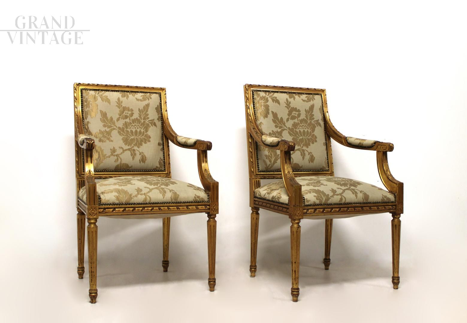 Pair of Louis XVI style baroque armchairs with wooden structure and gold leaf finish, upholstery in original brocade fabric.