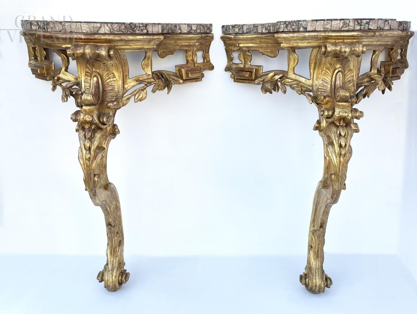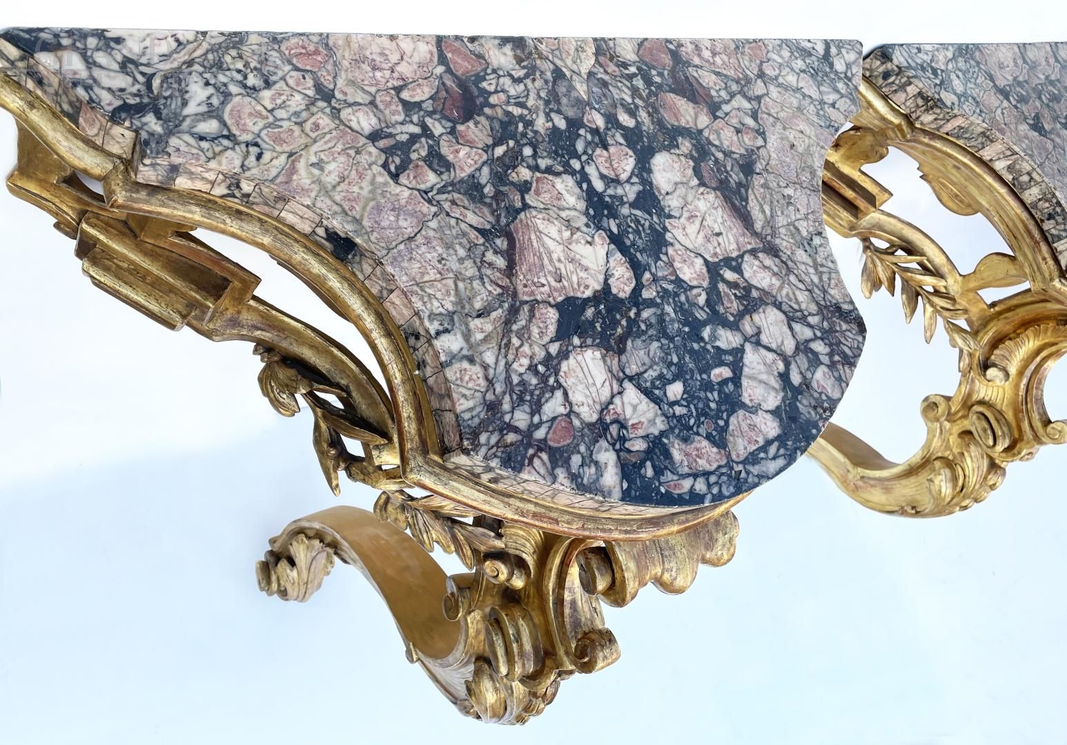 Pair of Louis XVI Baroque console tables in stirrup shape, entirely in carved and gilded wood with original gilding and marble top. The consoles are characterized by a single volute leg (convex, concave, convex), with a rocailles foliage pattern. The top is in precious Breccia Africana marble with a thickness of 4 cm, patchwork tecknique with peperino insert.