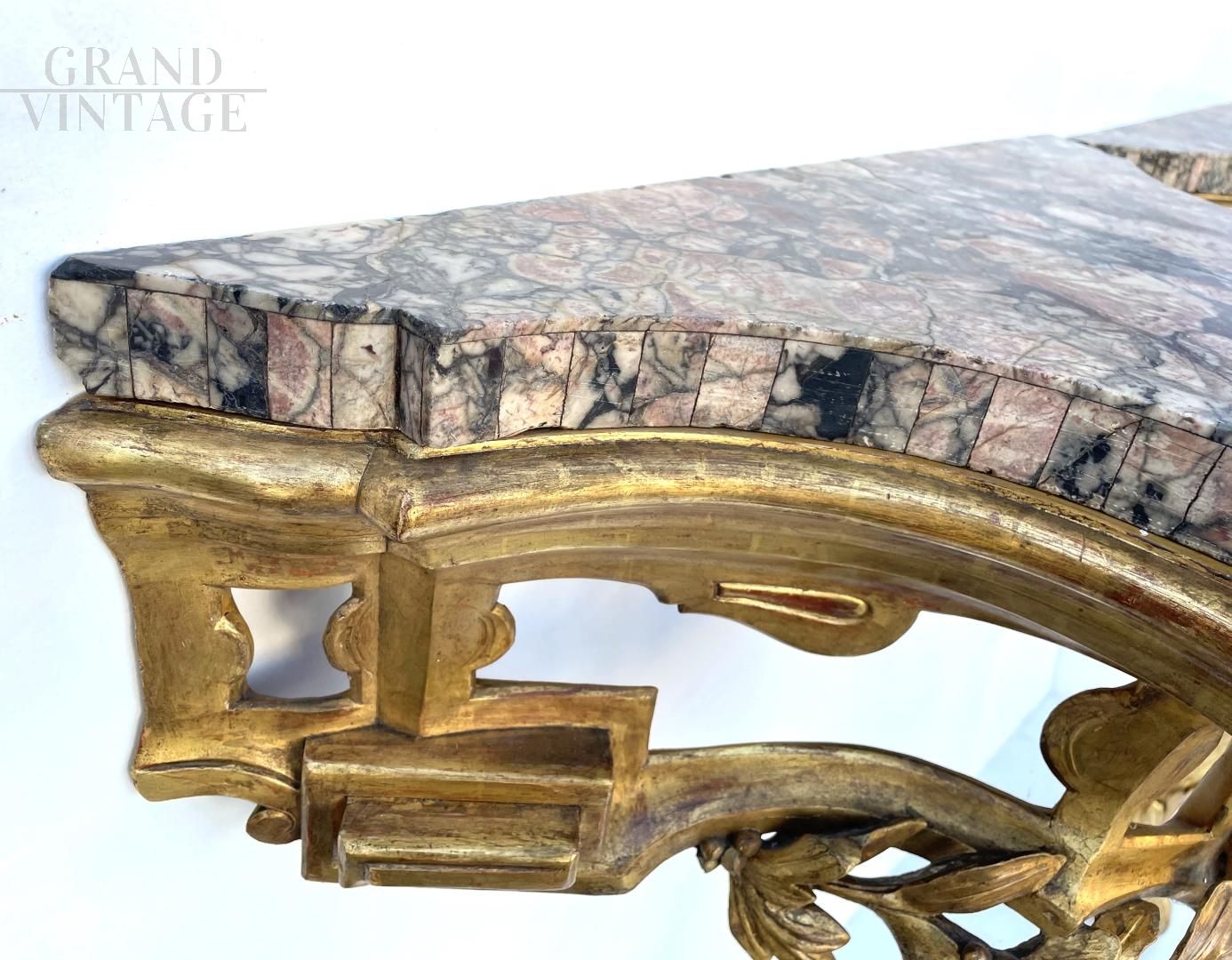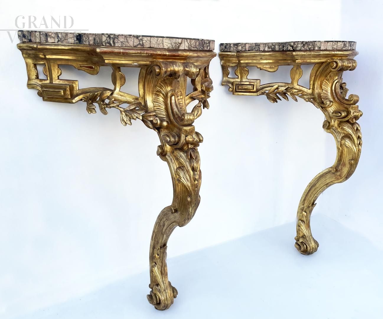 Pair of Louis XVI Baroque consoles in gilded carved wood and marble