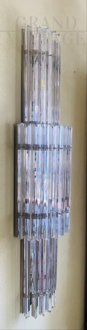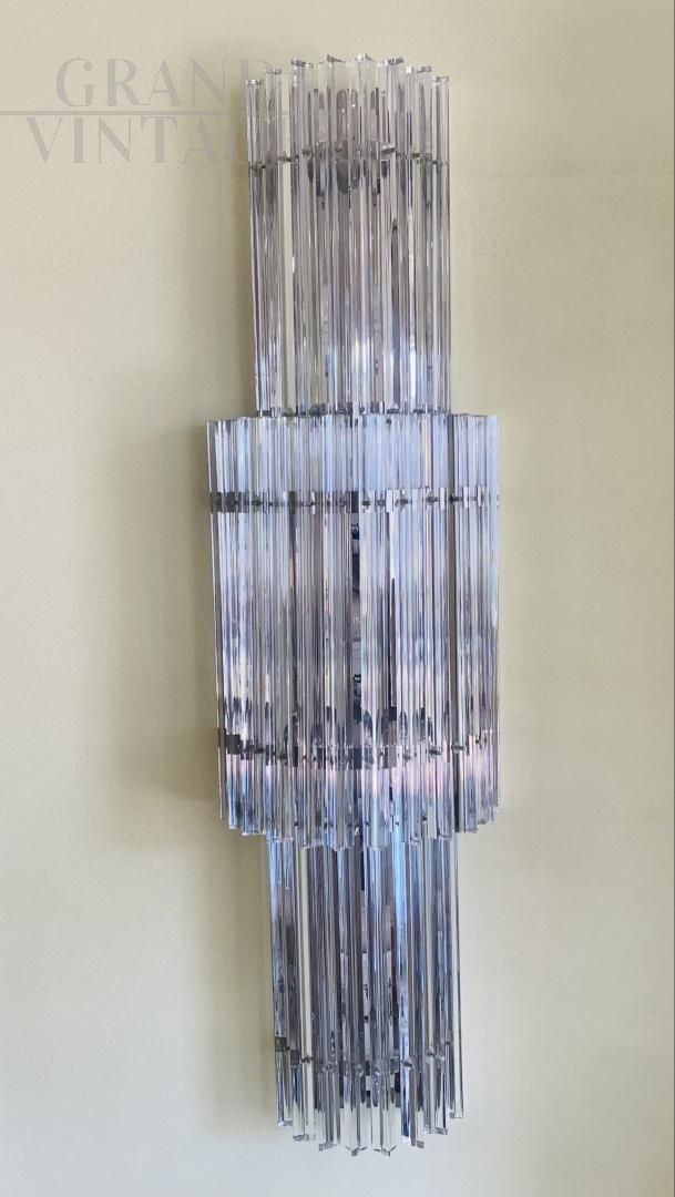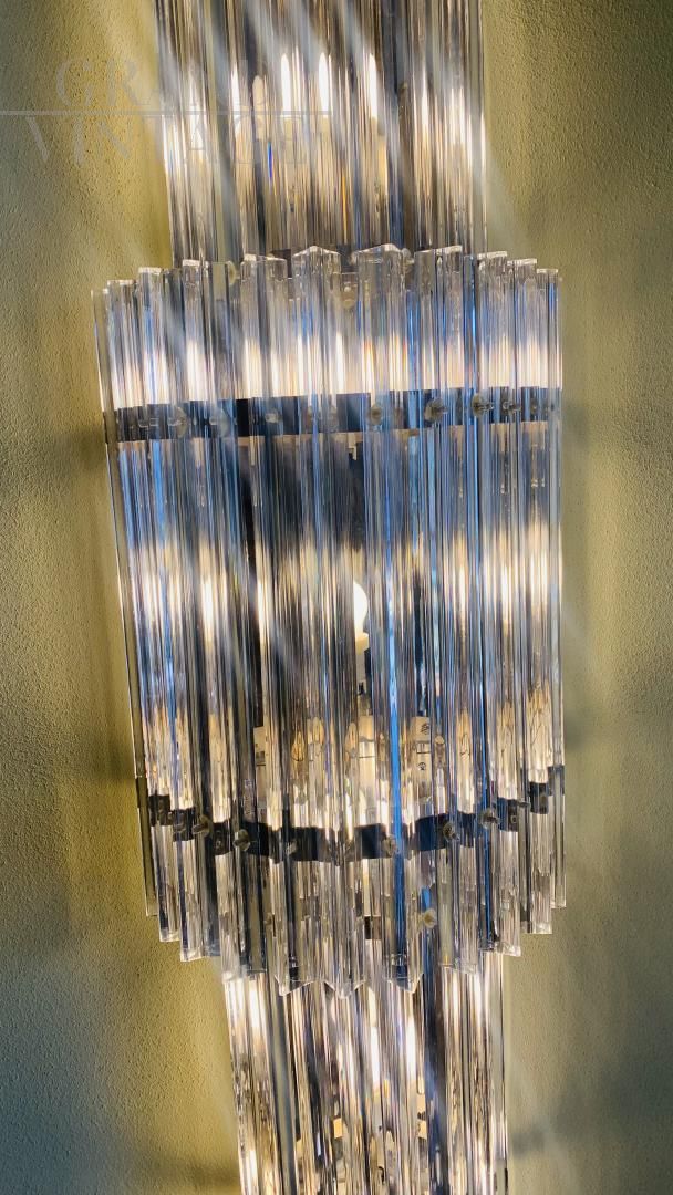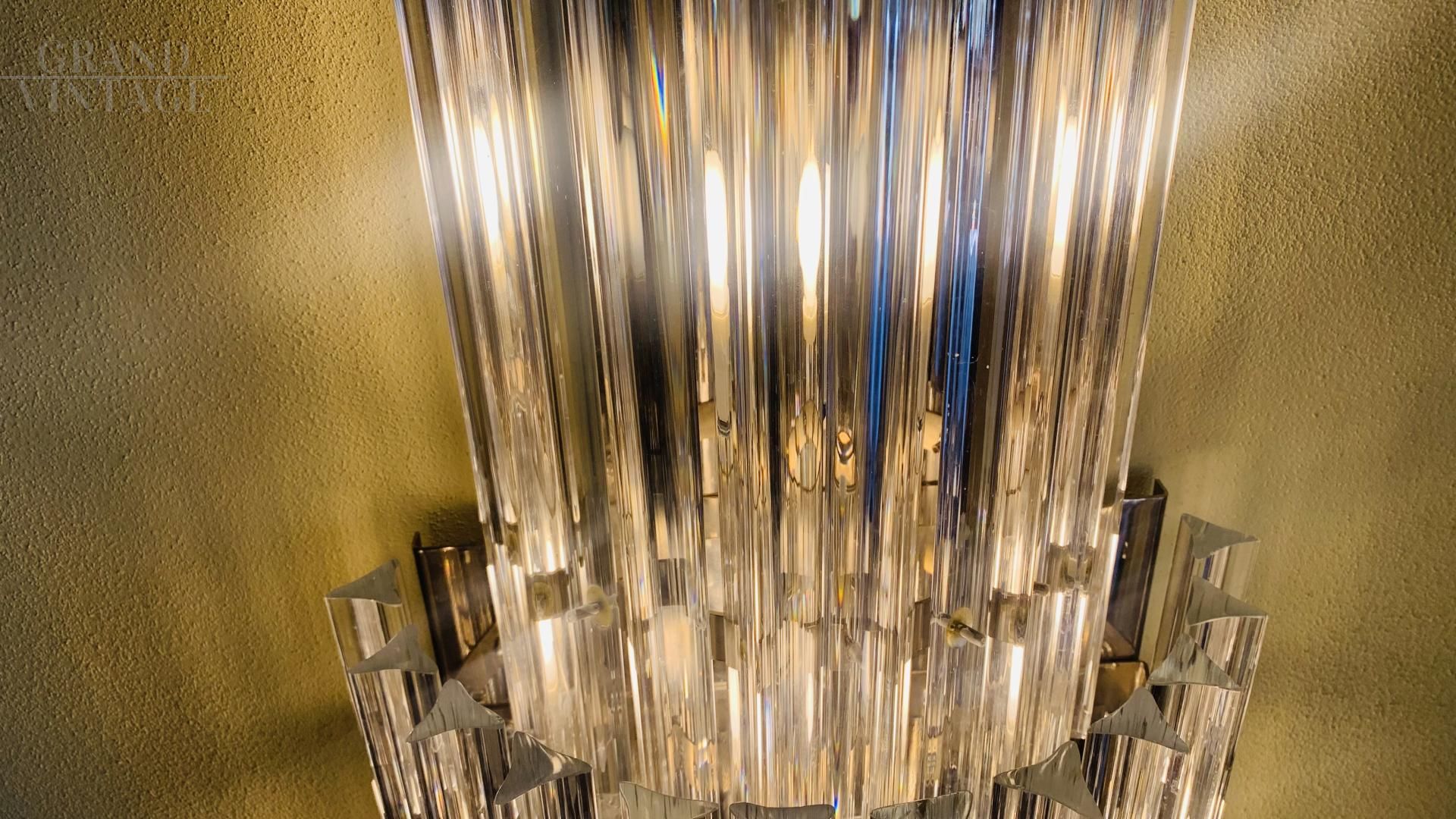 Bellissima coppia di appliques lampade da parete in vetro di Murano lavorato a canne di cristallo su una base in ottone cromato, realizzate e lavorate artigianalmente in tempi recenti con tecniche e materiali di qualità, se ne possono ottenere quindi più esemplari. Ciascuna lampada ha 12 punti luce con attacchi per lampadine di tipo E27 in ceramica. Le lampade sono state create da maestri artigiani con molta attenzione e con un tocco di personalizzazione, dando vita a questa forma verticale semisferica che regala tradizione e design. Le stecche in vetro di Murano color trasparente sono state create a mano dai maestri muranesi, e risultano quindi simili ma non uguali tra loro, e non perfettamente dritte; questa lavorazione artigianale contribuisce a dare valore e bellezza alle appliques. Ogni vetro può essere rimosso dalla struttura. Il prezzo si riferisce alla coppia, l'aggiunta di più pezzi al carrello corrisponde all'aggiunta di più coppie.
