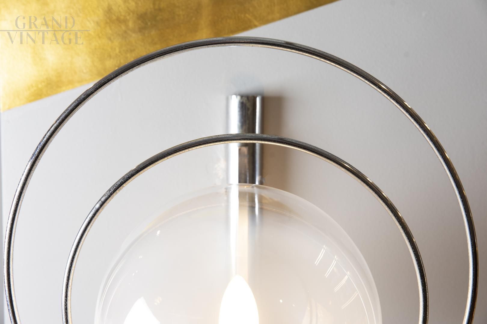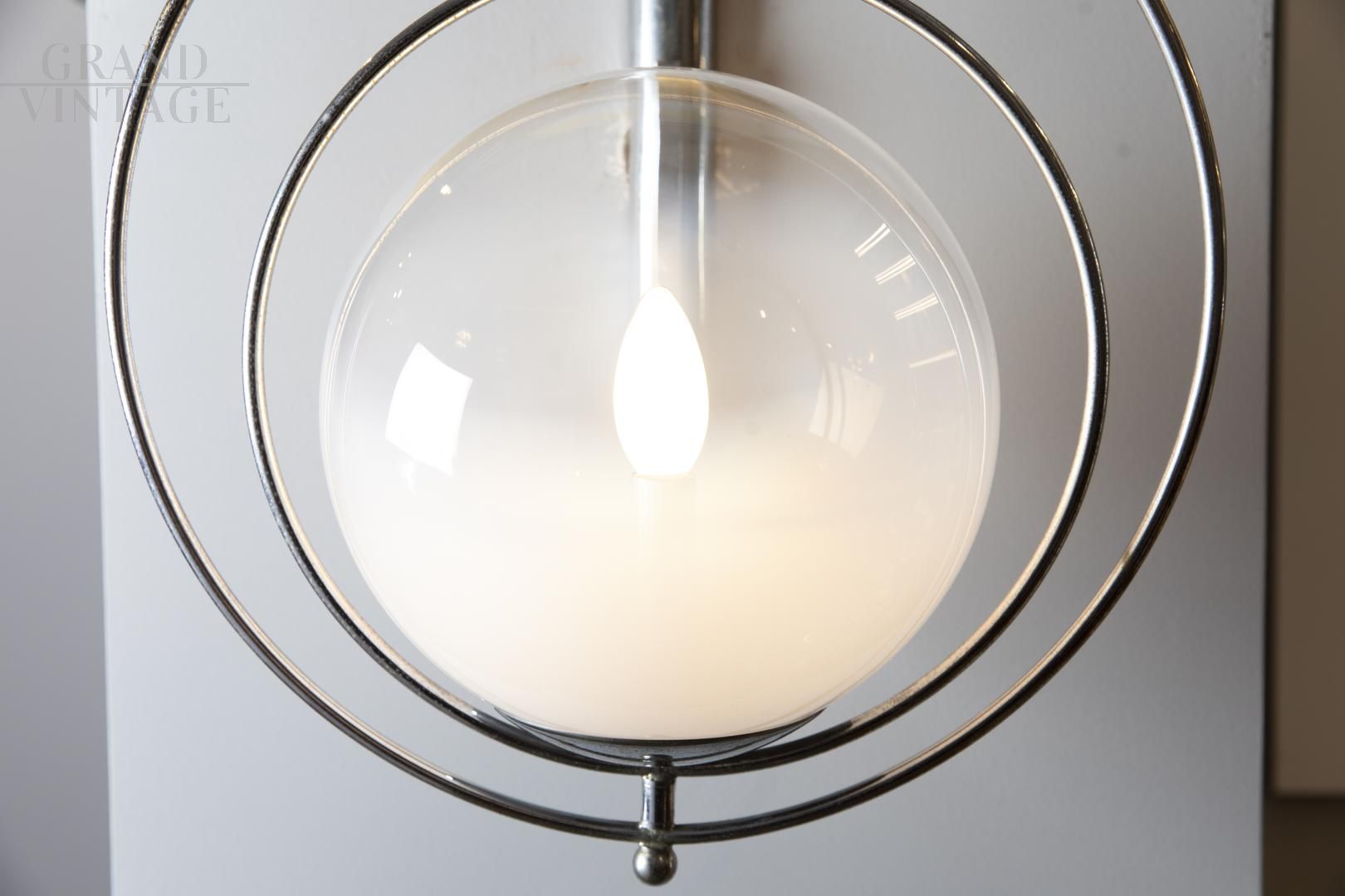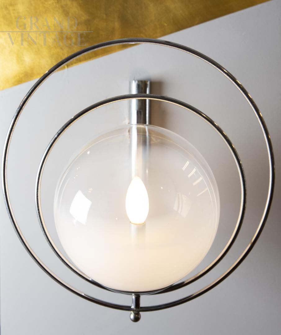 Pair of appliques wall lights produced by Mazzega, with sphere in transparent shaded white glass and structure with steel rings.