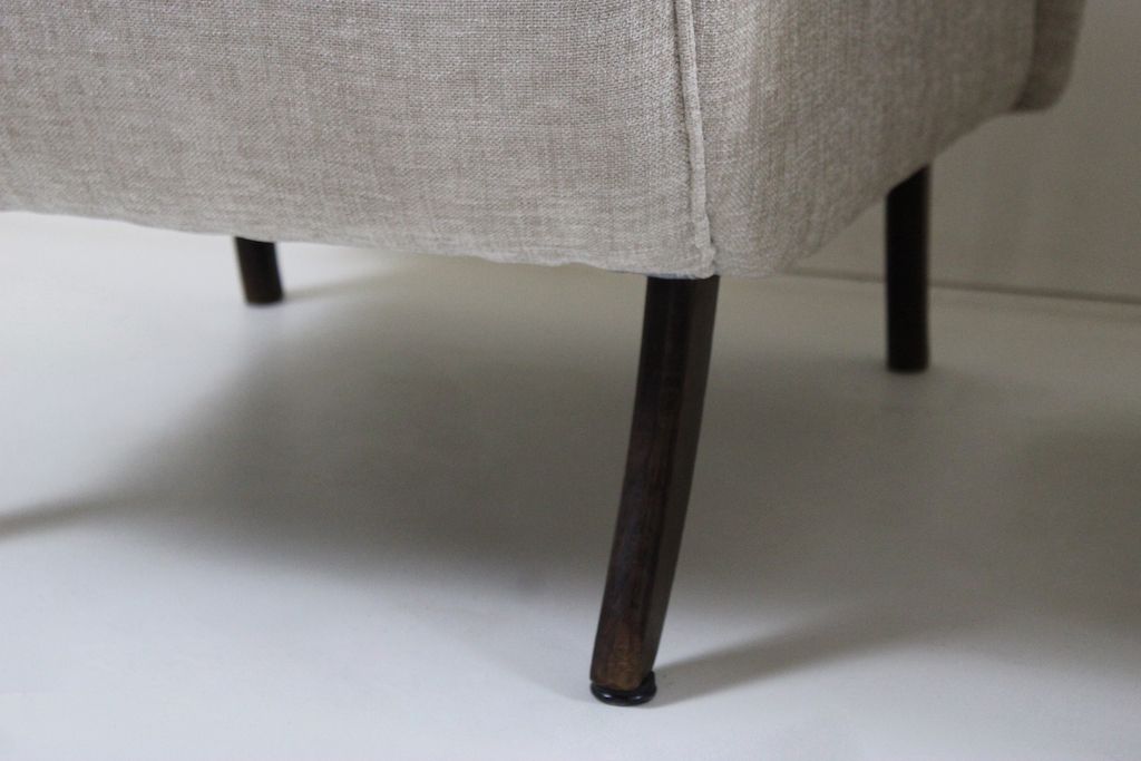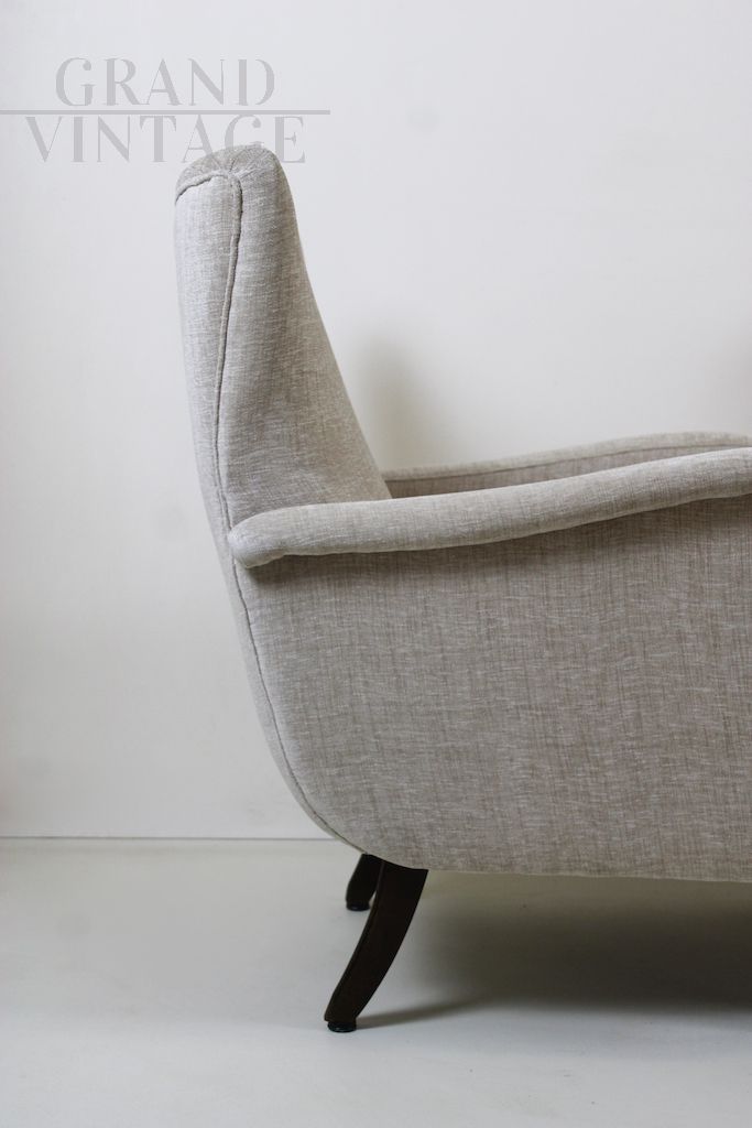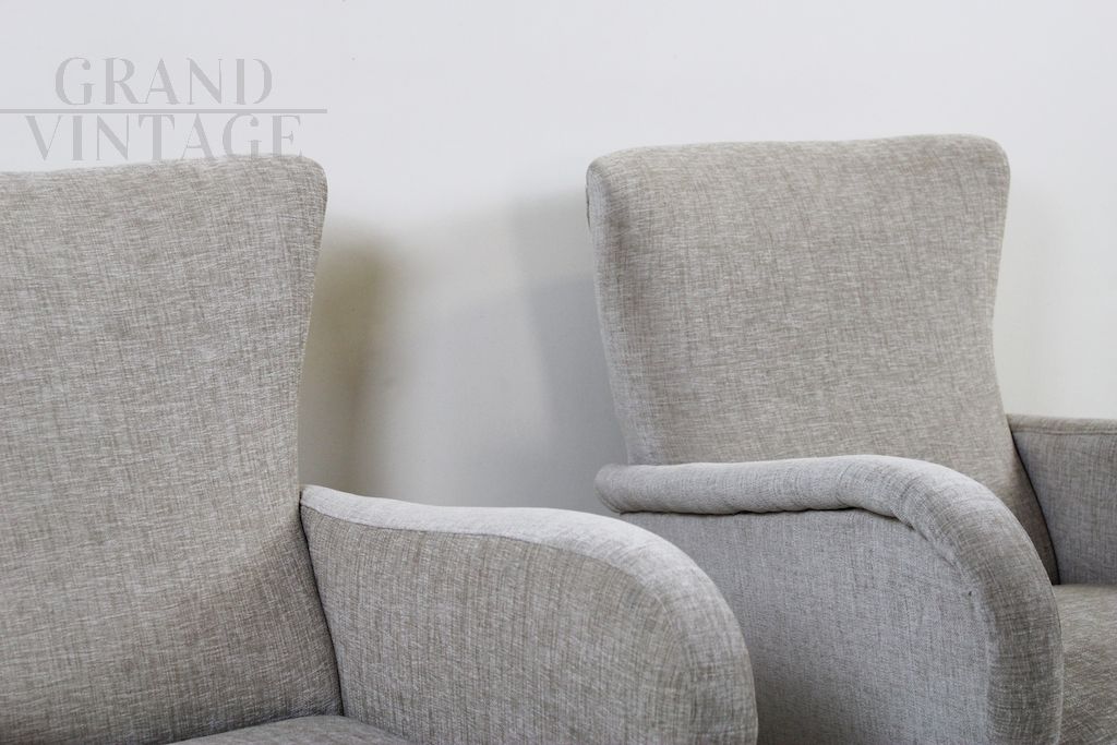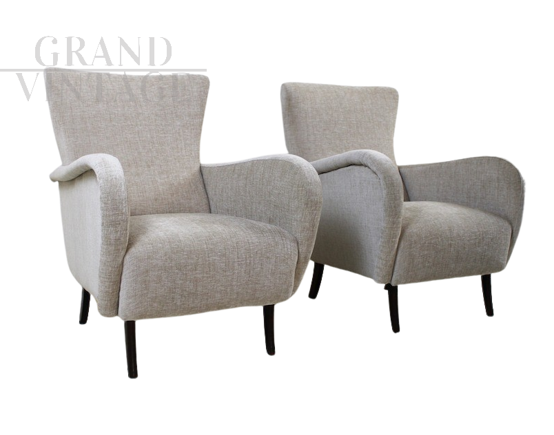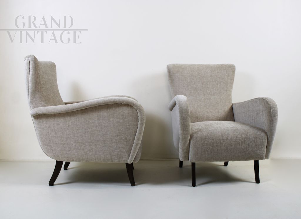 Elegant pair of mid-century Italian vintage armchairs from the 1950s with coeval solid walnut legs and new padding in bouclé cotton fabric in dove gray color.