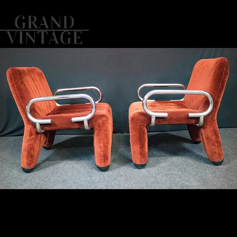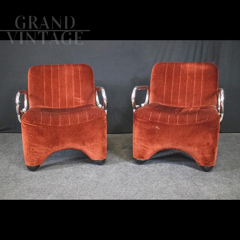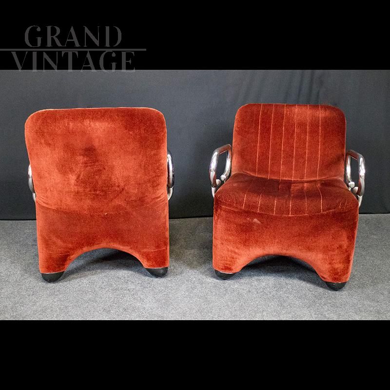 Pair of vintage 1960s space age style armchairs, with chromed steel structure and original brick-burgundy velvet upholstery of the time. The armchairs are in good condition with small signs of aging.