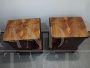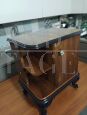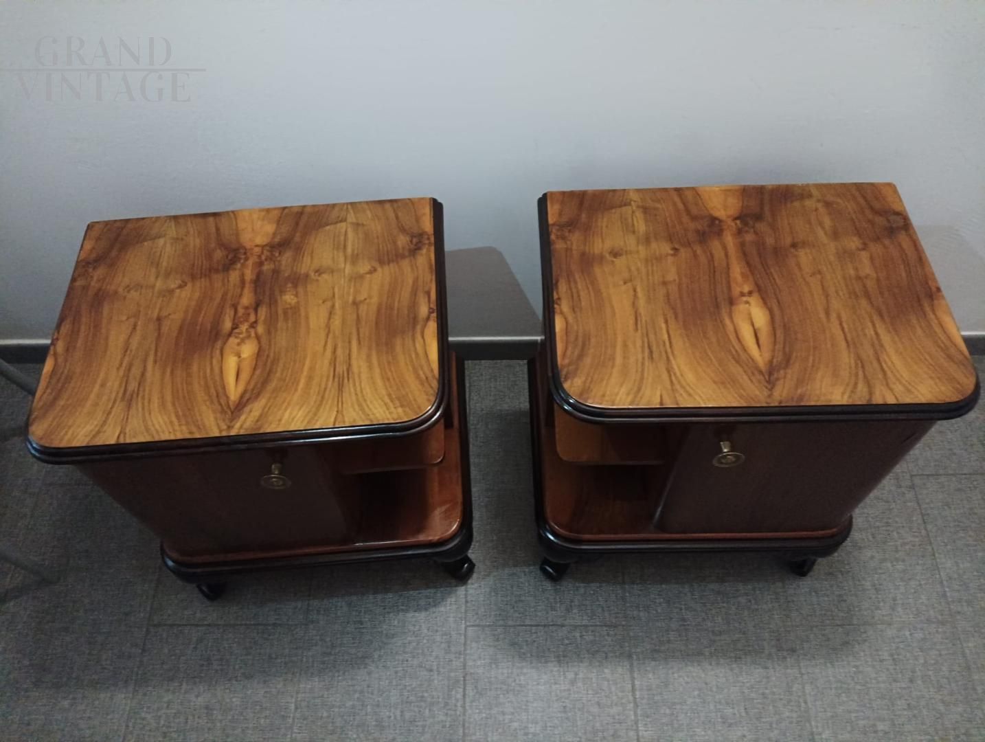 Splendid pair of Italian Art Deco bedside tables from 1930 - 1940, in flaming walnut briar with four ebonized feet in a baroque style cabriolet shape. Their beauty is bold and vibrant with a taste appropriate to the deco period. They are in perfect patina and in good condition. Since this is a pair of vintage bedside tables, although they have no defects, they may show slight signs of use and wear due to age.