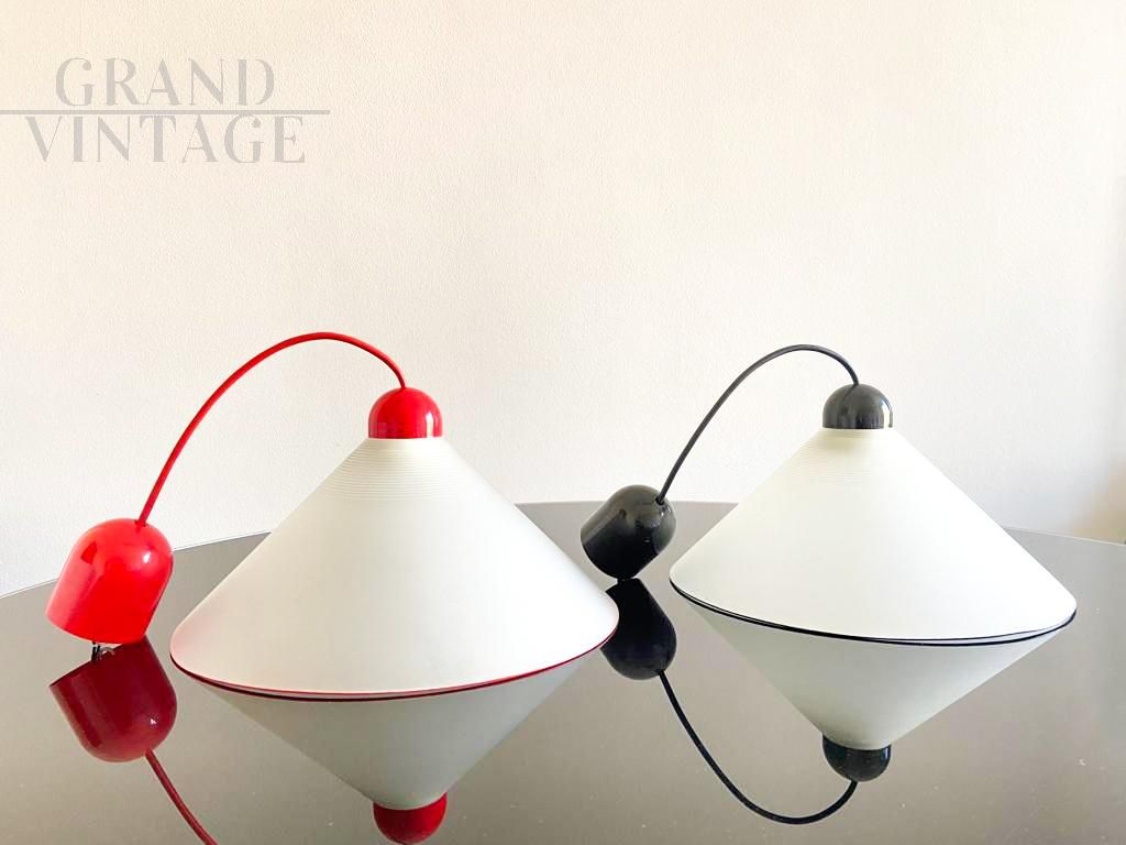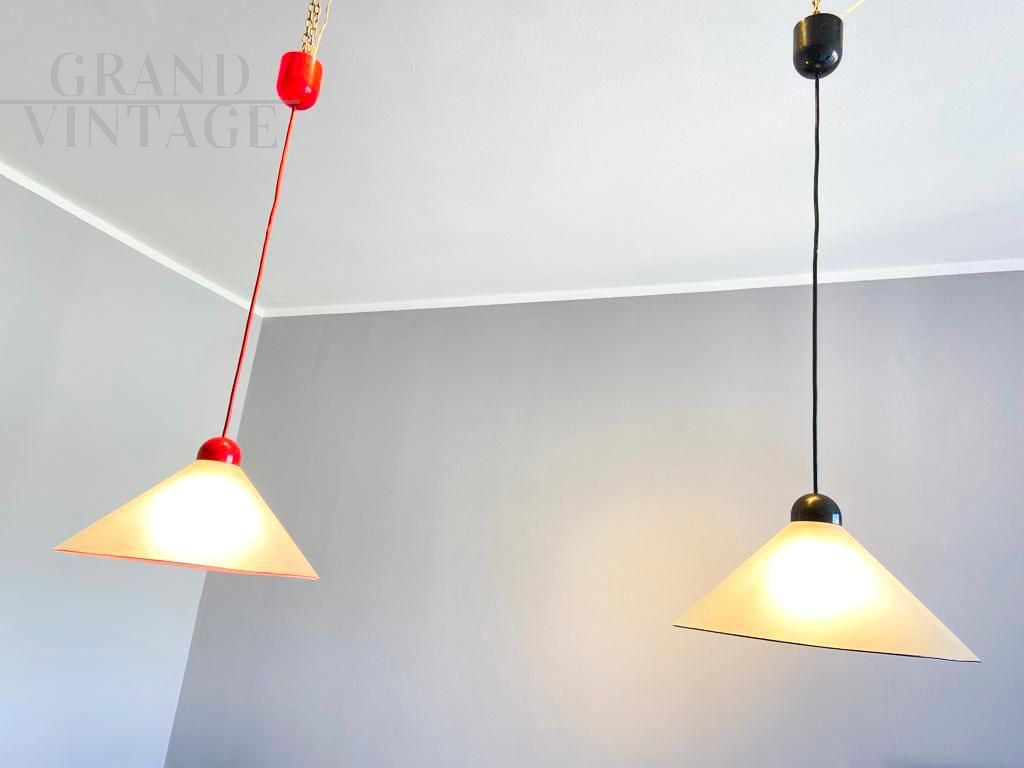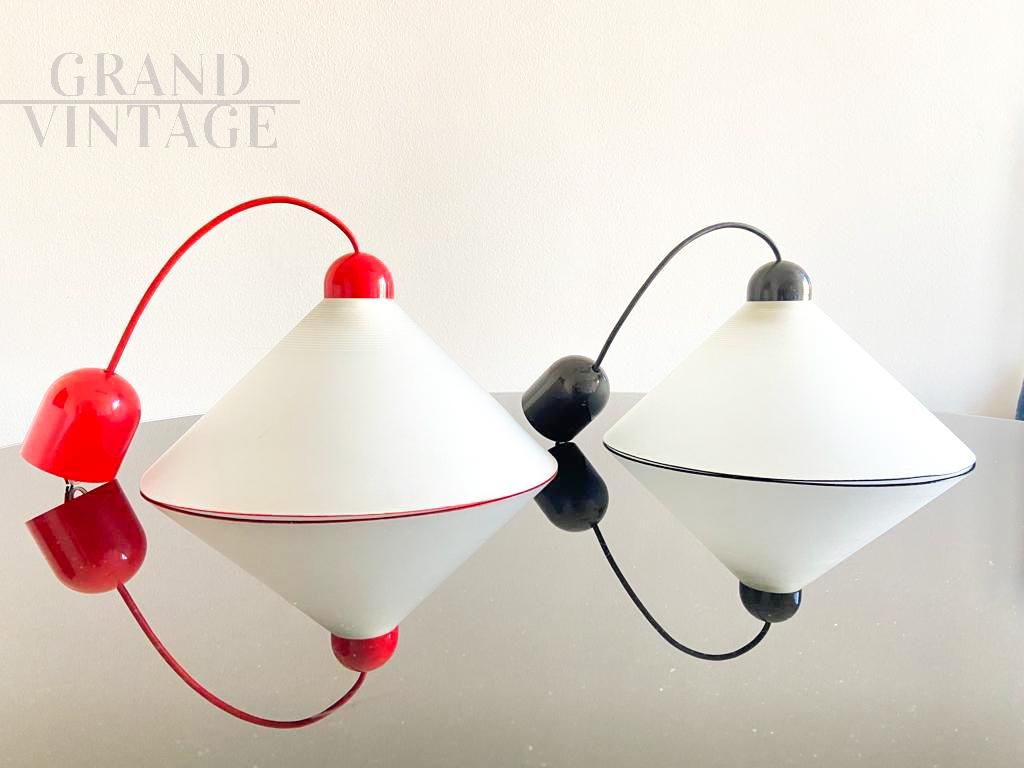 Pair of Italian 70s mid-century pendant lights in opaline glass with red and black colored edges, very scenic and iconic, in excellent condition.