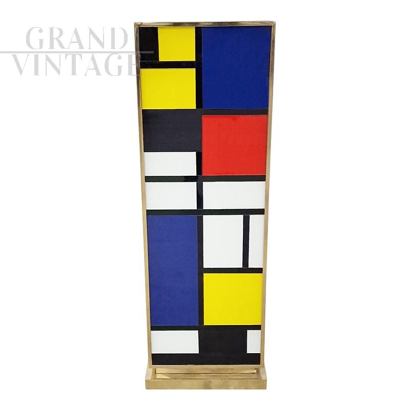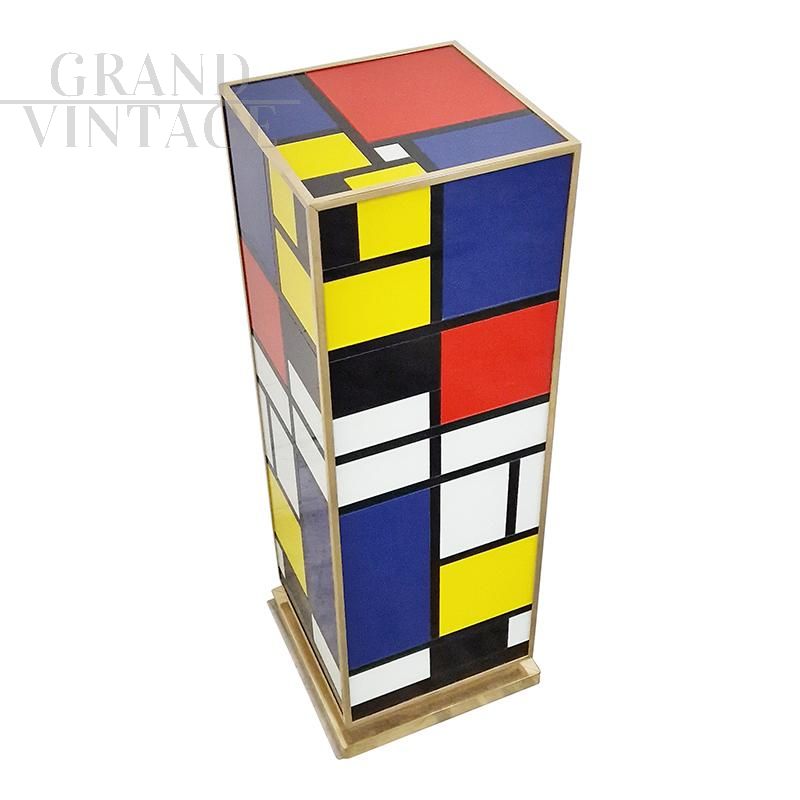 Pair of low decorative columns, entirely handmade, in brass and multicolored Murano glass.