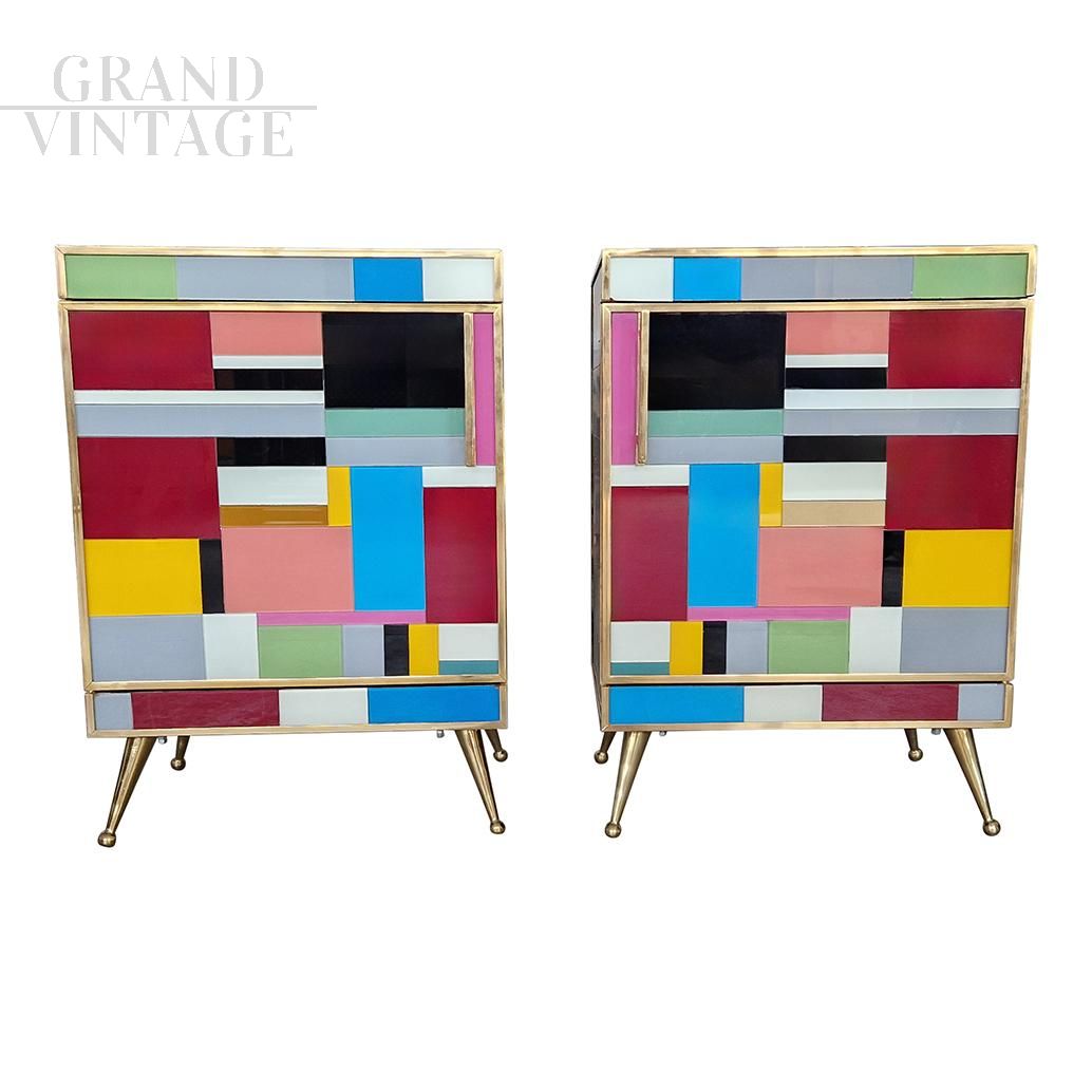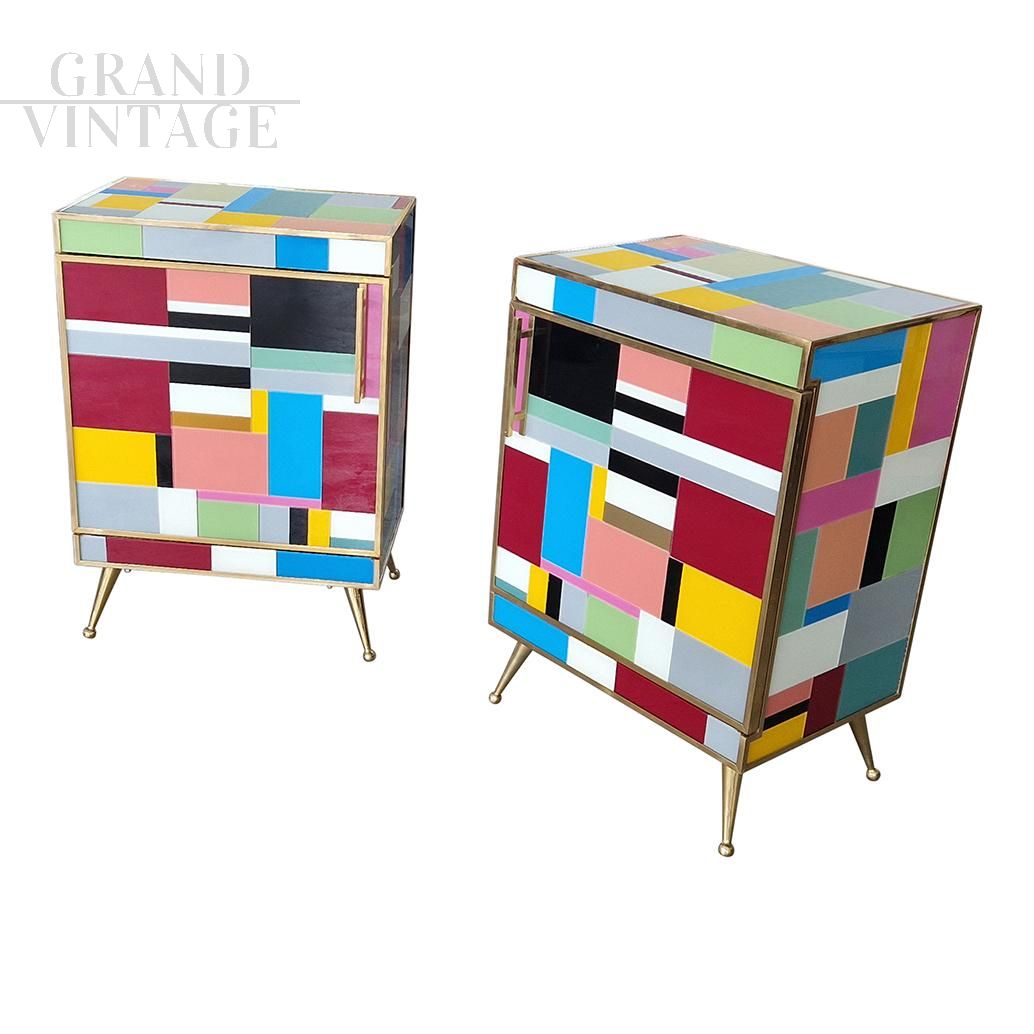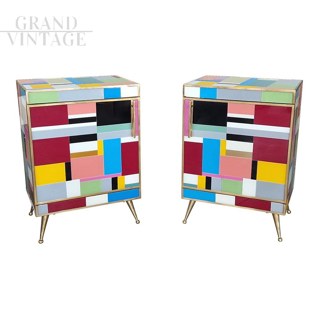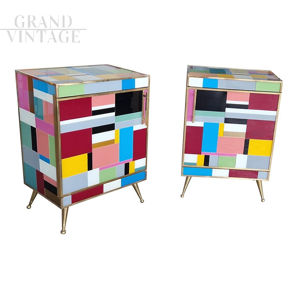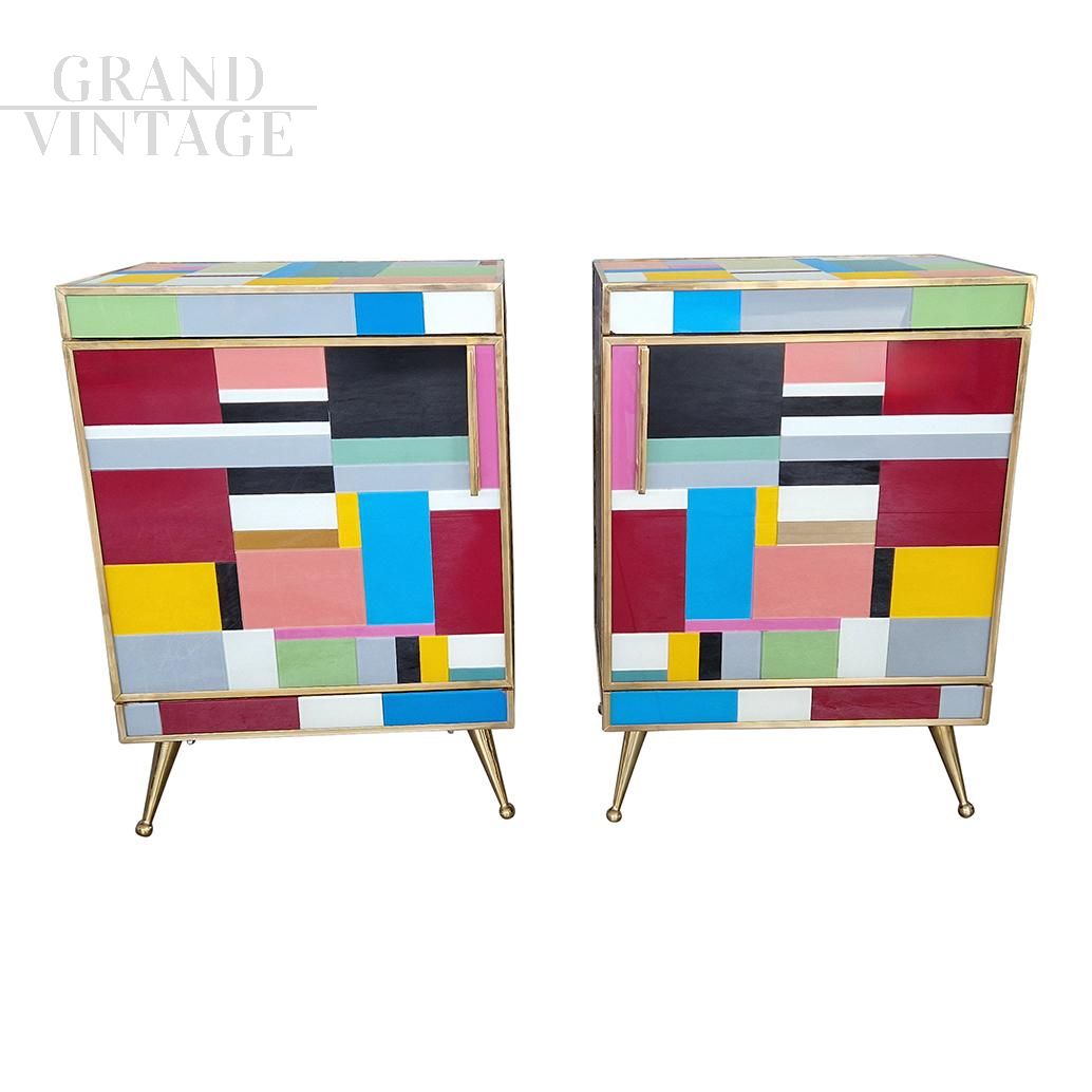 Pair of bedside tables with one door, entirely handmade, with wooden structure covered with colored glass, the right and left bedside tables are complementary; profiles, handles and feet in golden brass. Internal wooden shelf.