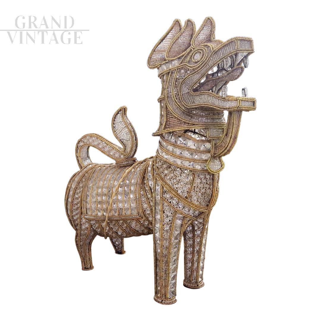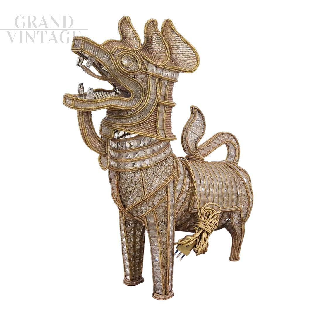 Pair of table lamps in the shape of guardian lions, in an oriental ethnic style, made entirely by hand, with an iron structure entirely covered in transparent and beige Murano glass beads. Each lamp contains three lights with E14 socket.