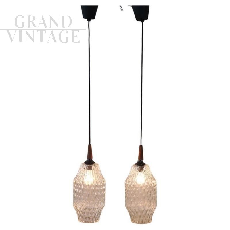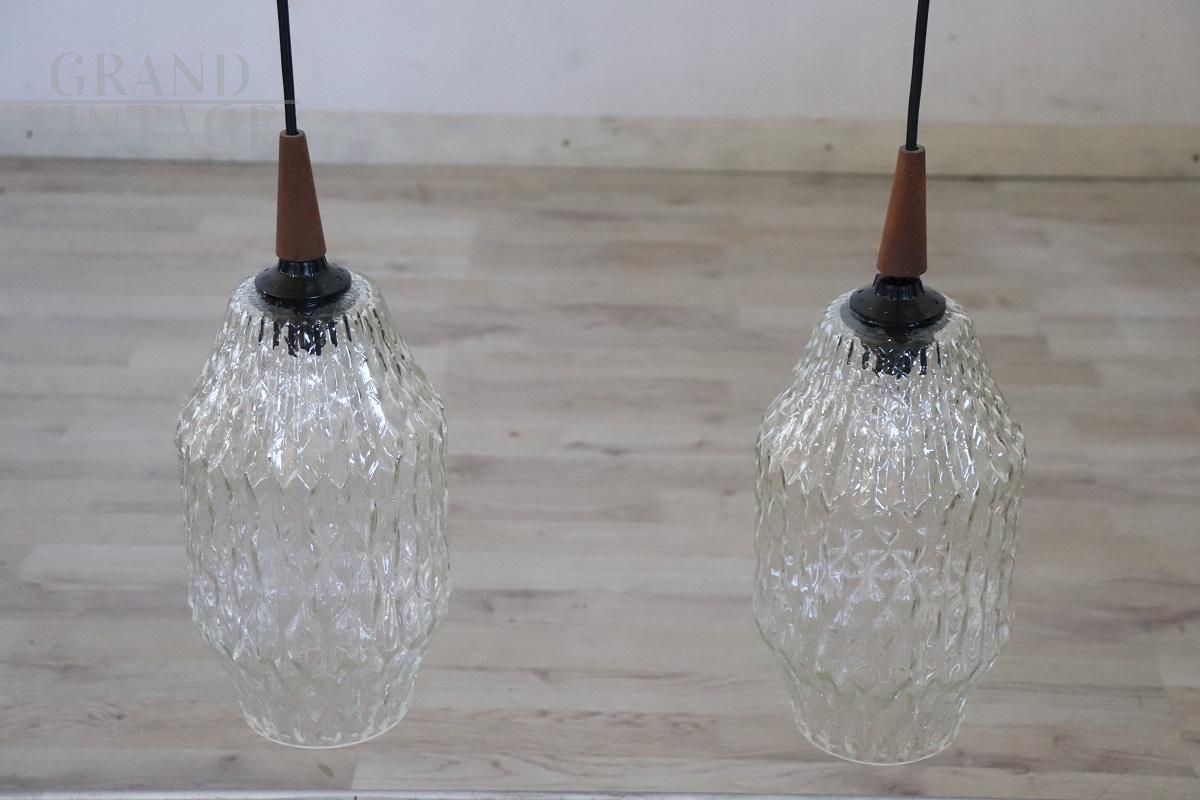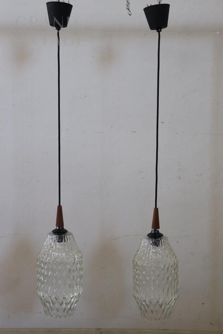 Pair of Murano glass pendant lamps with relief decorations, 1960s