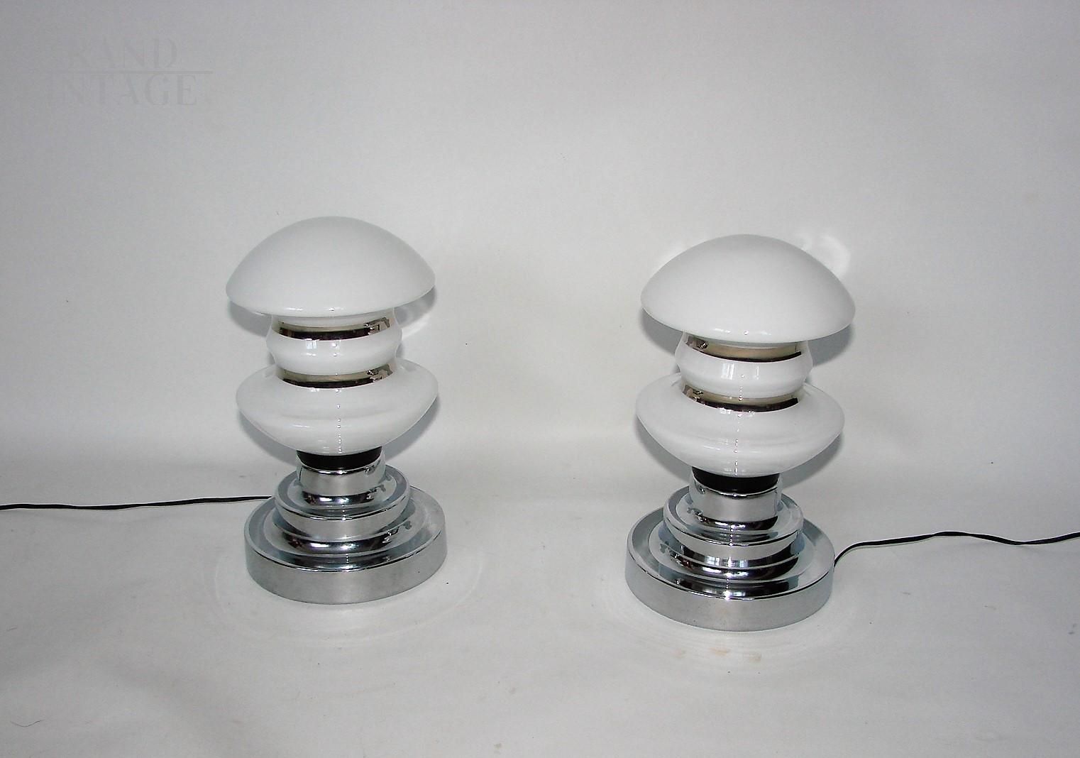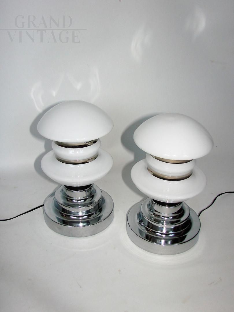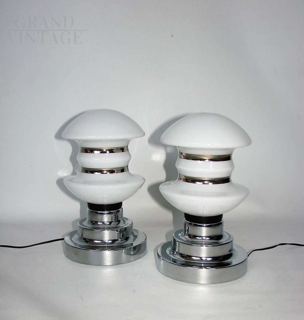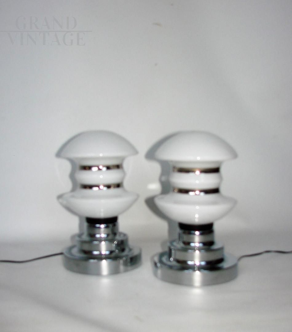 Pair of 60s modern antique bedside lamps, space age style, with opal glass and chromed metal structure. Lamps require E14 type bulbs.