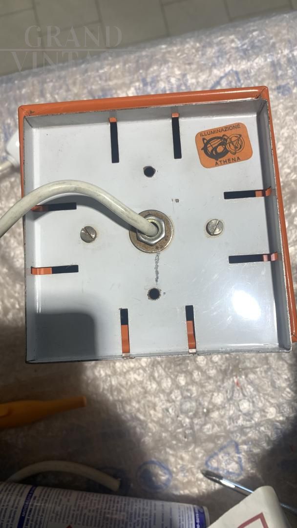 Fantastic pair of vintage cube-shaped wall or ceiling lights made by the Athena Illumination company in metal and orange plastic, in two different sizes, Italian design. Both have the brand on the bottom. For assembly it is necessary to remove the orange part and apply the lamp to the wall or ceiling using 2 wall plugs. In good condition, they show some natural signs of aging on the metal structure. Each lamp has a type e 27 bulb socket.
