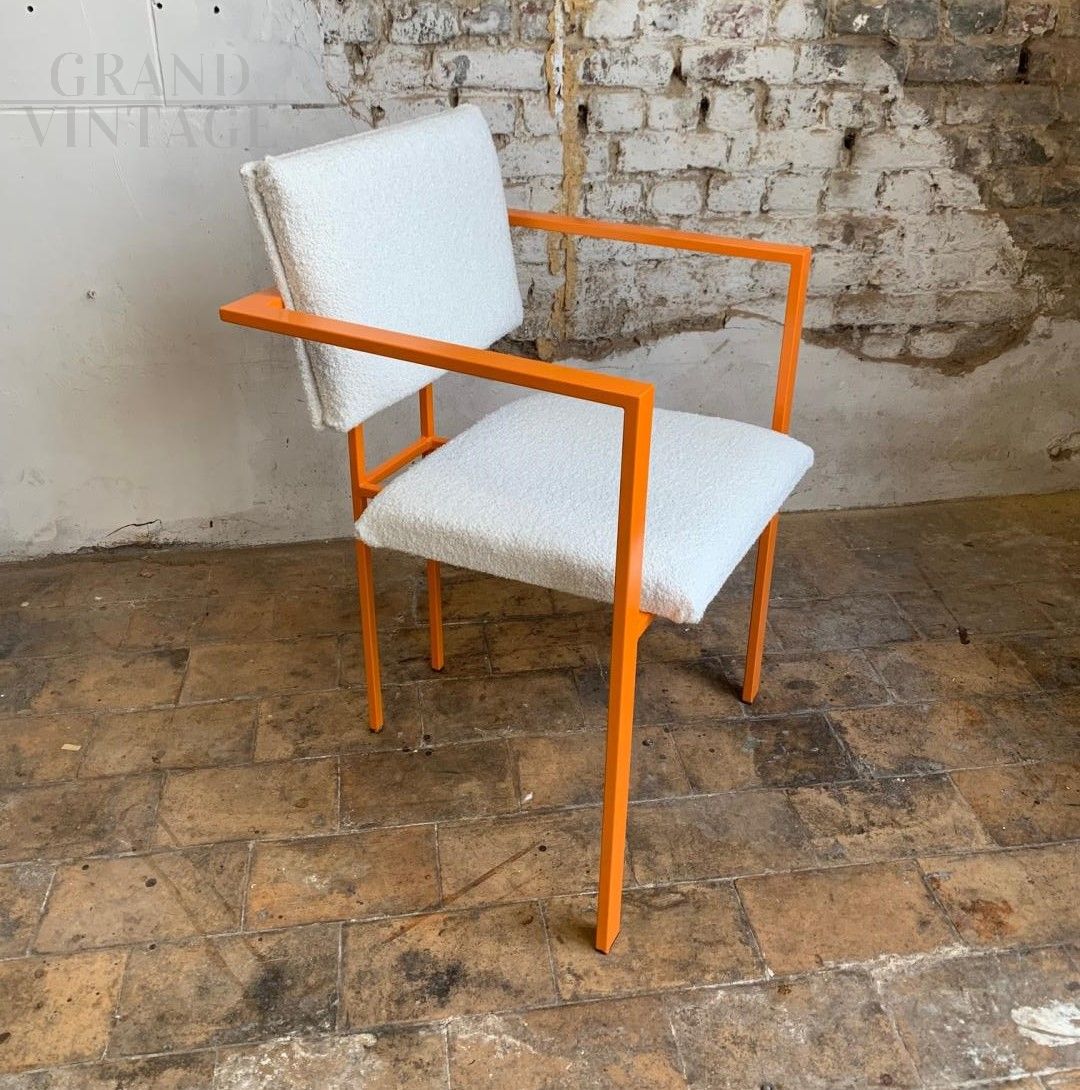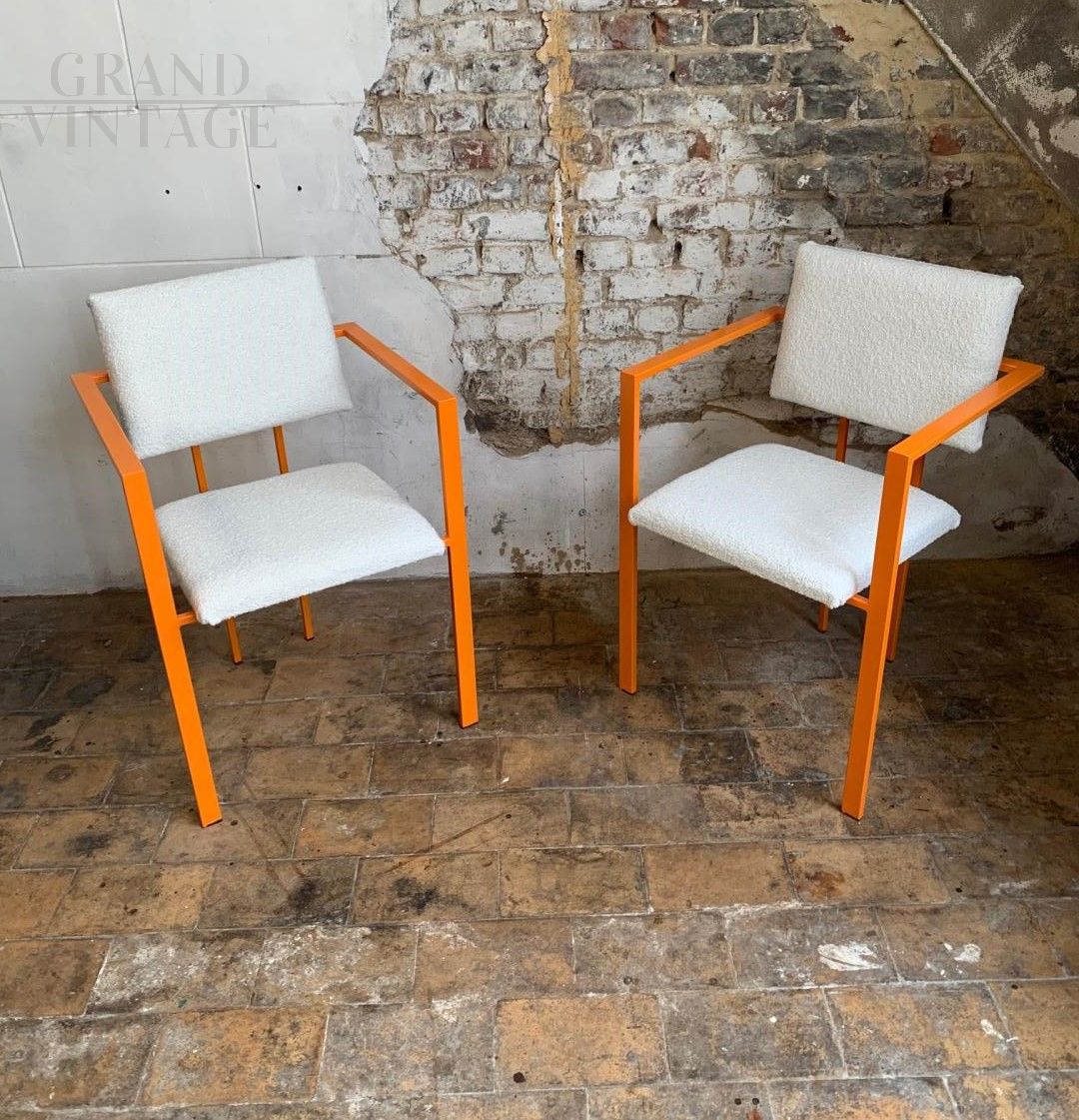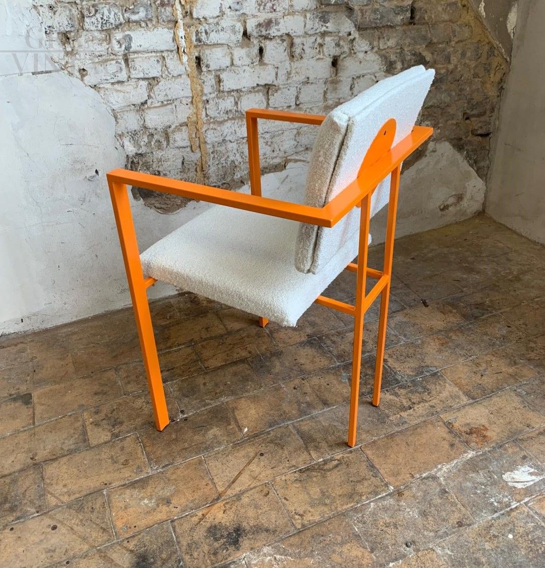Pair of postmodern armchairs in orange lacquered metal and white bouclé curly wool fabric, perfect for adding a touch of color to your home!