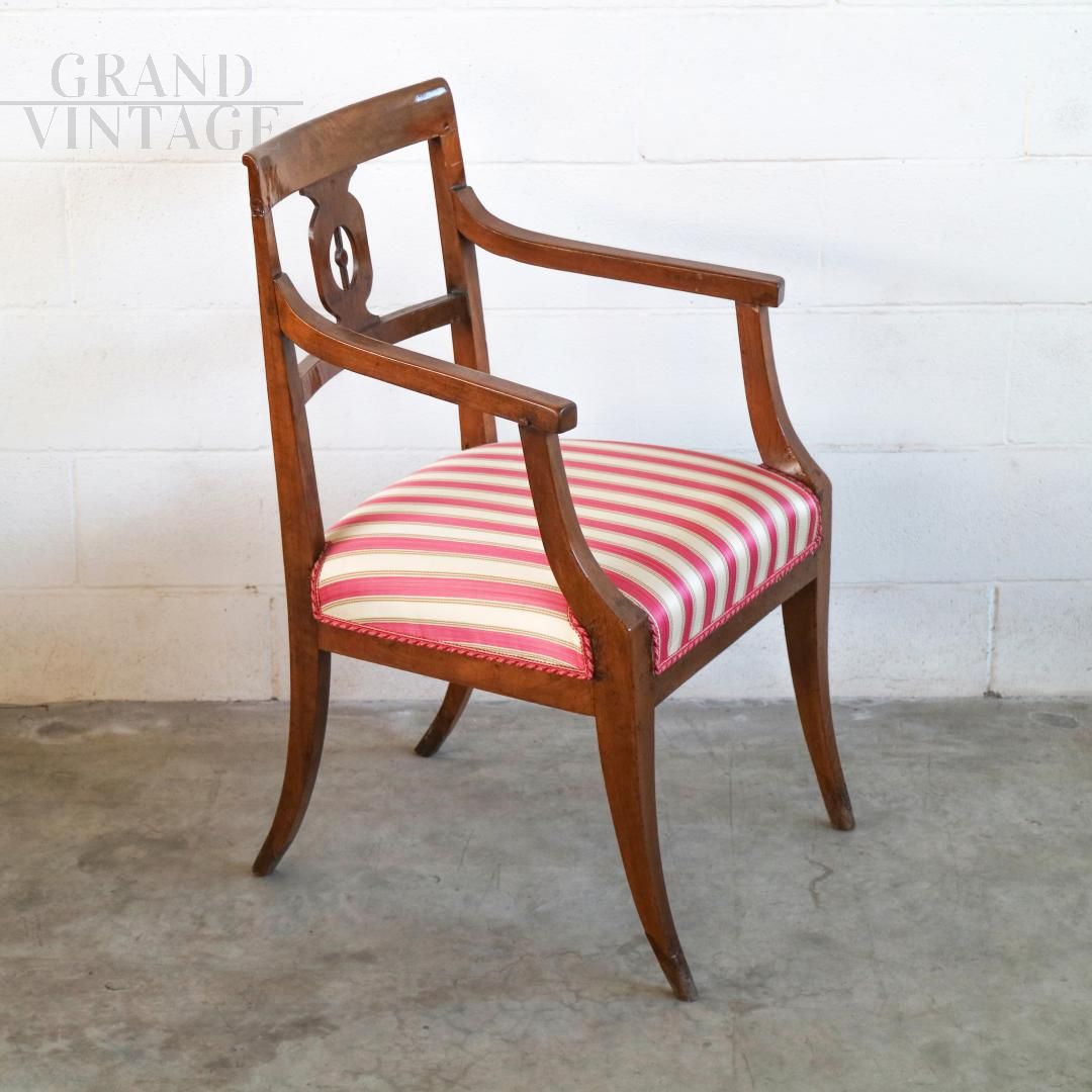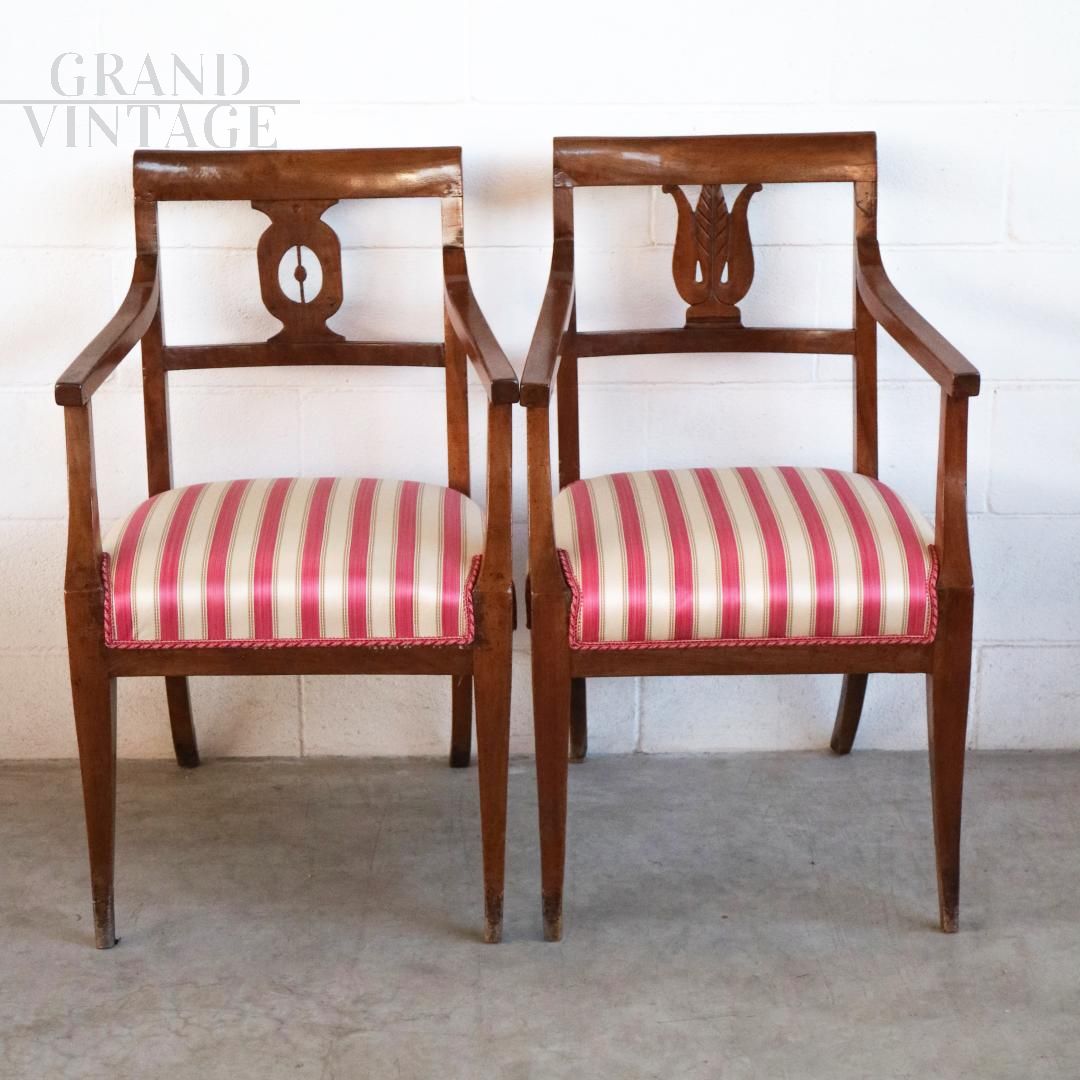 Pair of original chairs from the late 18th - early 19th century, in solid wood, with a different carved motif on the backrest and padded seat covered in elegant red and white striped fabric.