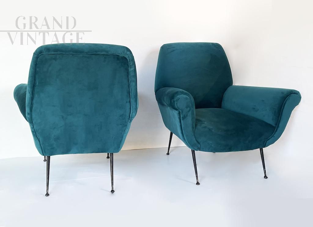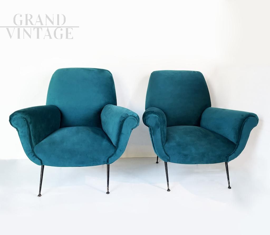 Particular pair of armchairs from the 1950s in the style of designer Gigi Radice. Of Italian manufacture, the armchairs have a wooden structure and conical-shaped brass feet with the typical design of the 1950s. The covering is in petrol blue micro velvet. In perfect condition, as shown in the photo.