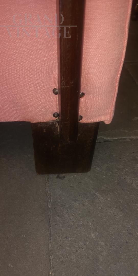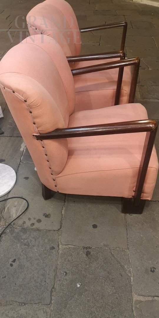 Beautiful pair of 50s armchairs in original antique pink fabric, with square armrest and "paddle" foot.