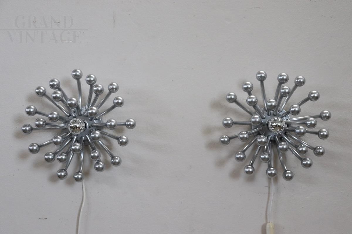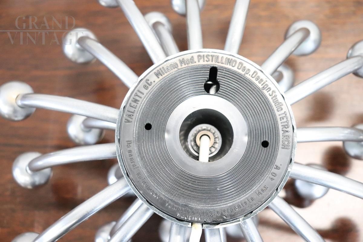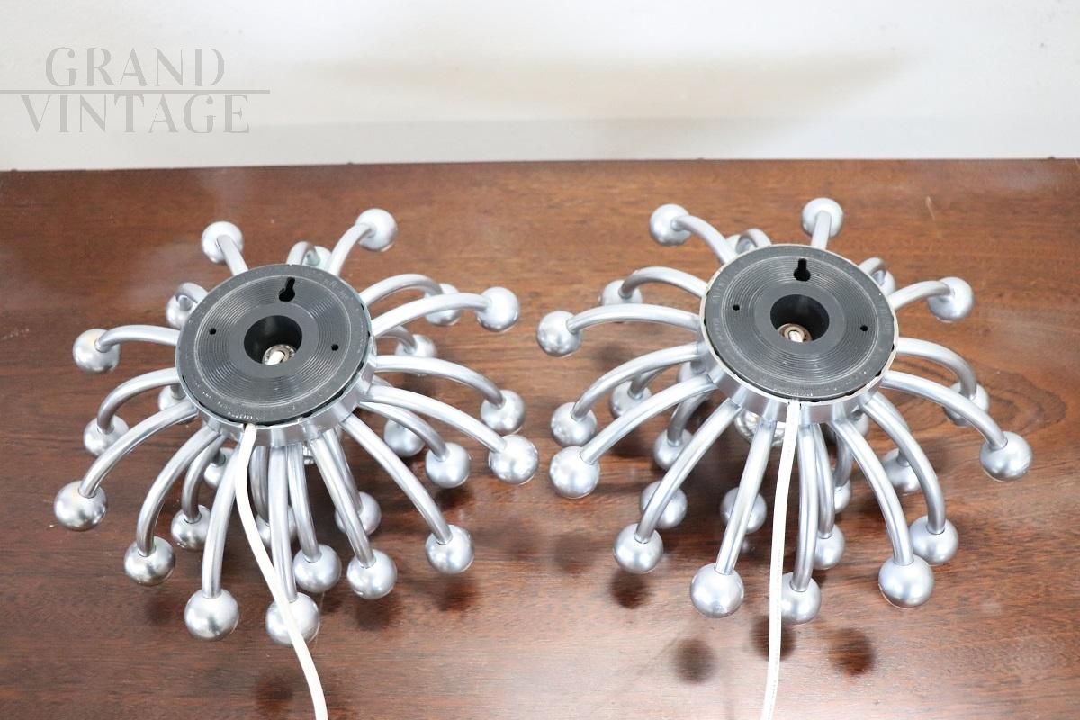 Extraordinary pair of Italian design lamps from 1970, with Valenti & C. trademark under the base. Pistillo model designed by Studio Tetrach. The conditions are excellent, the electrical system has been rewired for immediate use. Their design inspired by the pistil of flowers is a fantastic work of design art that draws inspiration from nature. The bulb positioned in the center, once turned on, radiates light through the pistils creating a truly amazing scenographic effect! All your guests will be happy to see this lamp. You can choose to place them on the wall, on a coffee table or use them on bedside tables. Wherever you decide to place them, these Italian lamps will become the focal point of the room.