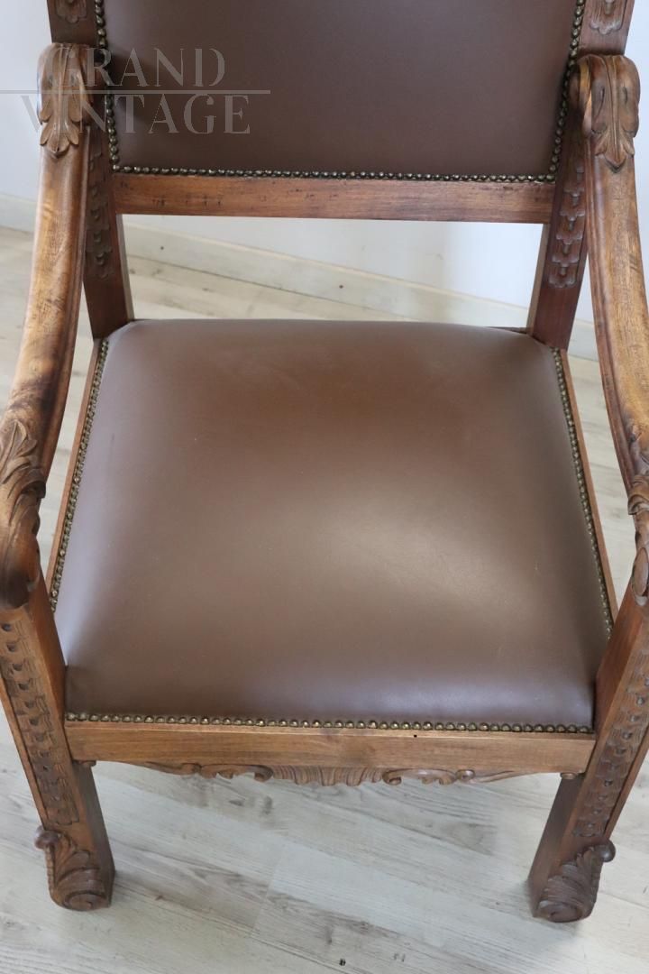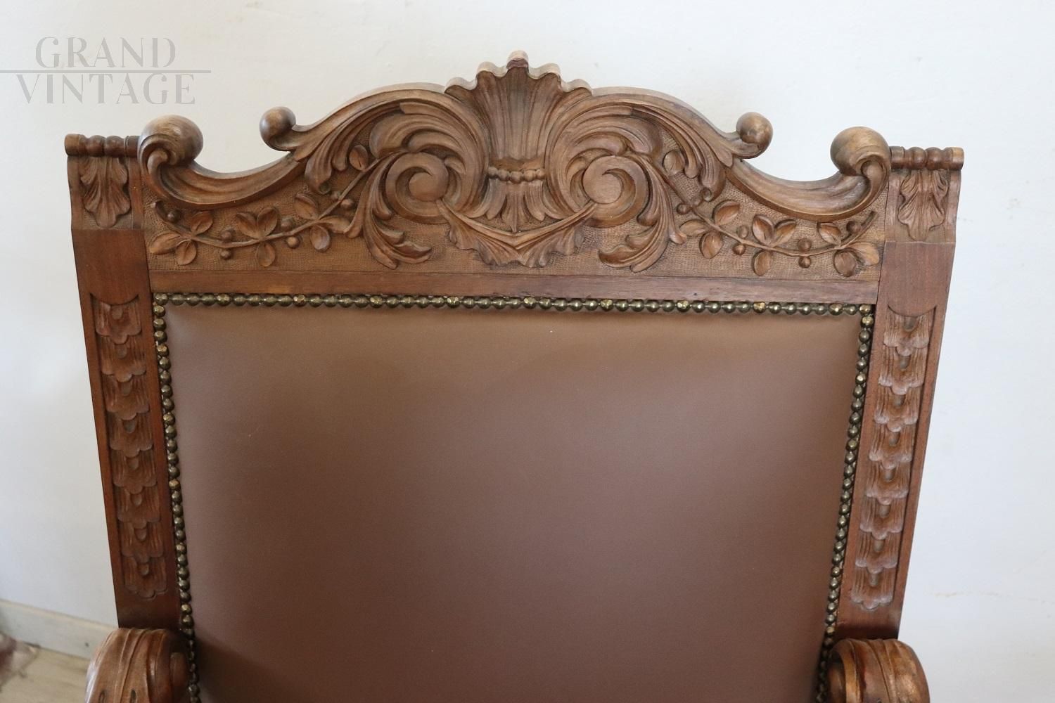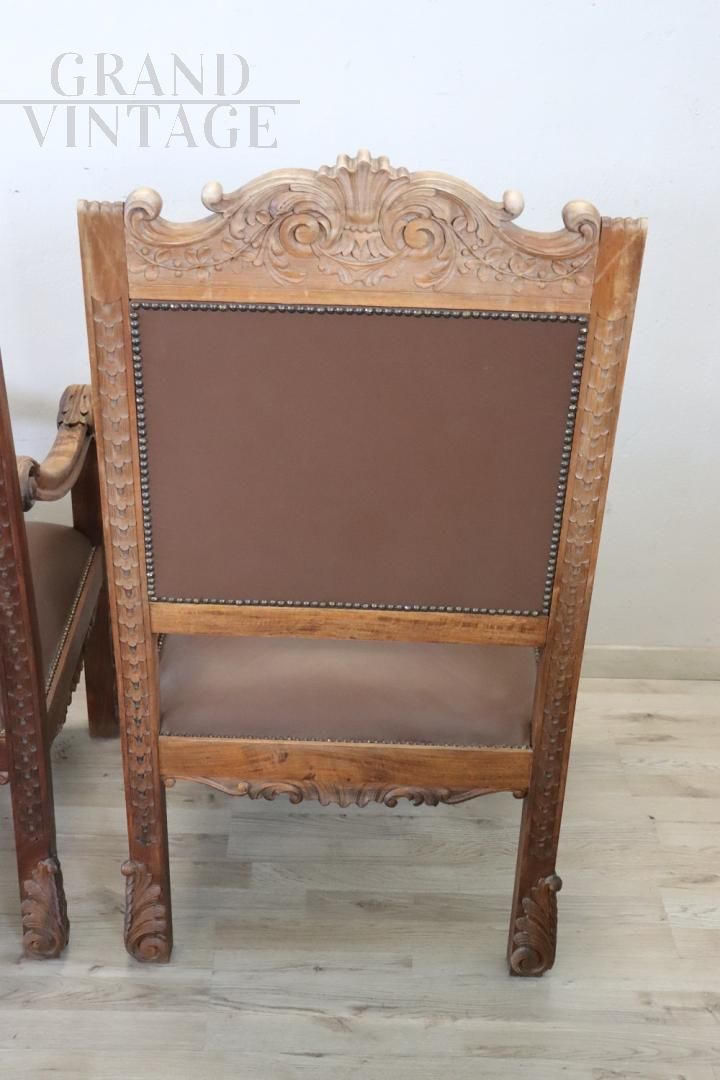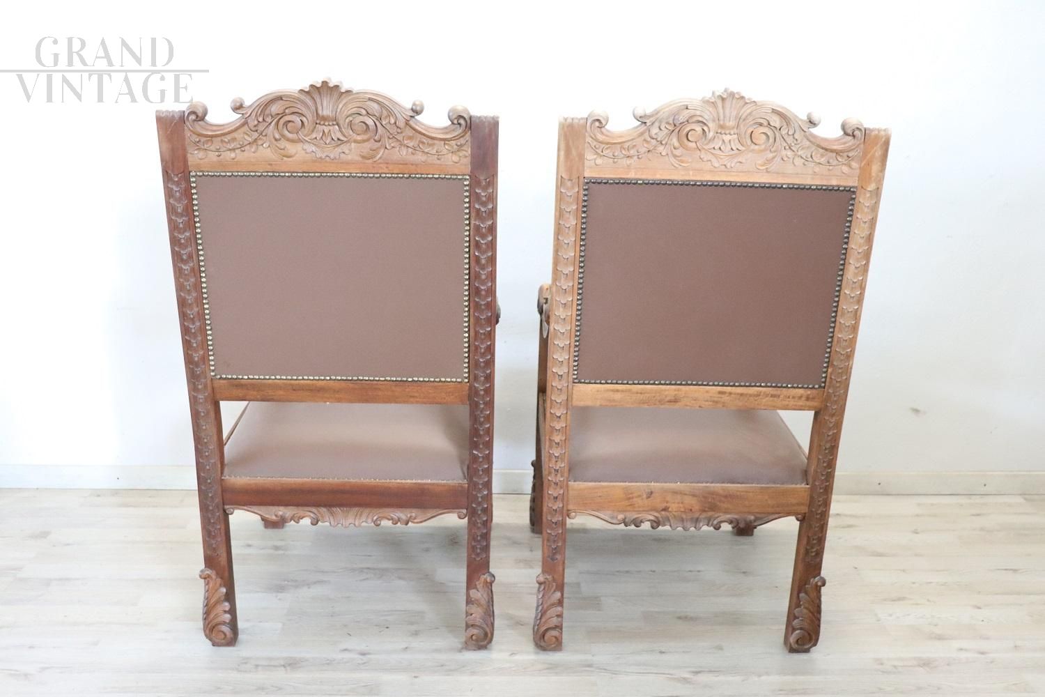 Pair of throne armchairs in perfect Italian Renaissance style, made at the end of the 19th century in carved solid walnut wood. The finely carved wooden backrest features a very complex decoration. Note how the decoration carved into the wood is also present on the back of the backrest of the two thrones, beautiful to be admired from all sides. The backrest and seat are padded and covered in brown eco-leather embellished with golden brass studs. Used but in excellent condition, both the wood, the padding and the imitation leather. Price negotiable.