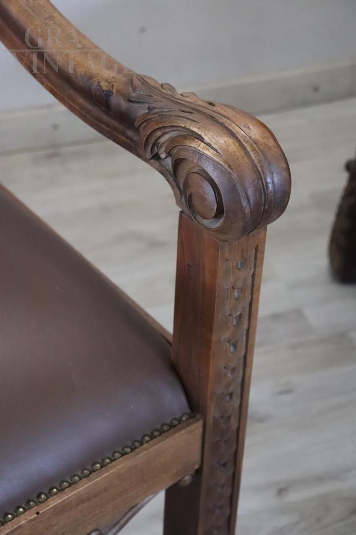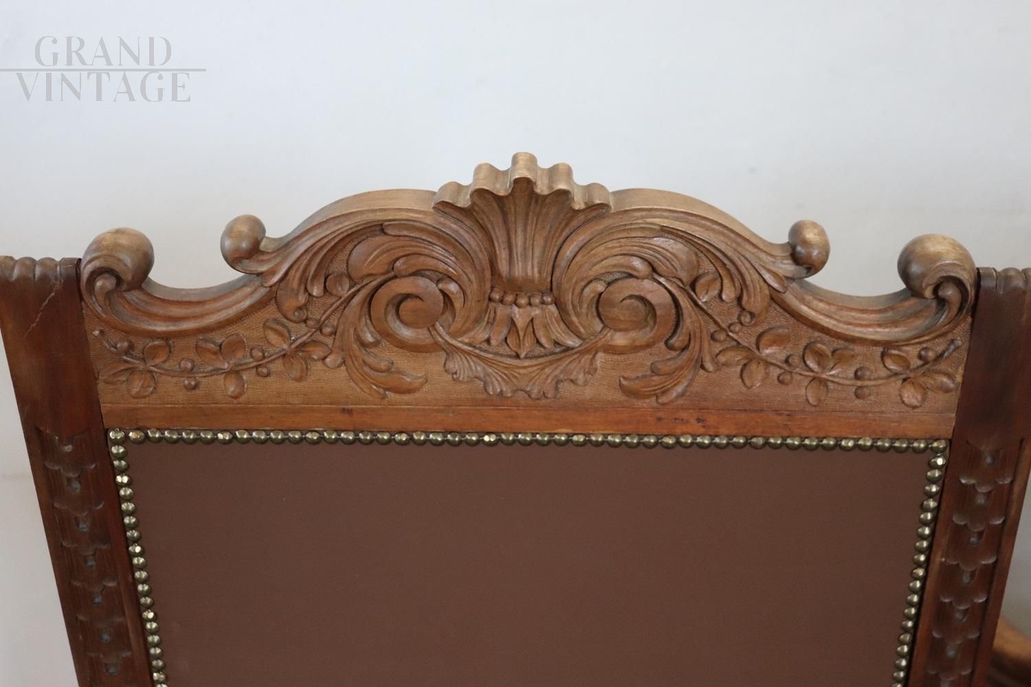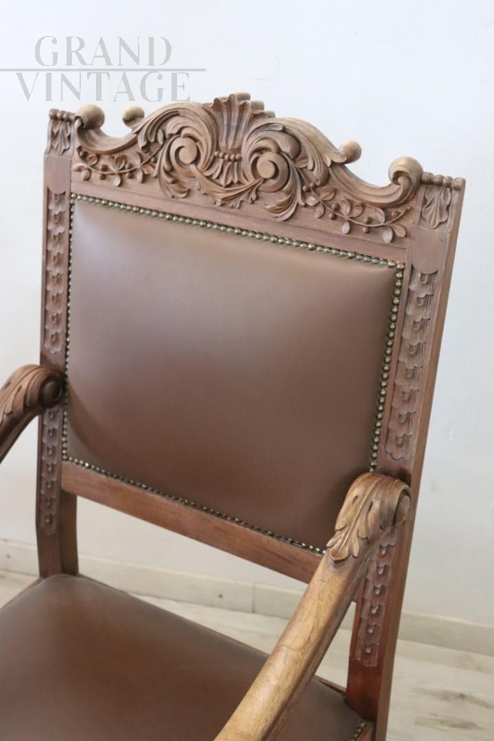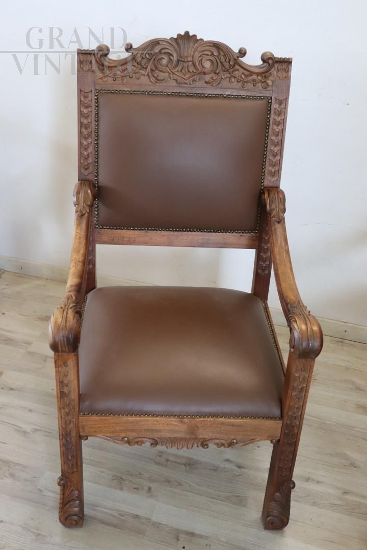 Pair of throne armchairs in perfect Italian Renaissance style, made at the end of the 19th century in carved solid walnut wood. The finely carved wooden backrest features a very complex decoration. Note how the decoration carved into the wood is also present on the back of the backrest of the two thrones, beautiful to be admired from all sides. The backrest and seat are padded and covered in brown eco-leather embellished with golden brass studs. Used but in excellent condition, both the wood, the padding and the imitation leather. Price negotiable.