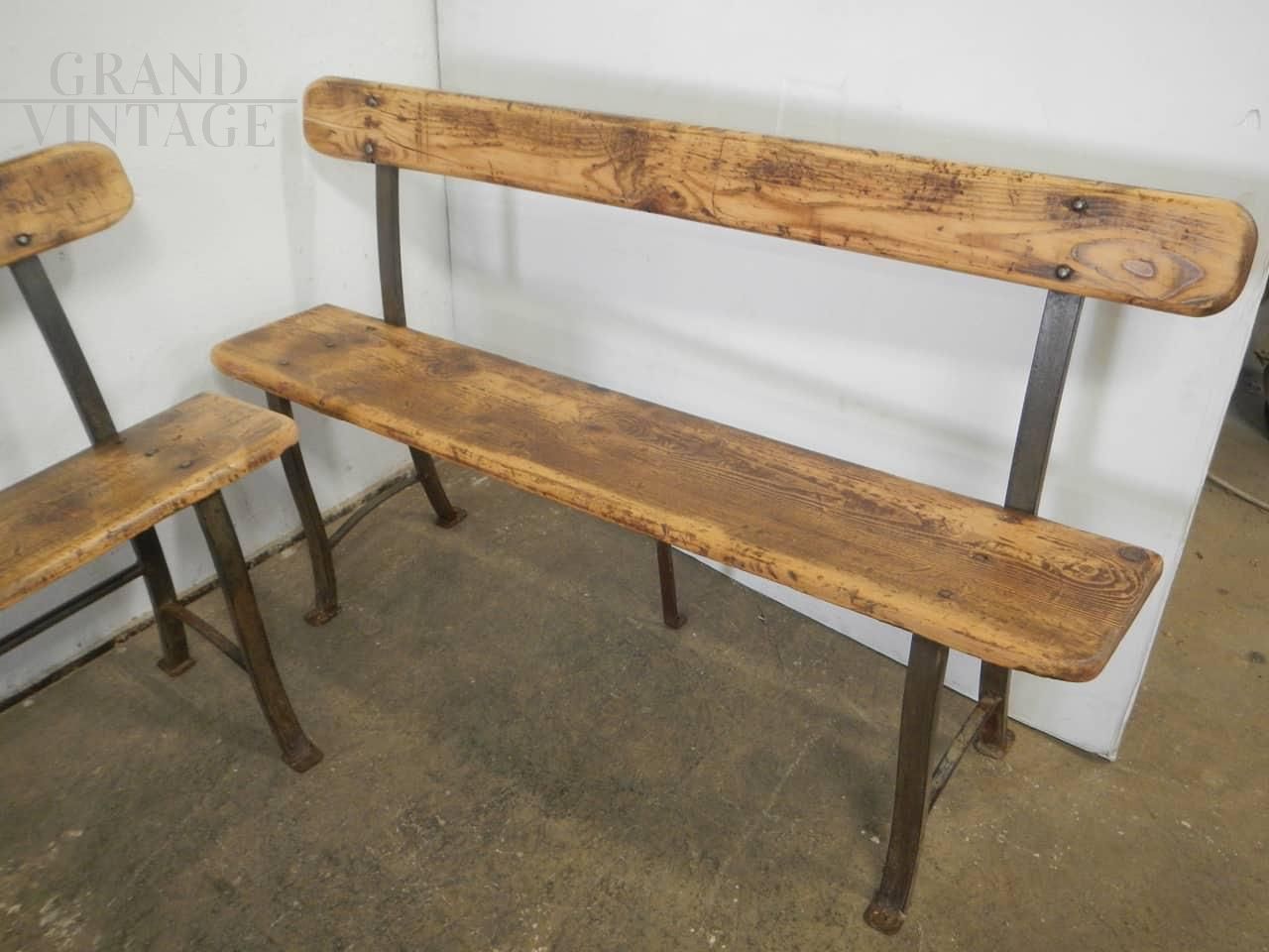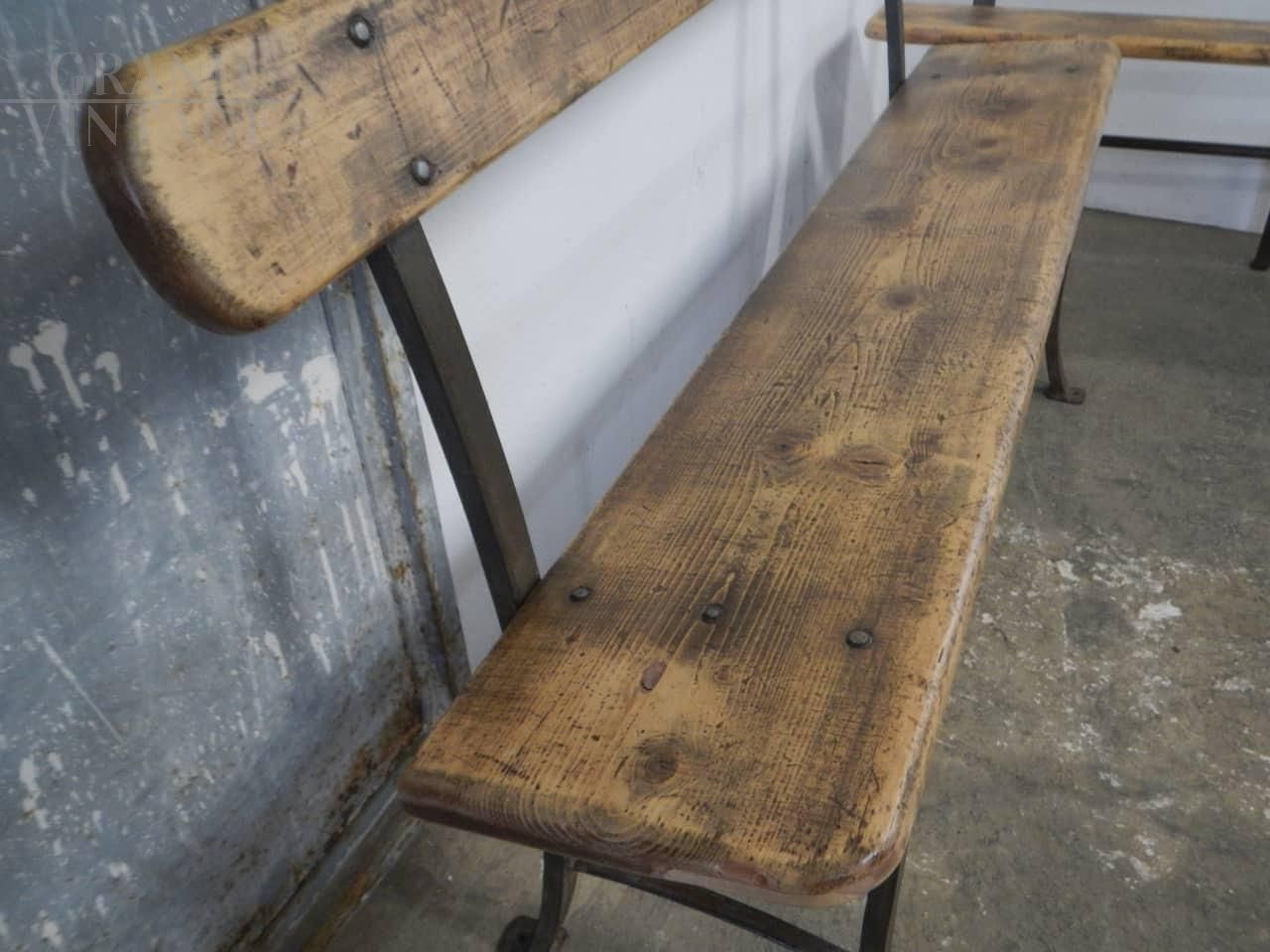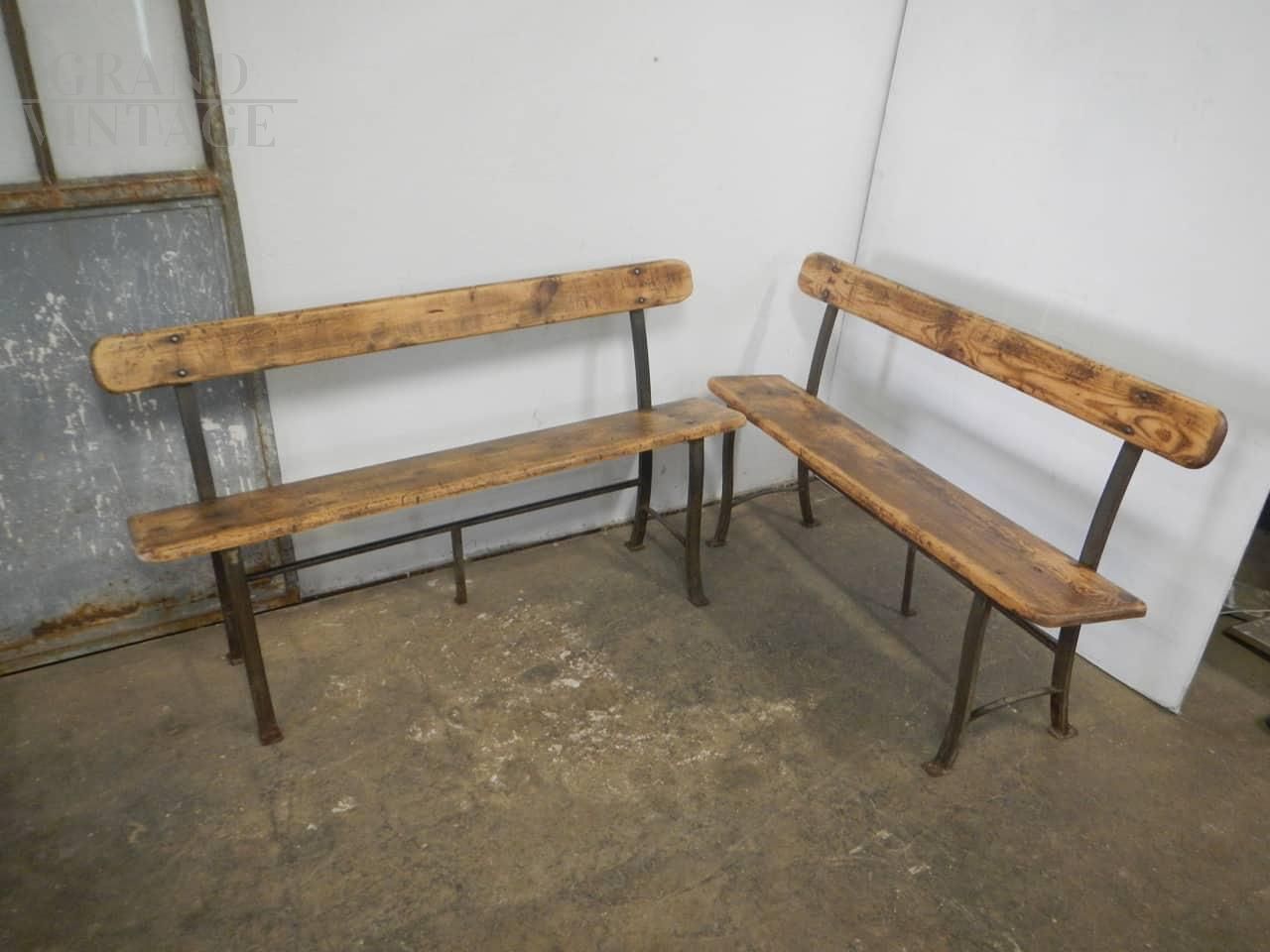 Pair of rustic vintage benches in fir wood and iron, of the same workmanship but of different dimensions: the smallest measures 137 x 26 cm, height 79 cm, seat height 46 cm. The largest measures 143 x 26 cm with a height of 81 cm. In good condition, restored and treated with wood wax and iron varnish. Not suitable for prolonged outdoor exposure without cover.
