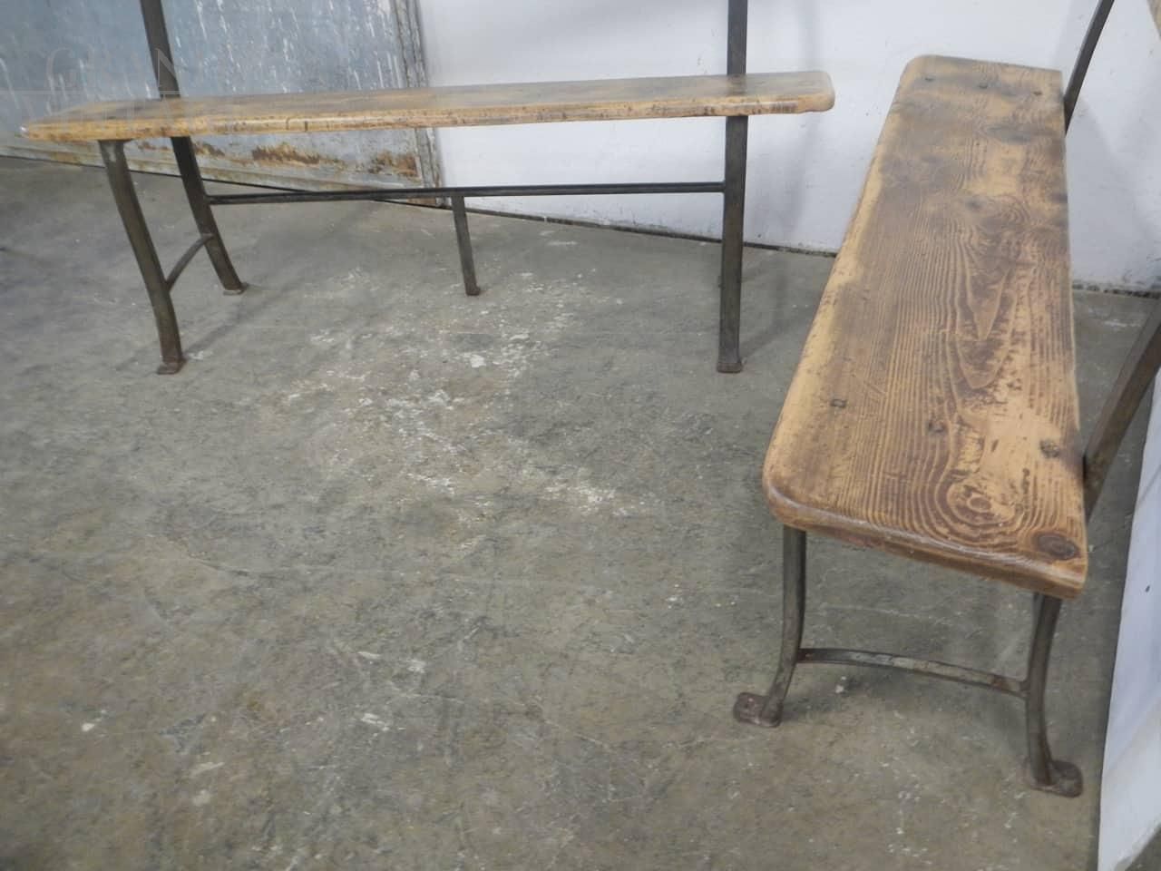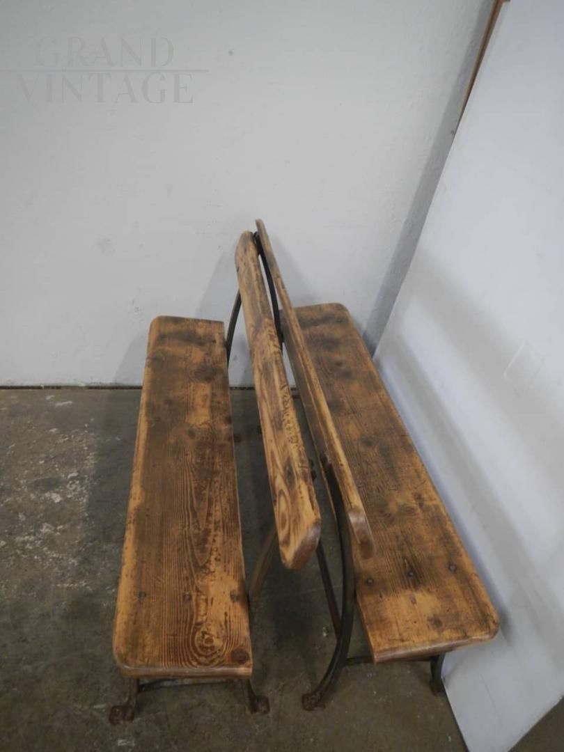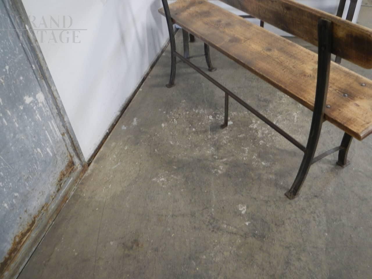 Pair of rustic vintage benches in fir wood and iron, of the same workmanship but of different dimensions: the smallest measures 137 x 26 cm, height 79 cm, seat height 46 cm. The largest measures 143 x 26 cm with a height of 81 cm. In good condition, restored and treated with wood wax and iron varnish. Not suitable for prolonged outdoor exposure without cover.