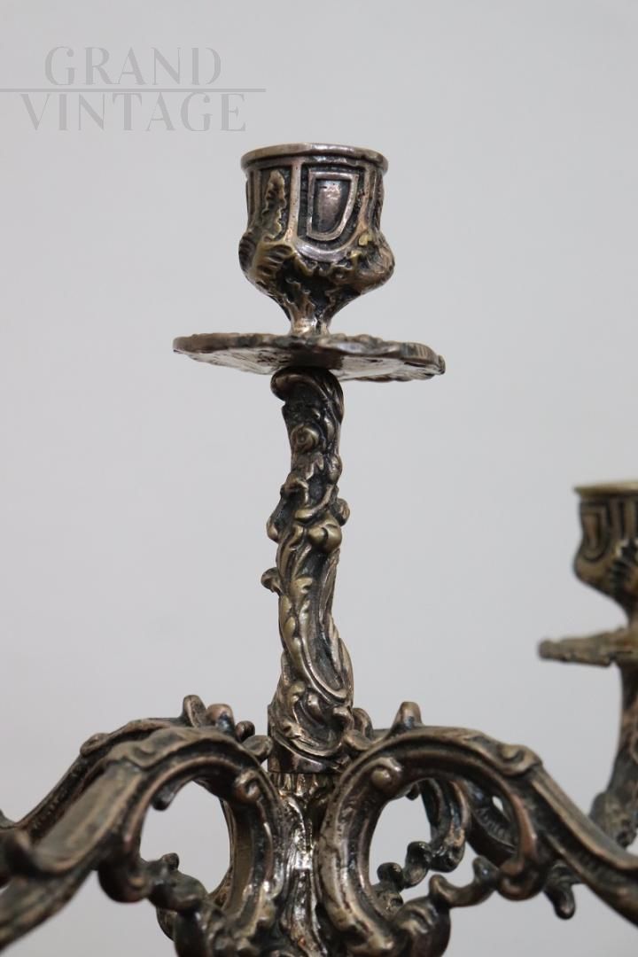 Exquisite 5-arm silver-plated metal candlesticks, made in Italy in the second half of the 20th century, embody timeless elegance. Their classic design features intricate curls and volutes, reminiscent of antique styles, adding a rich decorative touch. With their five arms, they create a remarkable and refined visual impact, making them perfect for enhancing traditional or antique furnishings. The silver-plated surface has developed a beautiful patina over time that enhances its charm and vintage character. Price negotiable.
